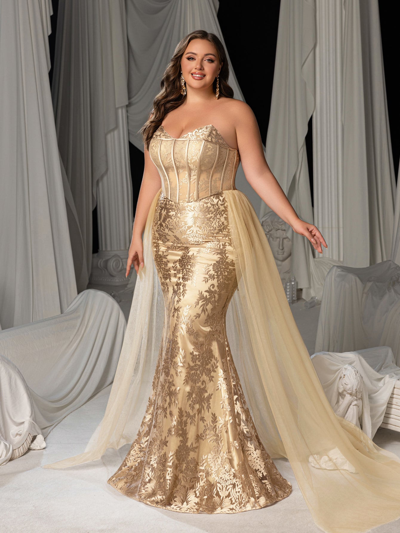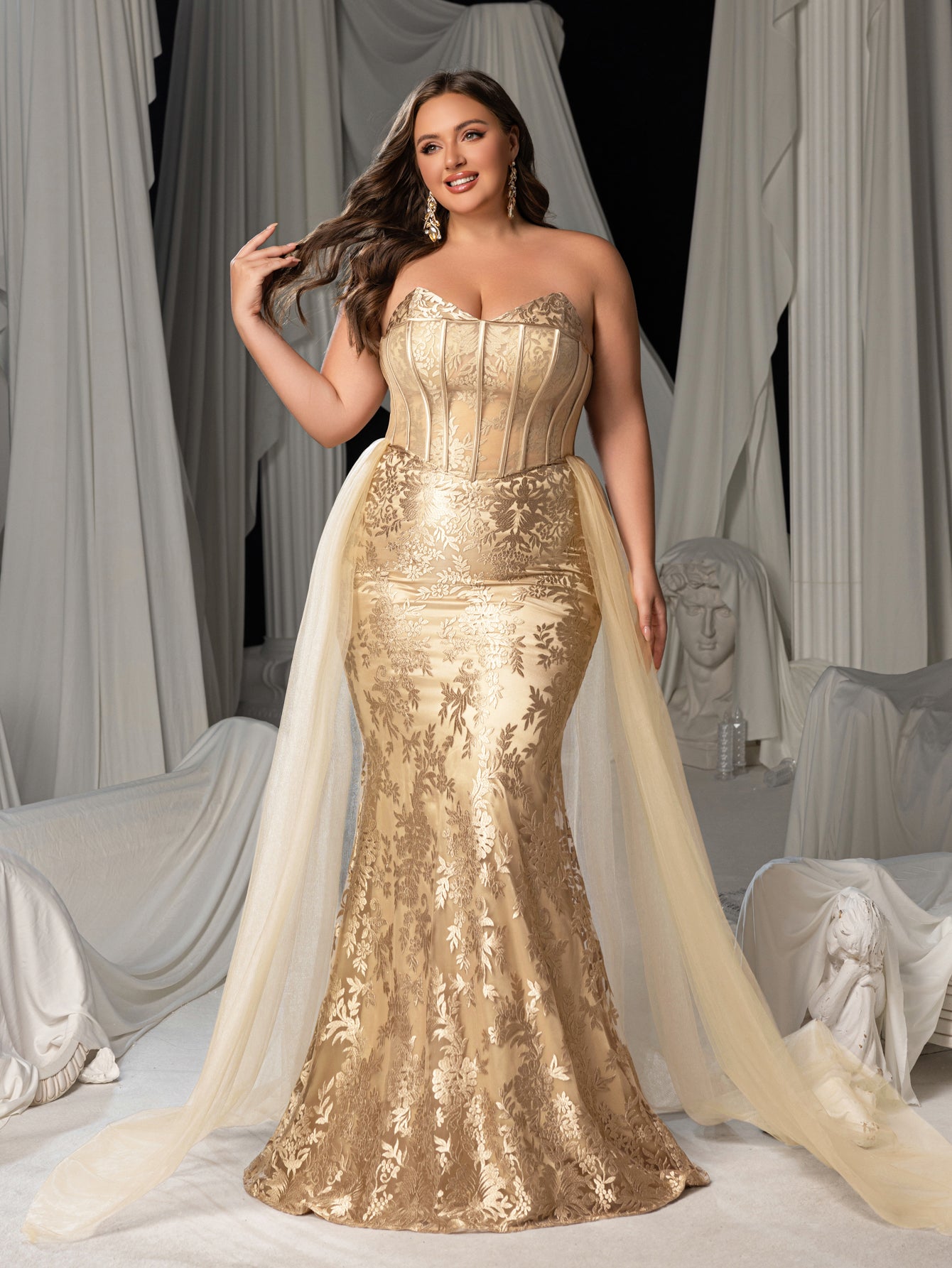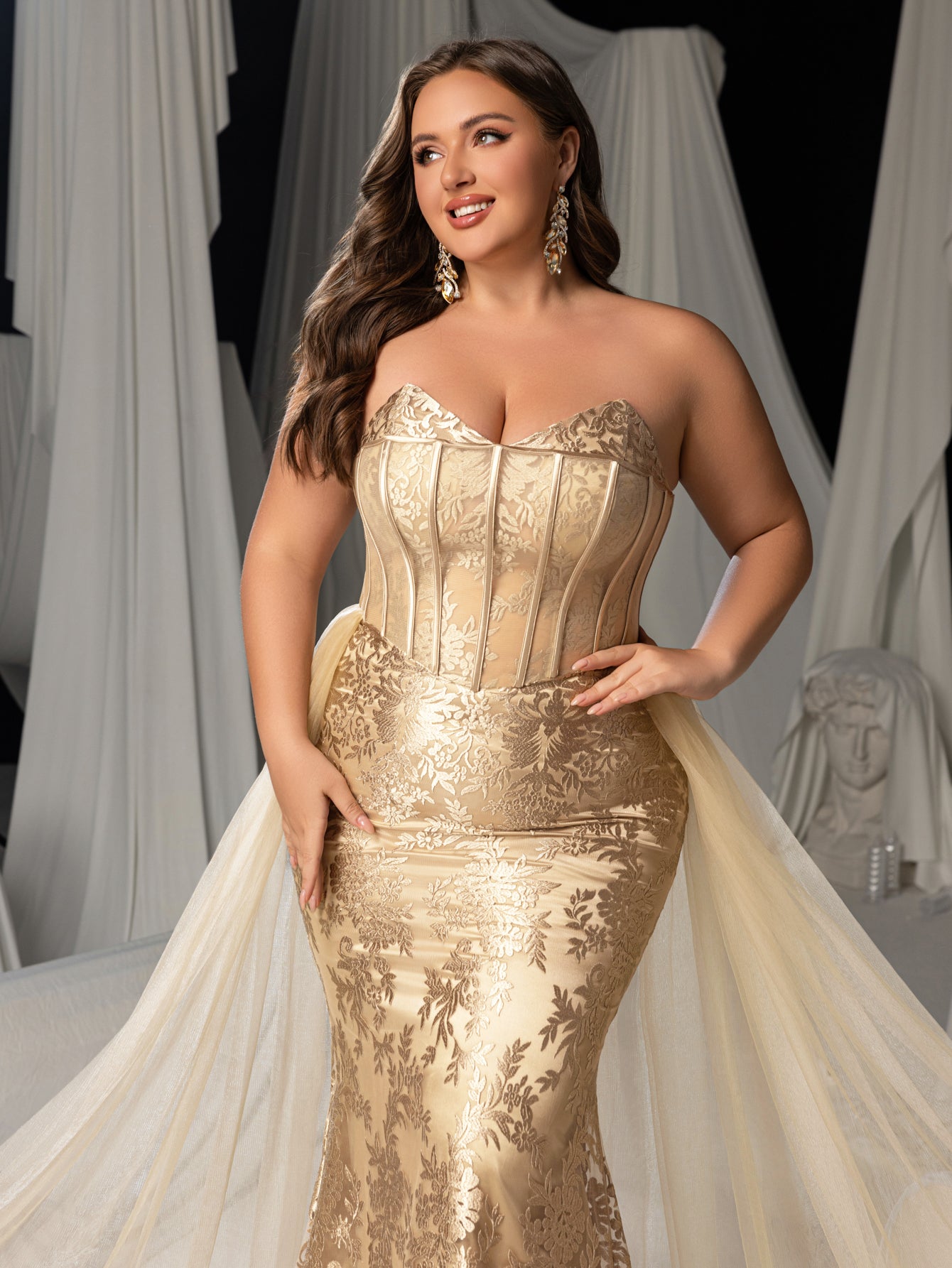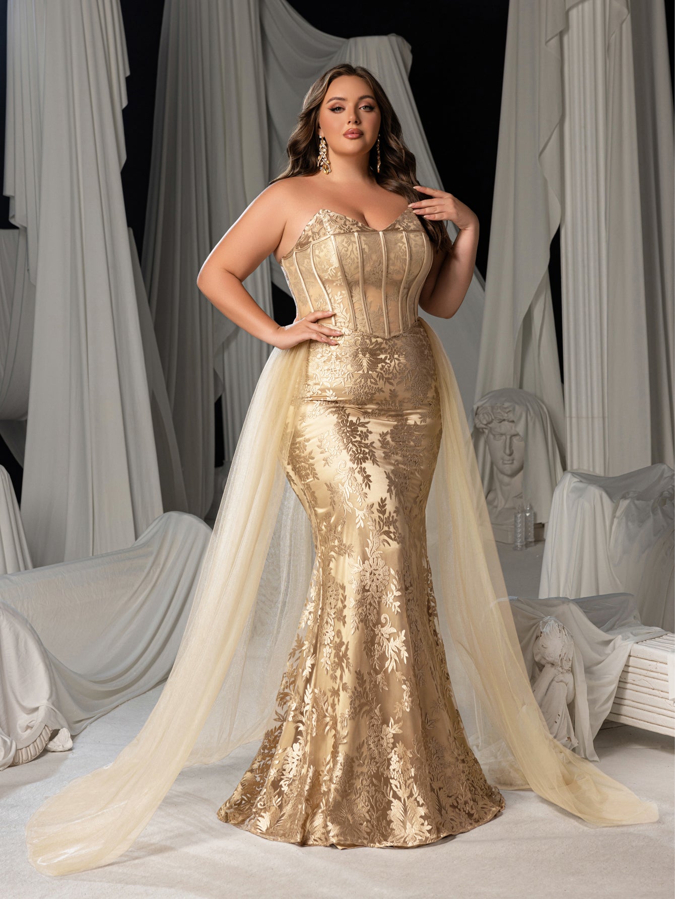 Plus Luxury Embroidered Mermaid Gown with Flowing Veil – Elegant Satin Bridal Attire for Weddings, Red Carpet & Formal Galas, 1XL-3XL