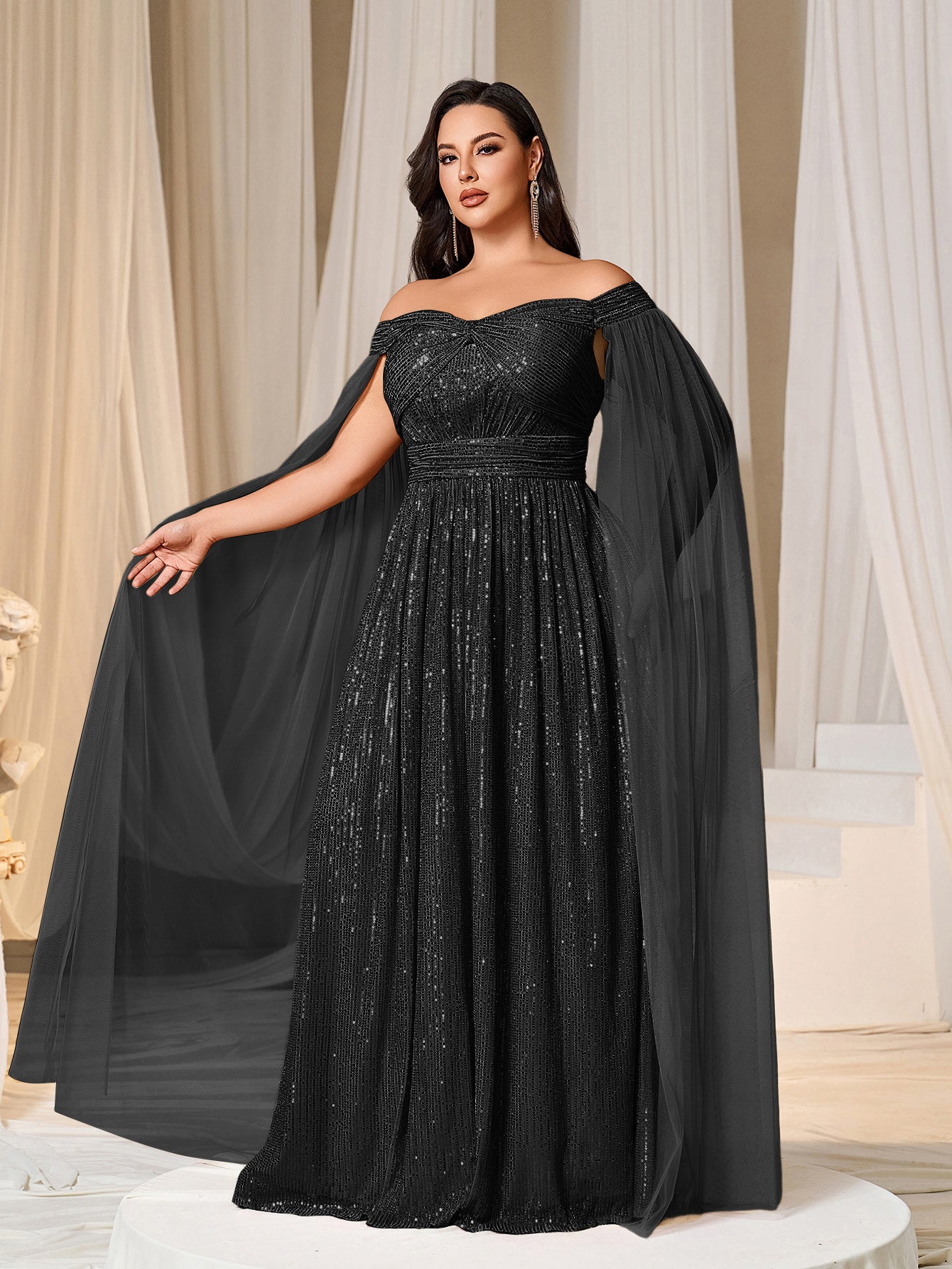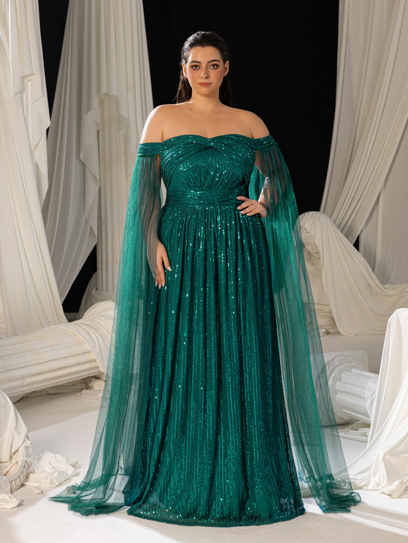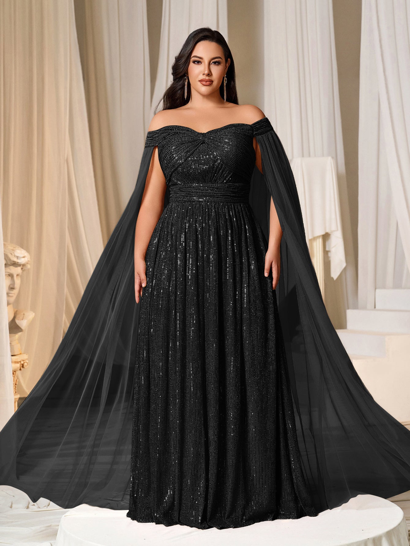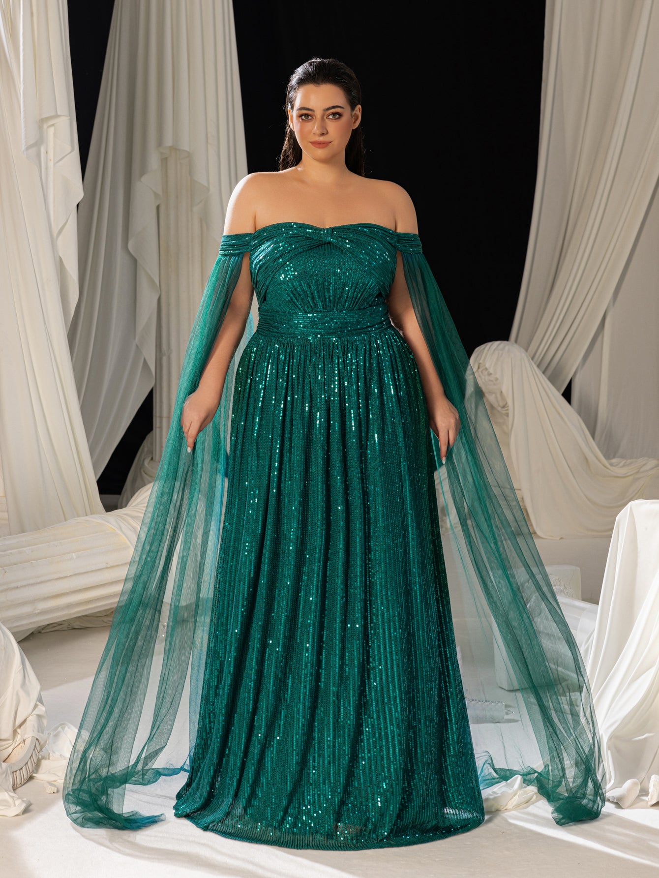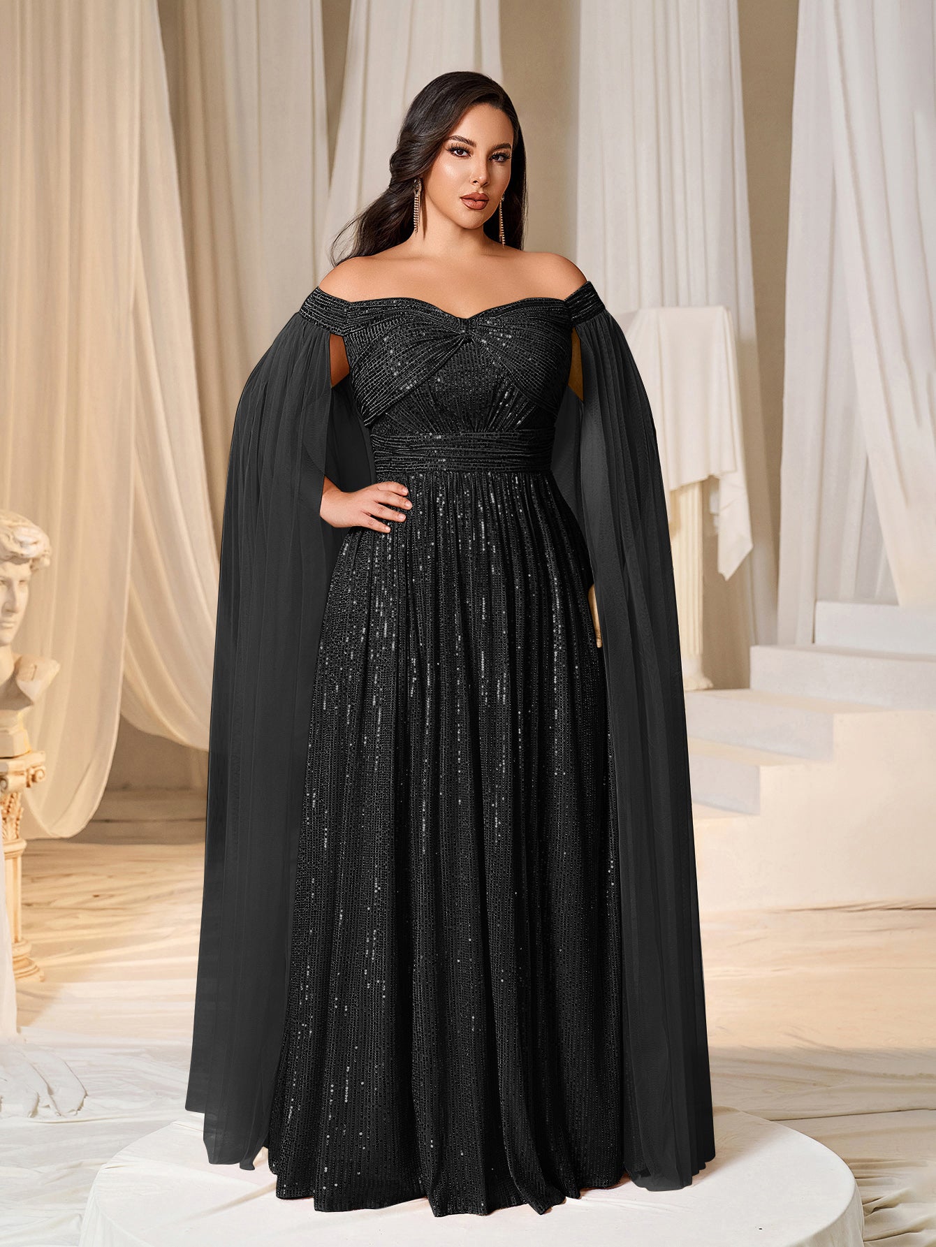 Plus Off-Shoulder Sequined Gown with Flowing Cape – Luxury Evening Wear for Weddings or Red Carpet Events, 1XL-5XL