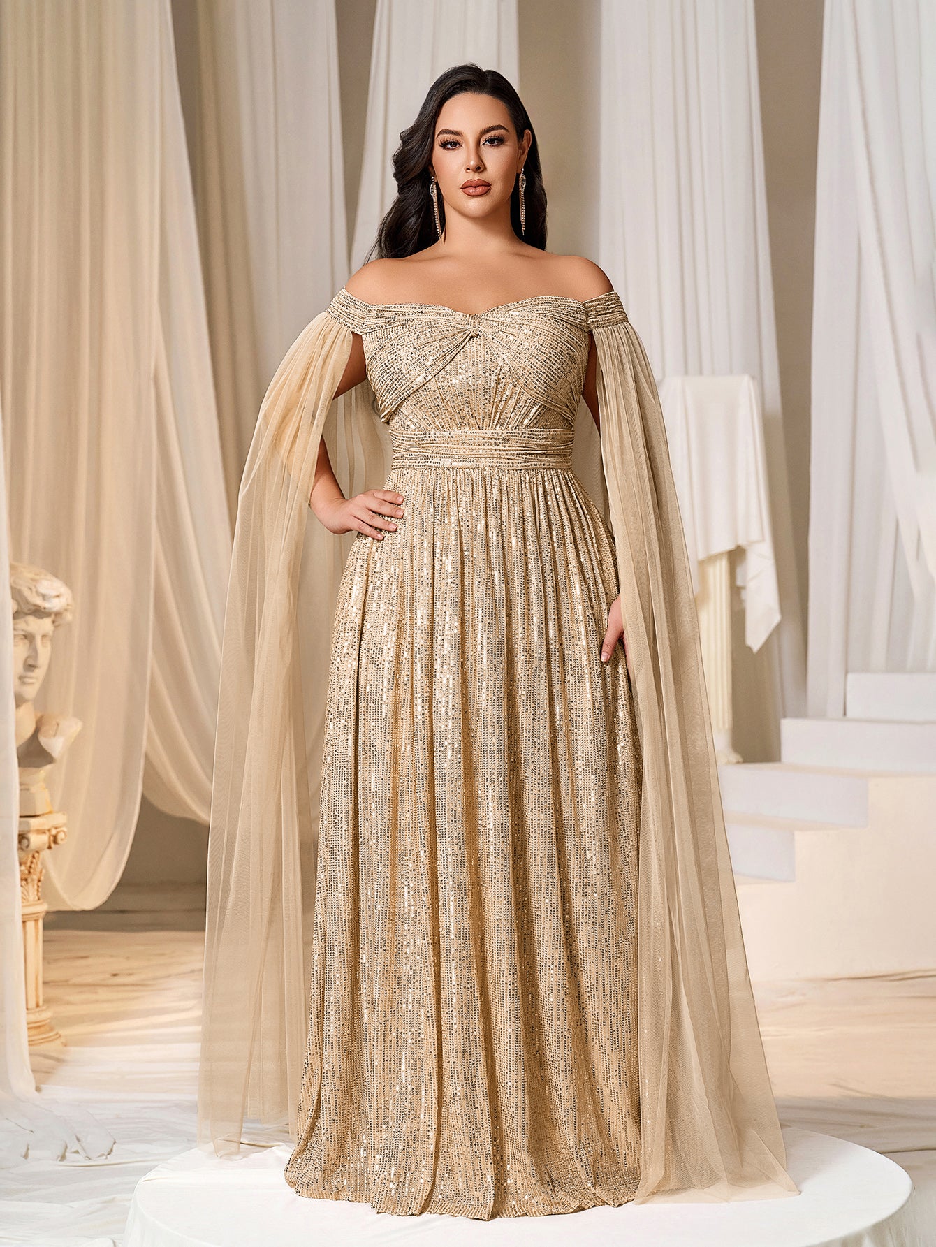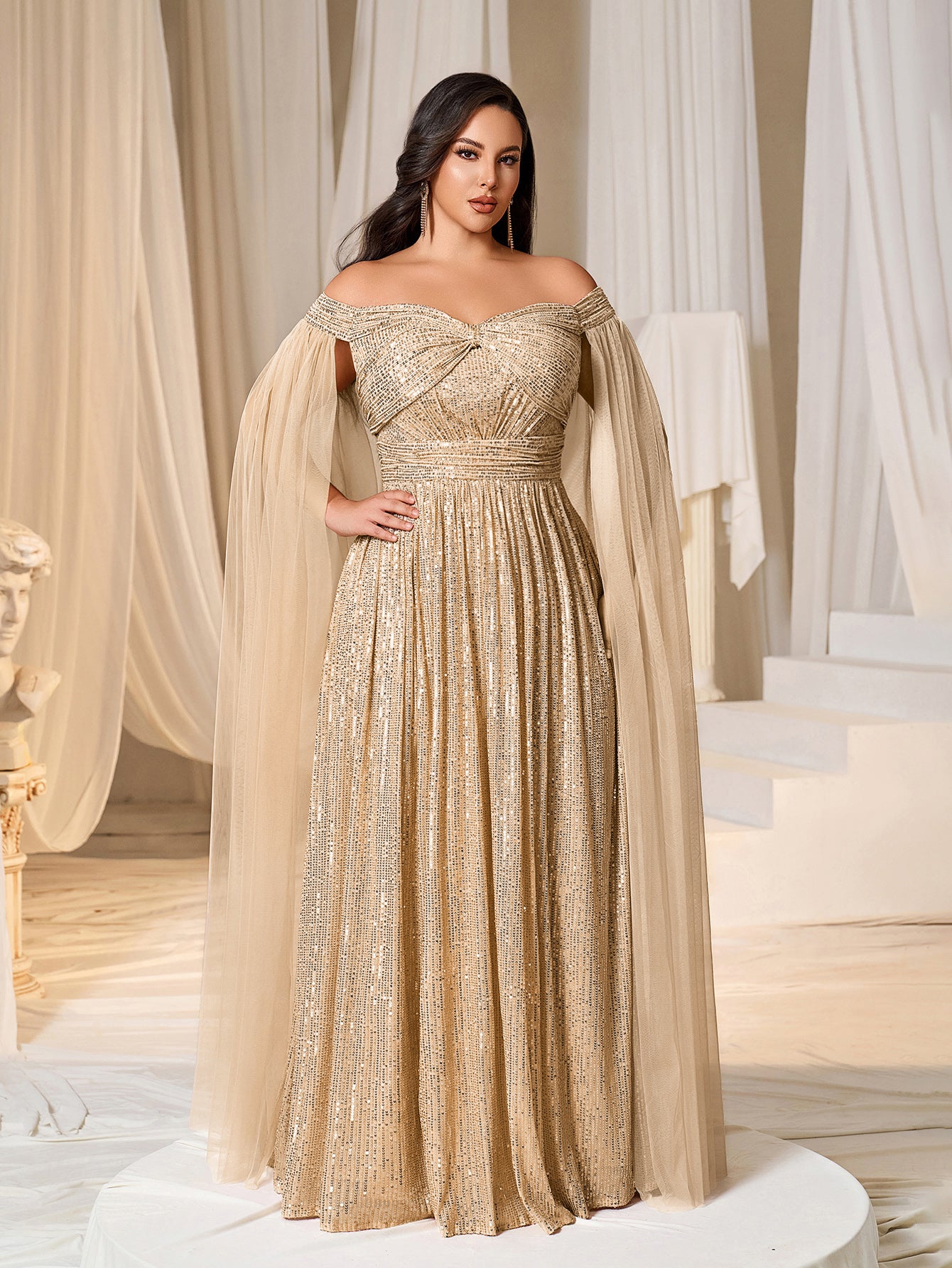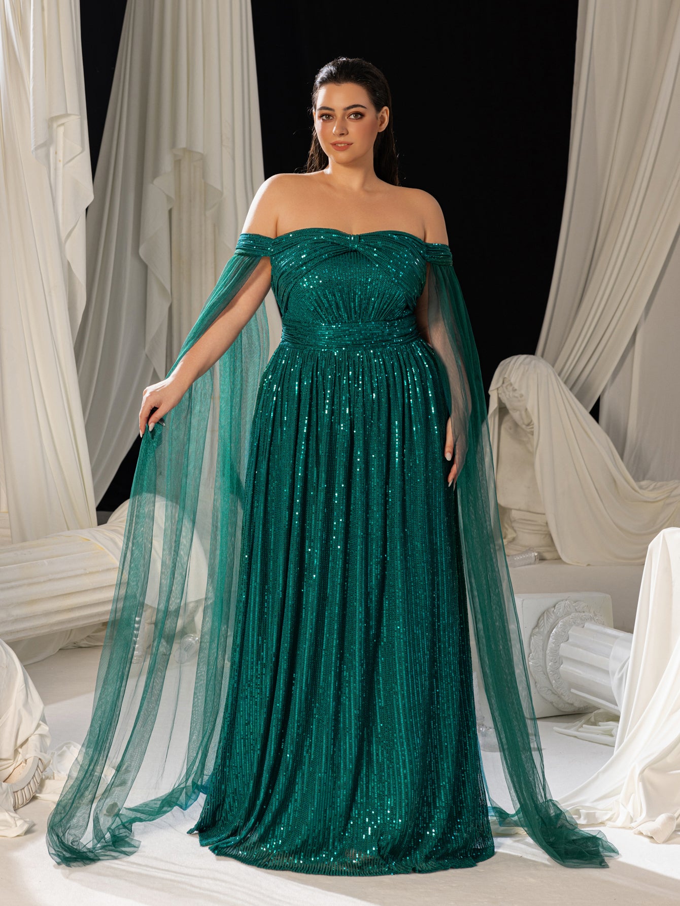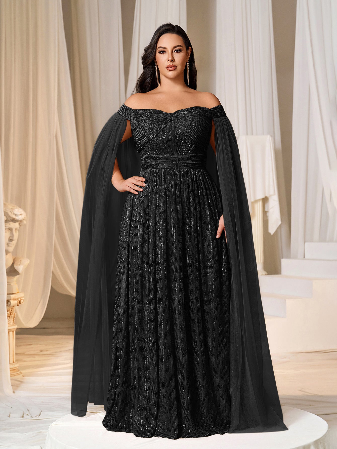 Plus Off-Shoulder Sequined Gown with Flowing Cape – Luxury Evening Wear for Weddings or Red Carpet Events, 1XL-5XL