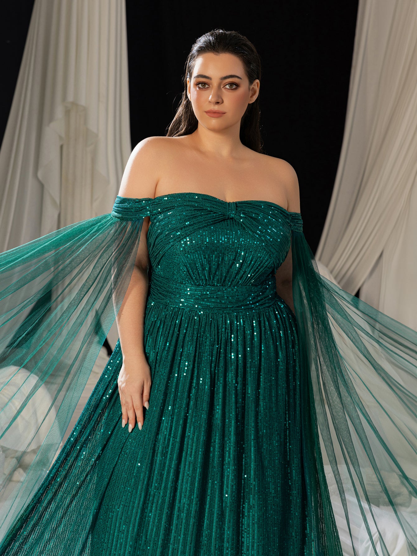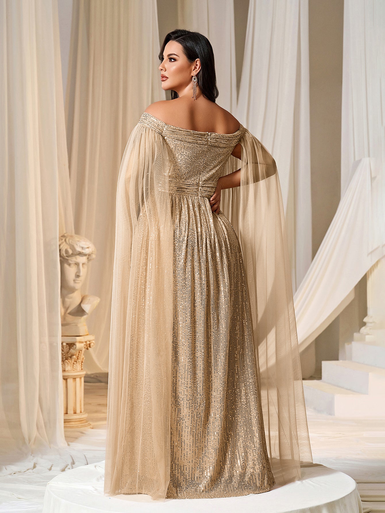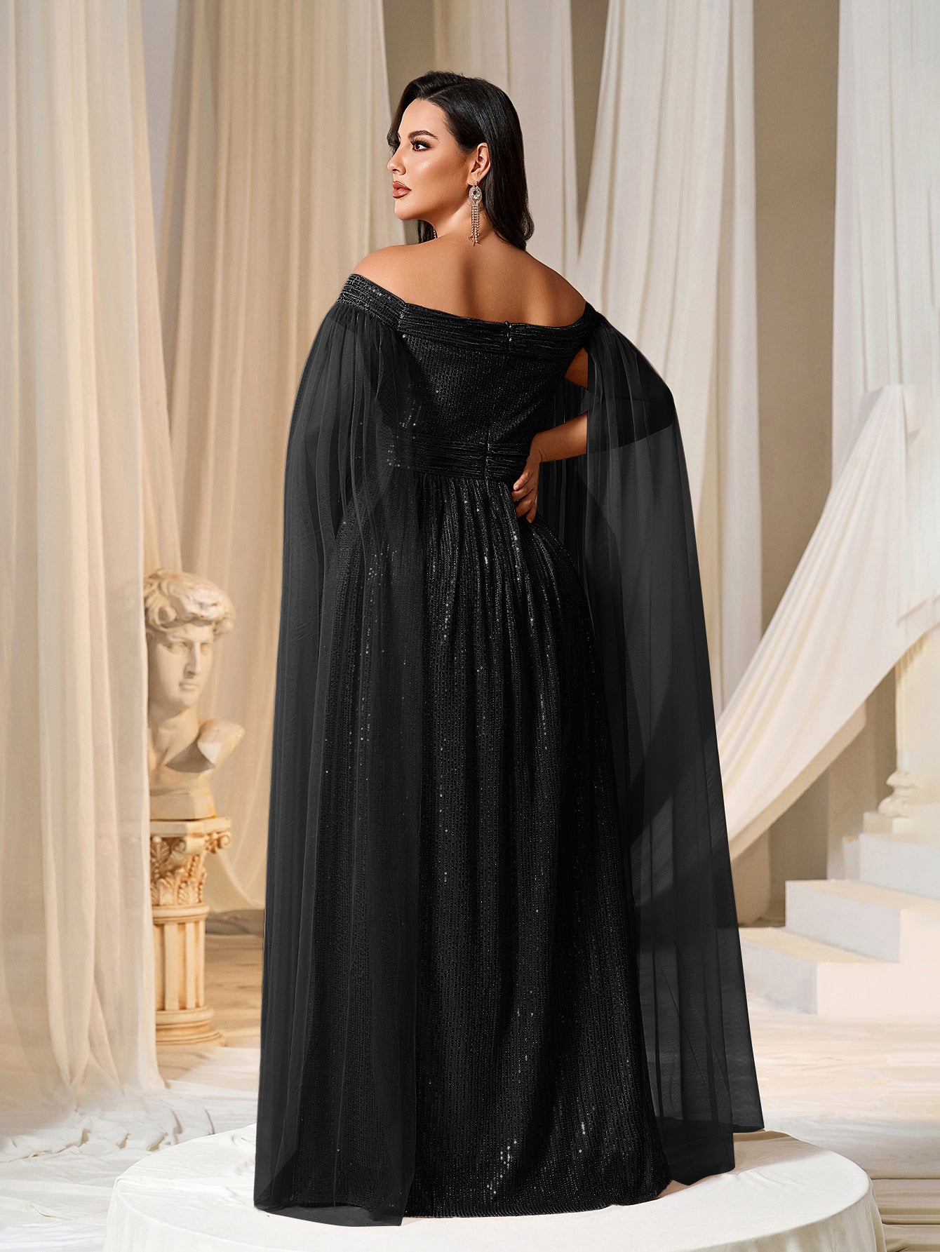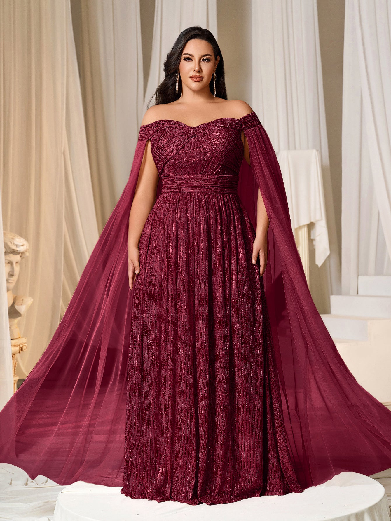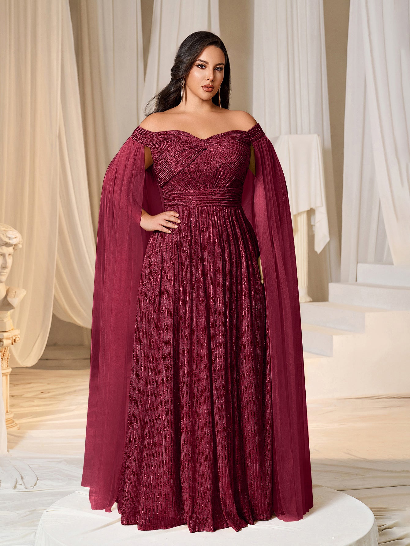 Plus Off-Shoulder Sequined Gown with Flowing Cape – Luxury Evening Wear for Weddings or Red Carpet Events, 1XL-5XL