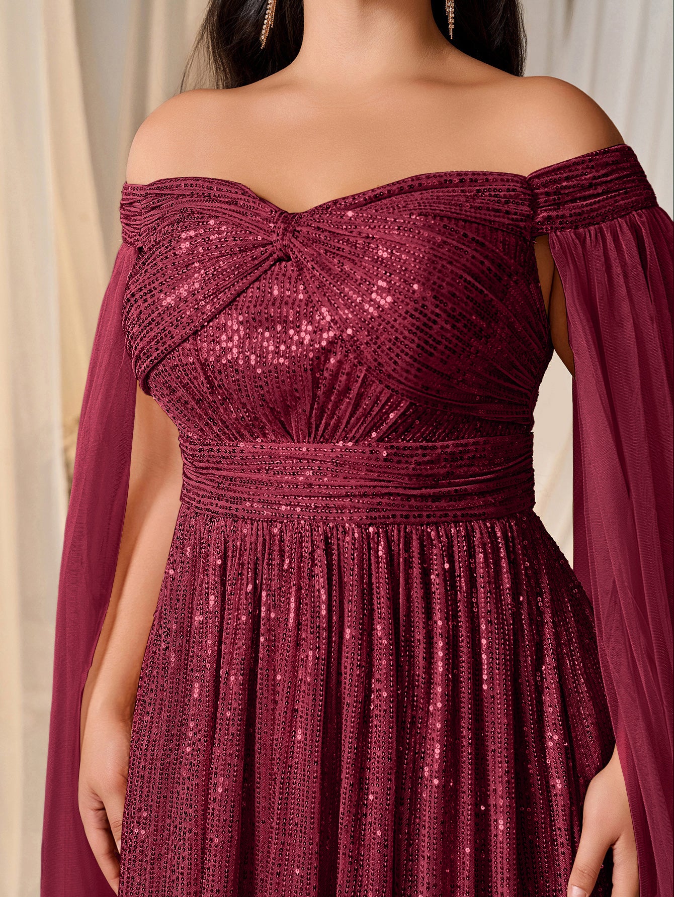 ✔️ Contrast: Neutral tones highlight the sequins’ shimmer, while the sheer cape adds a soft, romantic layer.