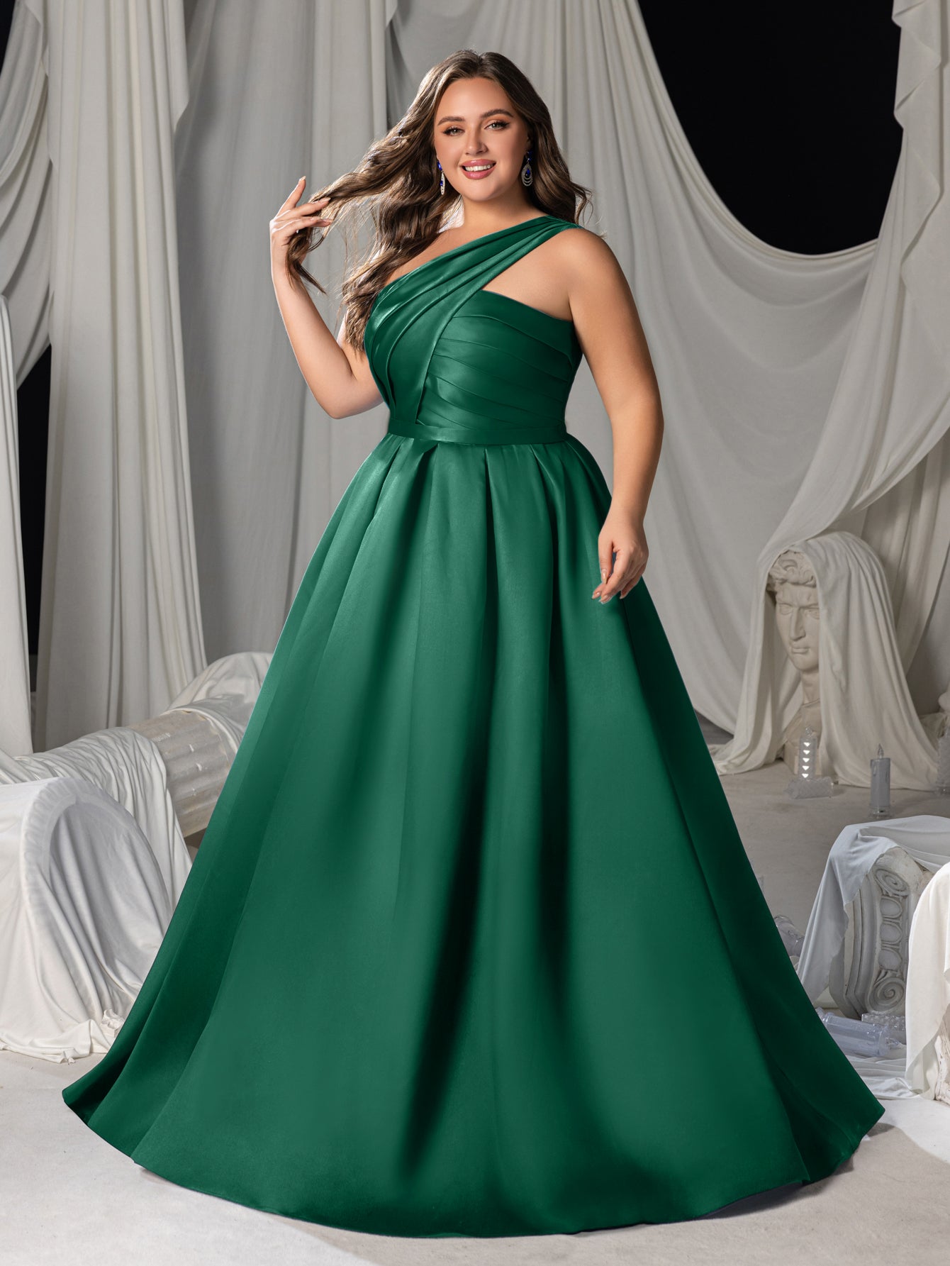 Plus One-Shoulder Satin Gown with Pleated Shoulders, Crisscross Back Straps & Floor-Length Skirt