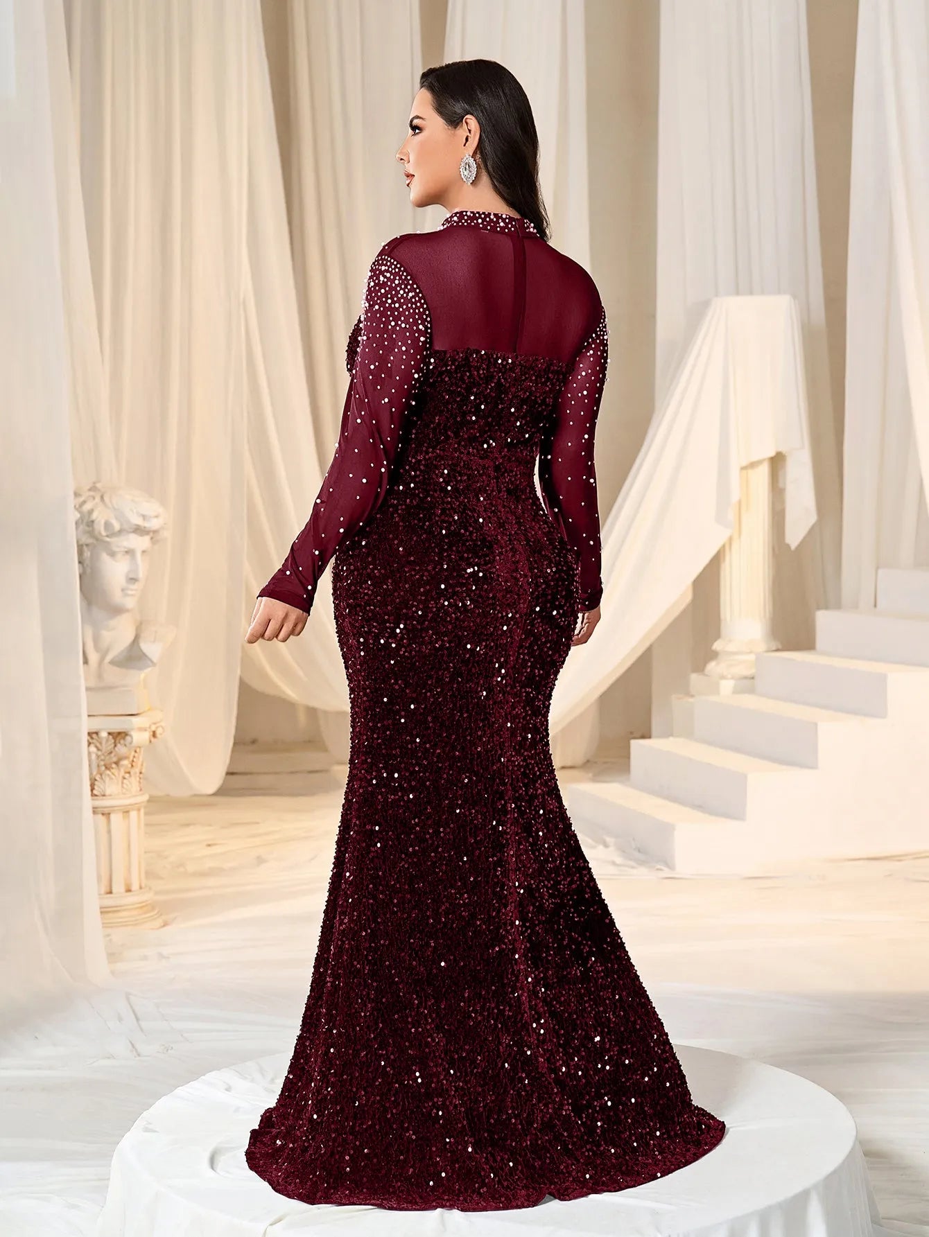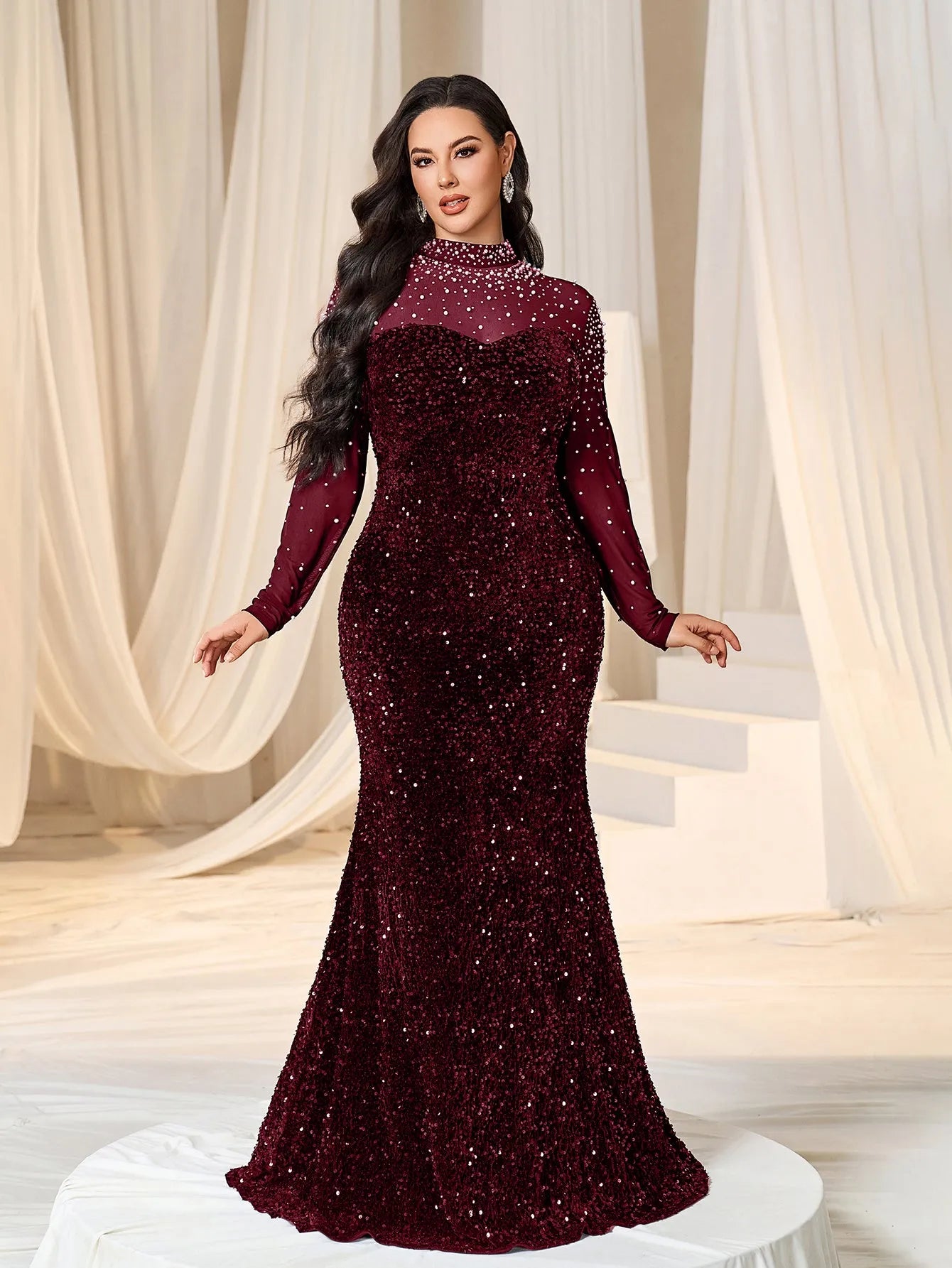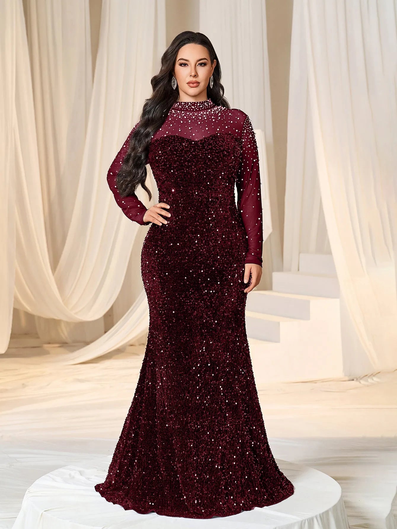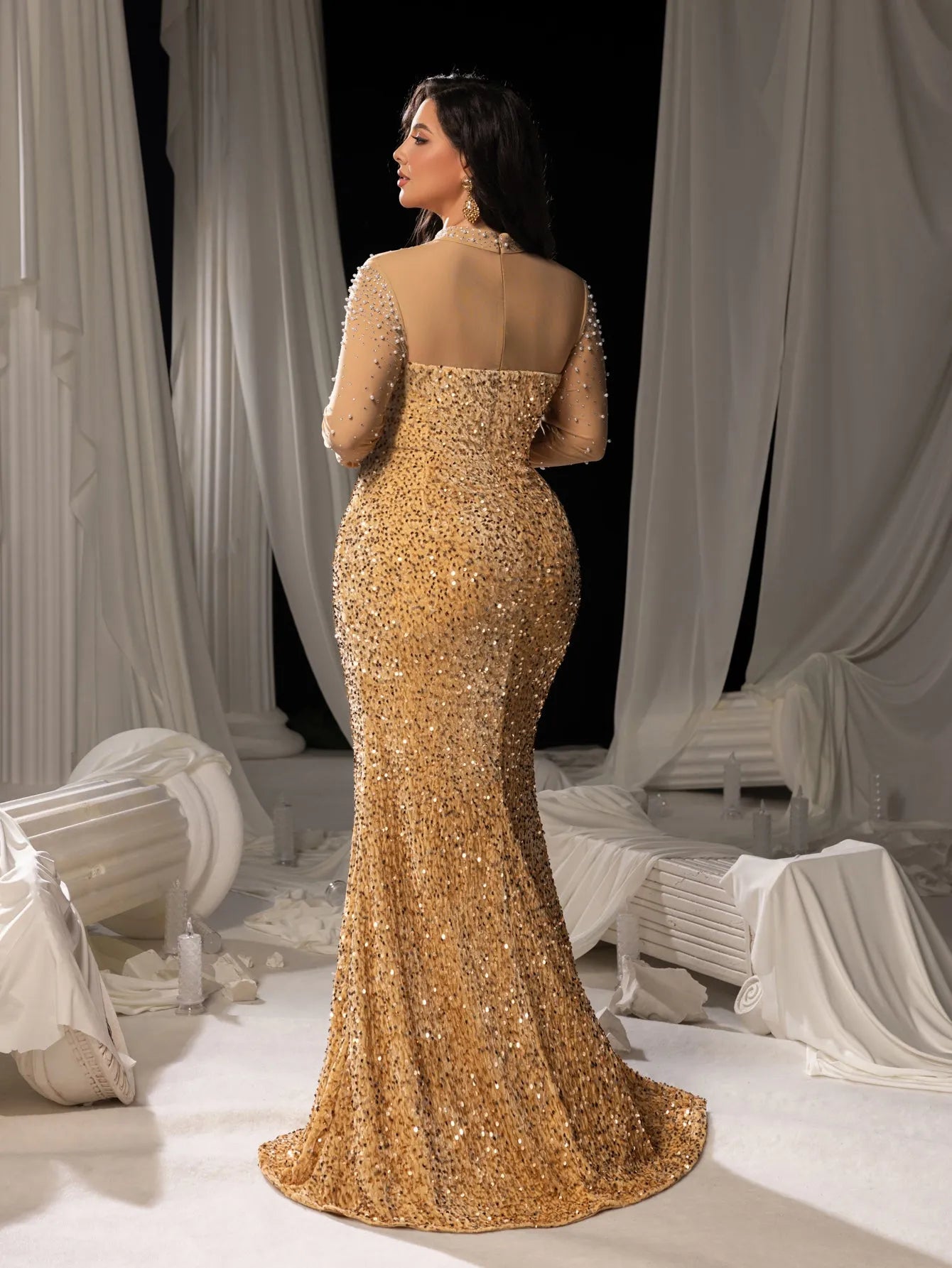 Embrace elegance and sophistication in this stunning sequin gown with delicate pearl embellishments. The mock neck design adds a regal touch, while the illusion mesh sleeves adorned with pearls elevate the overall charm. This floor-length mermaid silhouette is perfect for making a grand entrance at any formal event. The dress is fully lined with shimmering sequins that catch the light, ensuring you sparkle all night long.