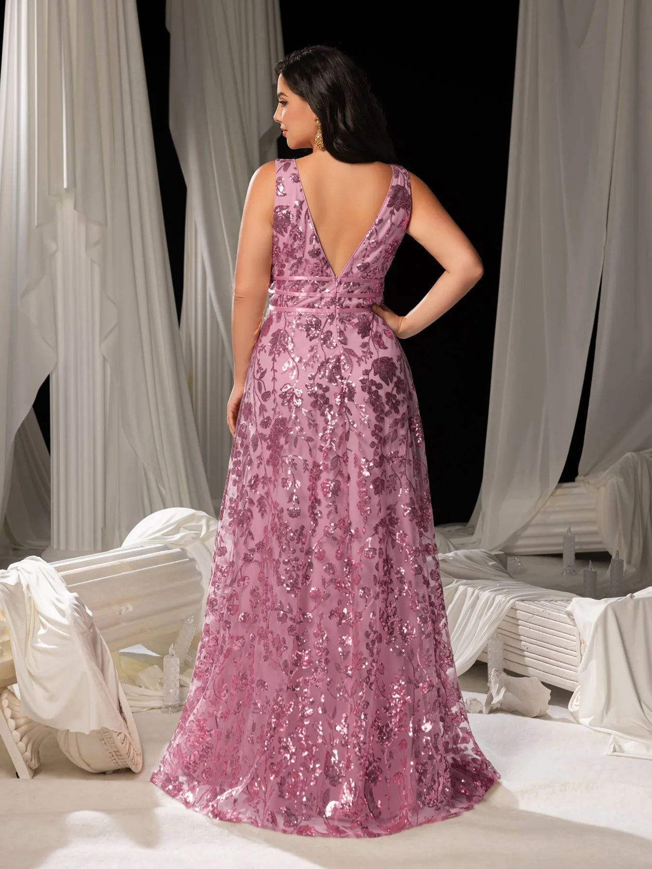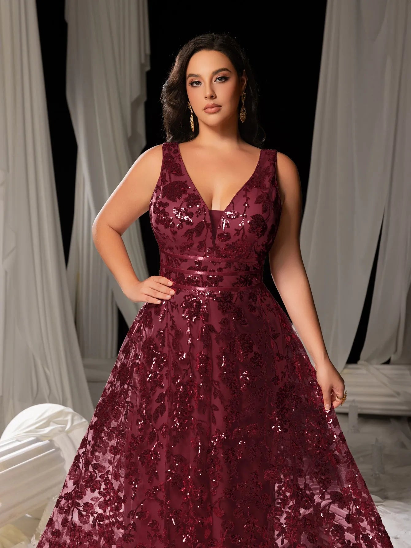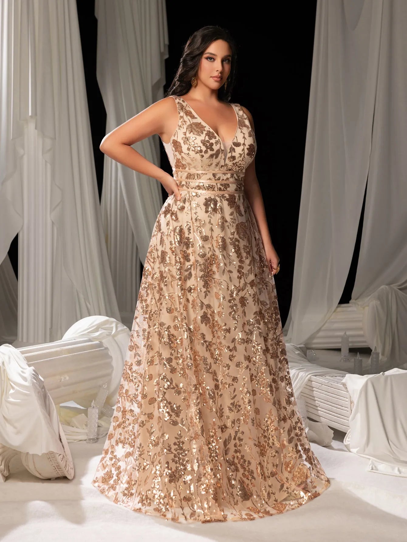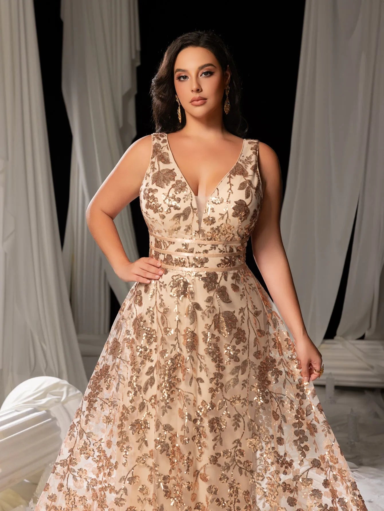 Command attention in this stunning floral sequin gown, a perfect combination of elegance and sophistication. Featuring a deep V-neckline and wide straps, this gown is beautifully adorned with floral sequin detailing that catches the light with every movement. The floor-length A-line skirt offers a classic silhouette, while the deep V-back adds a modern and sultry touch.