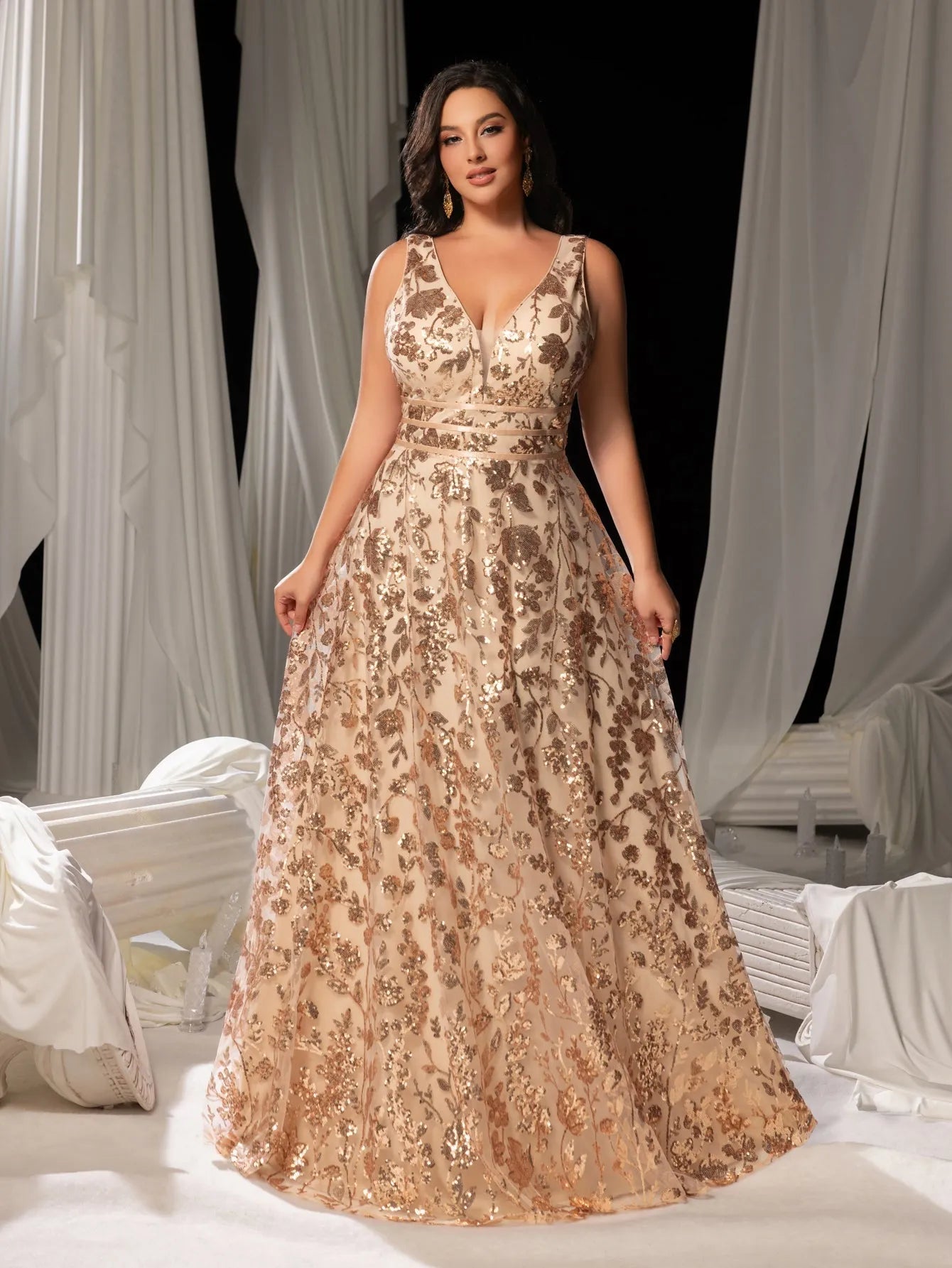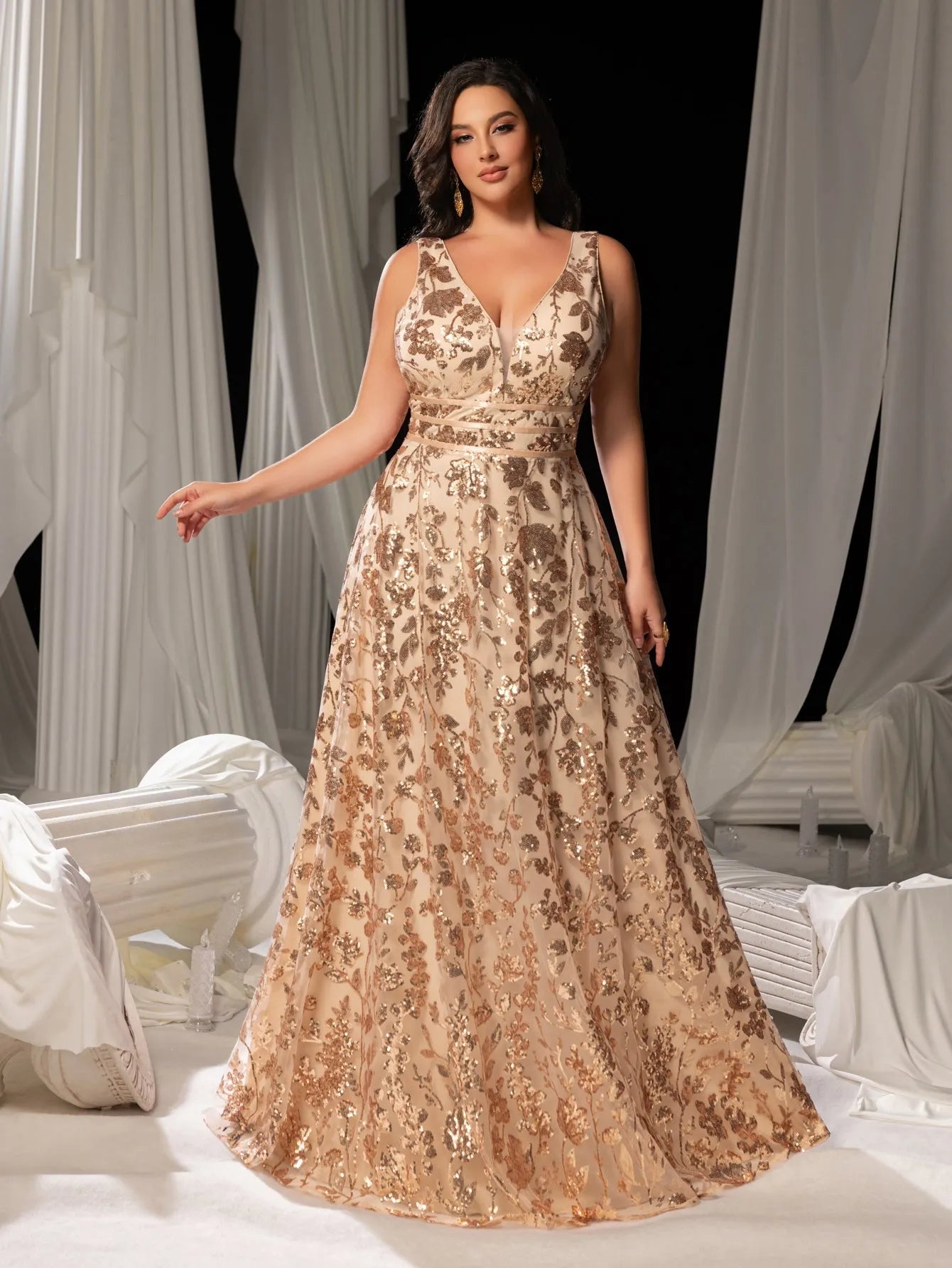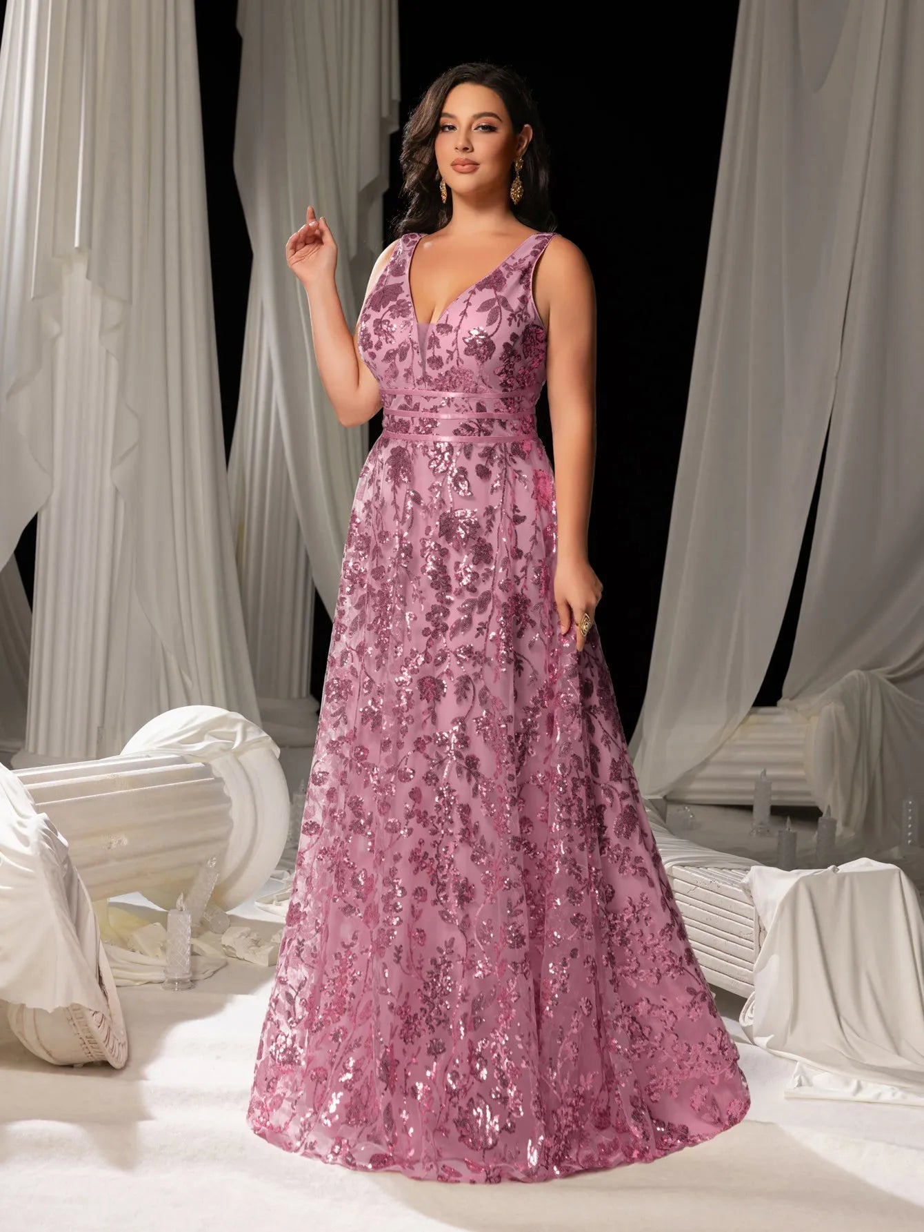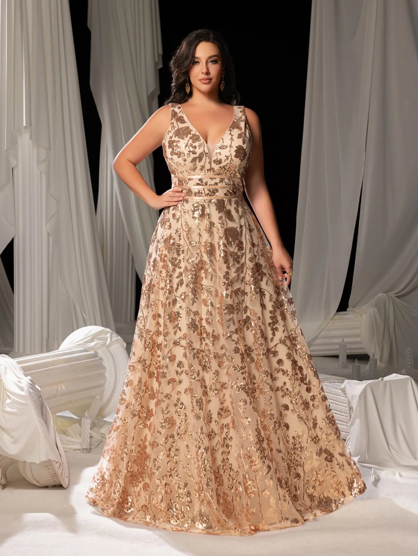 Command attention in this stunning floral sequin gown, a perfect combination of elegance and sophistication. Featuring a deep V-neckline and wide straps, this gown is beautifully adorned with floral sequin detailing that catches the light with every movement. The floor-length A-line skirt offers a classic silhouette, while the deep V-back adds a modern and sultry touch.