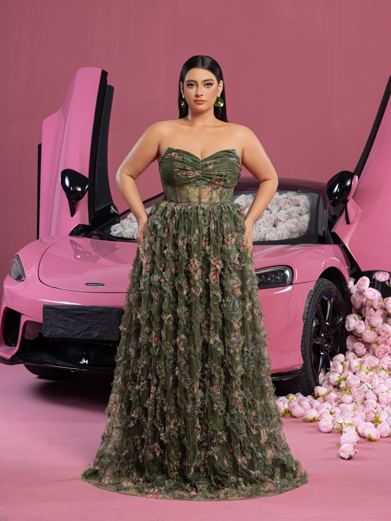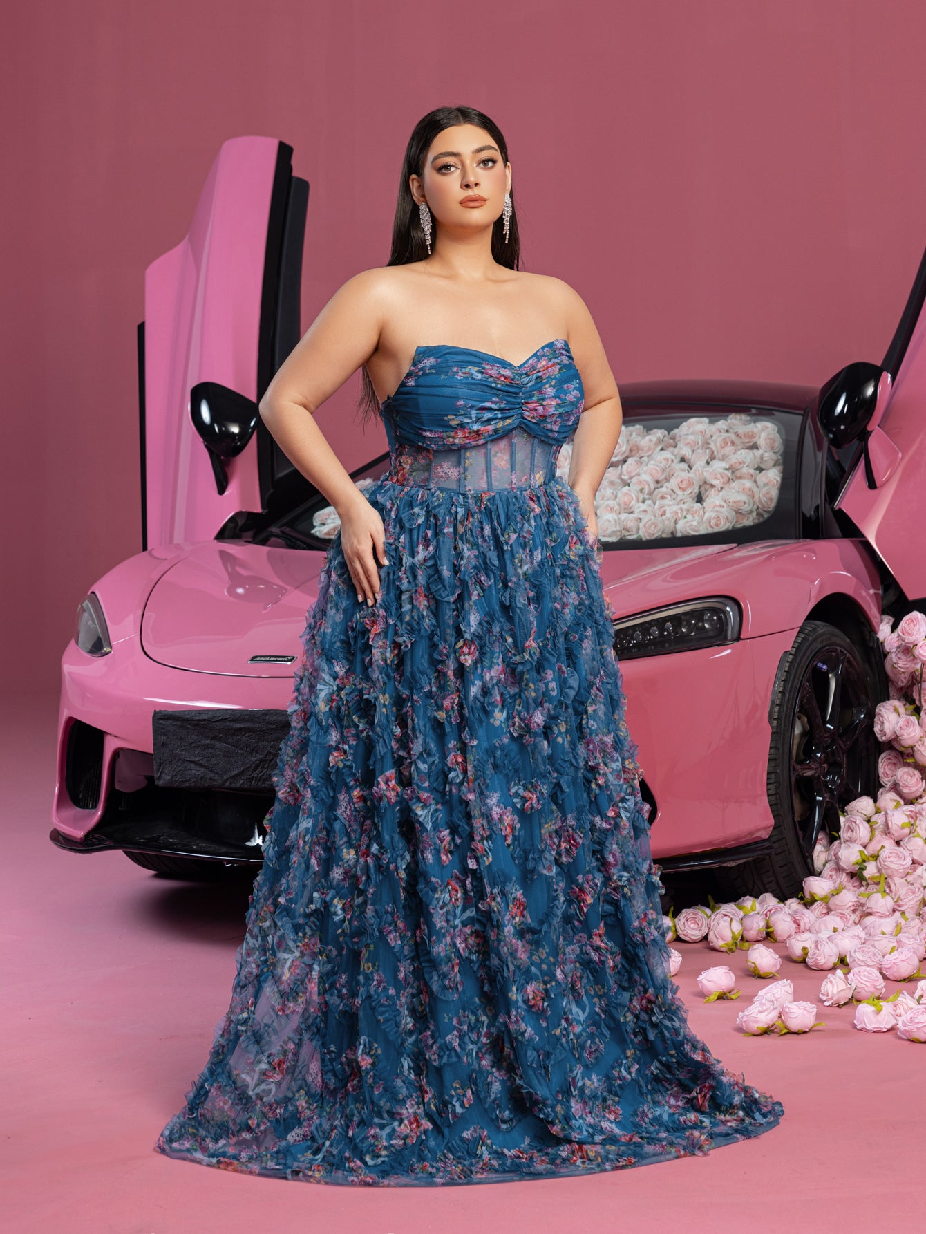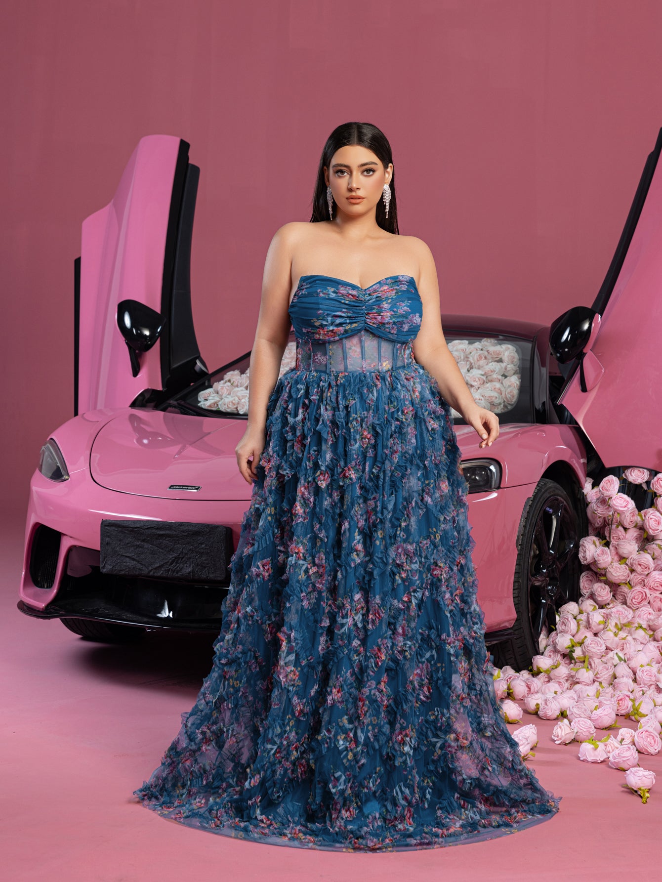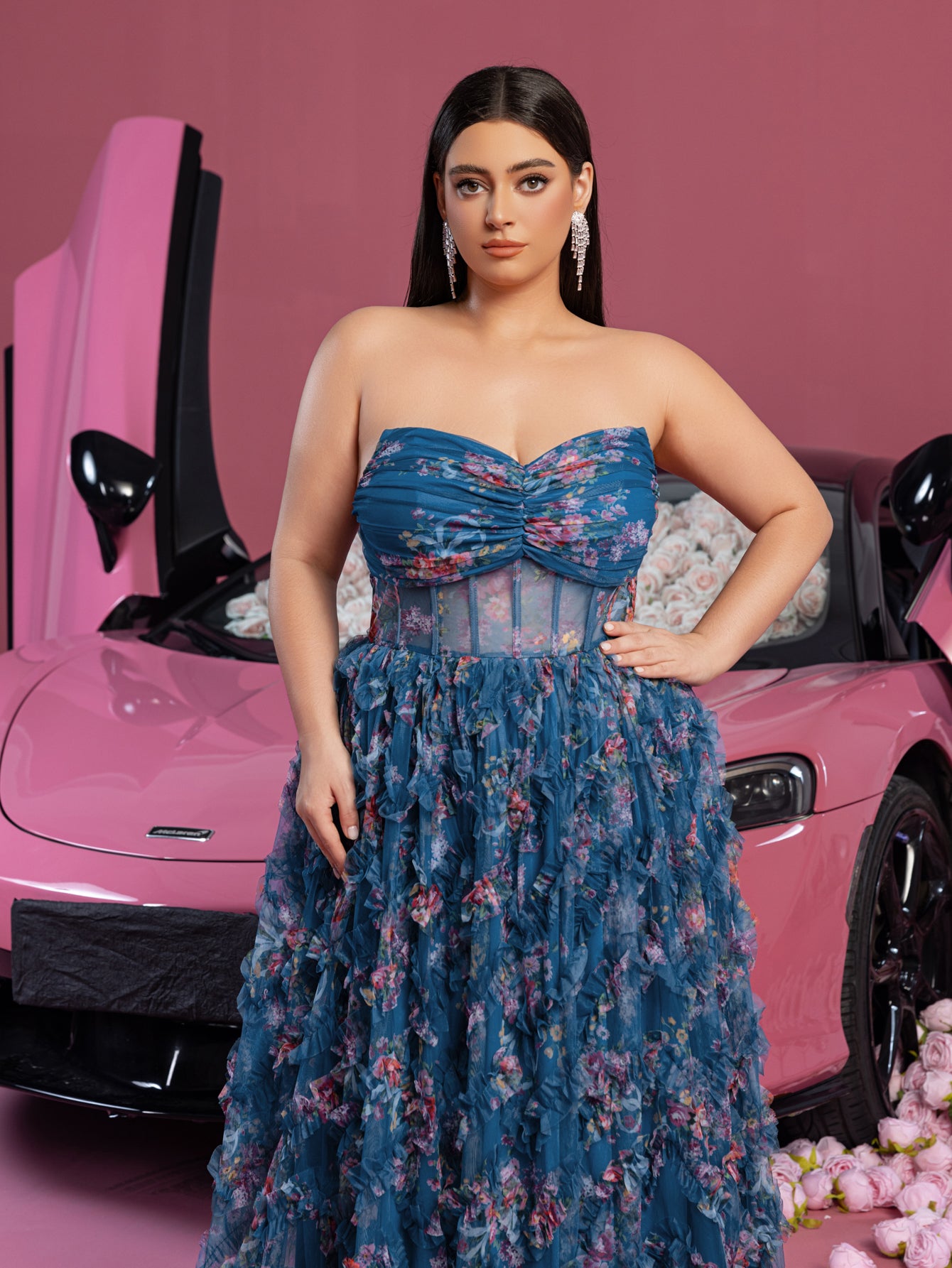 Turn heads at your next event with this luxurious floral printed tulle evening gown. Designed for those who love to make a statement, this dress features a strapless sweetheart neckline and a fitted bodice that beautifully accentuates your curves. The floor-length silhouette is enhanced with intricate floral prints and layered ruffles, adding a touch of modern sophistication. The sheer bodice with boning details provides a romantic and elegant look, perfect for galas, weddings, or any special occasion. This gown combines classic glamour with contemporary style.