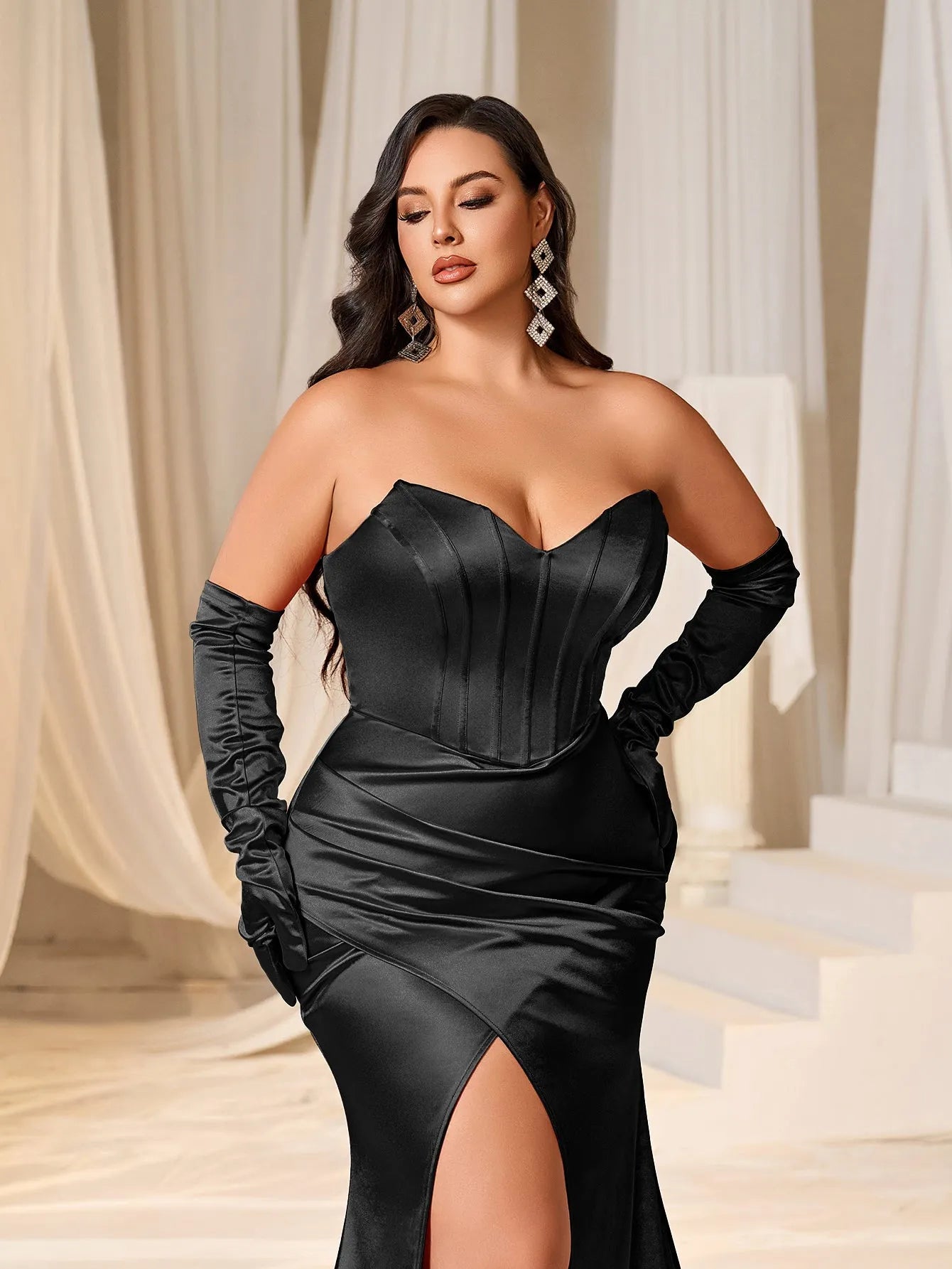 Turn heads with this ravishing satin gown, designed for ultimate glamour and confidence. The gown features a corset-style bodice that accentuates your curves and a daring thigh-high slit for added allure. Complete with matching opera gloves, this ensemble is the epitome of old-Hollywood elegance. The fitted silhouette flows into a subtle train, creating a dramatic and timeless look.
