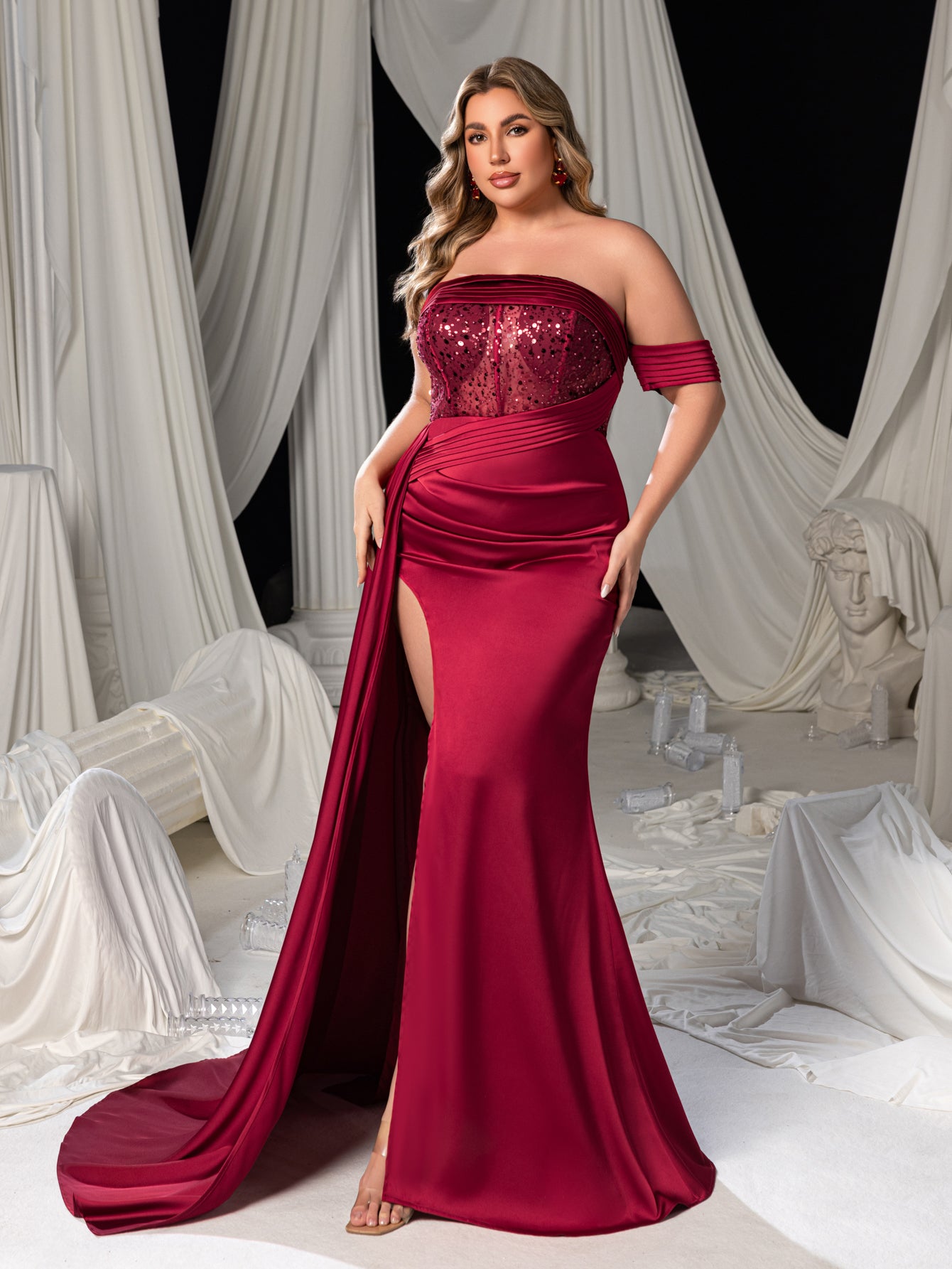 Plus Satin Red Carpet Gown with High Slit & Strapless Design – Luxurious Evening Wear for Formal Galas & Luxury Events, 1XL-3XL