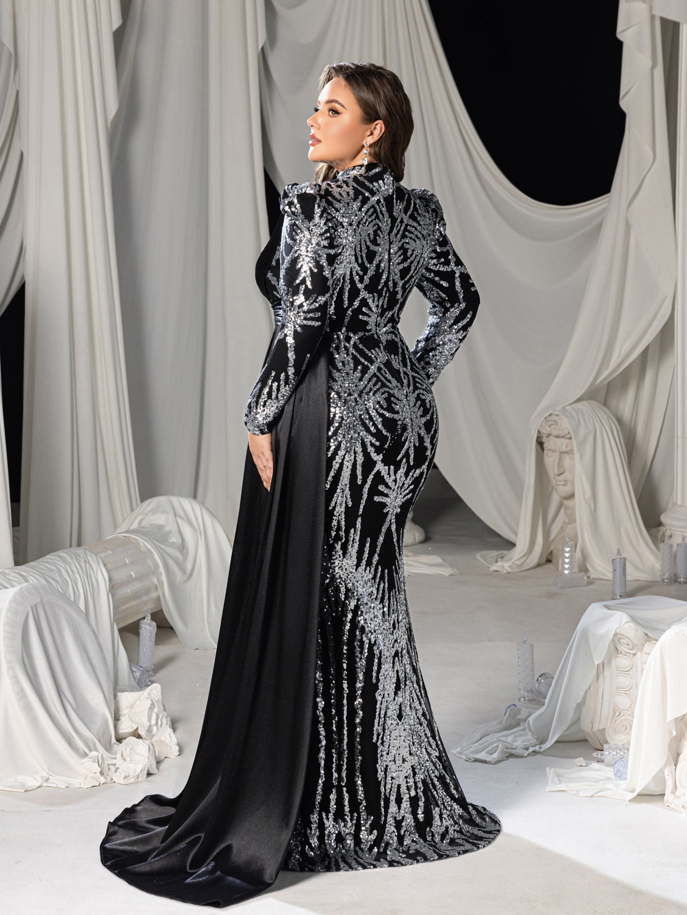 Plus Sequined High-Neck Long-Sleeve Mermaid Gown with Satin Drapes & Tail