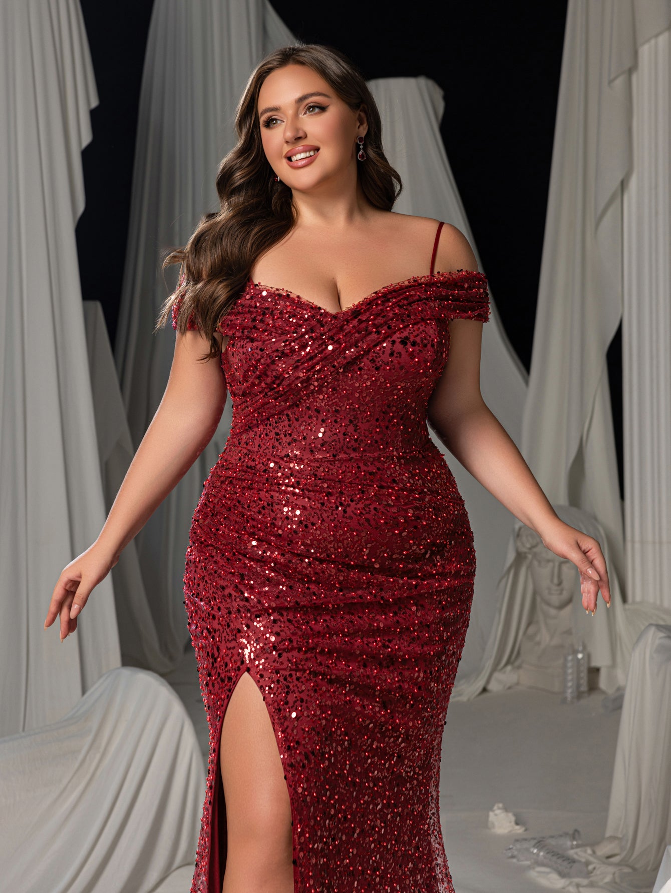 Plus Sequined Off-Shoulder Gown with High Slit – Luxury Evening Wear for Red Carpet, Gala Dinners & Formal Weddings, 1XL-5XL