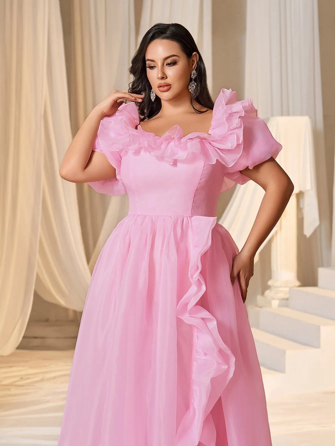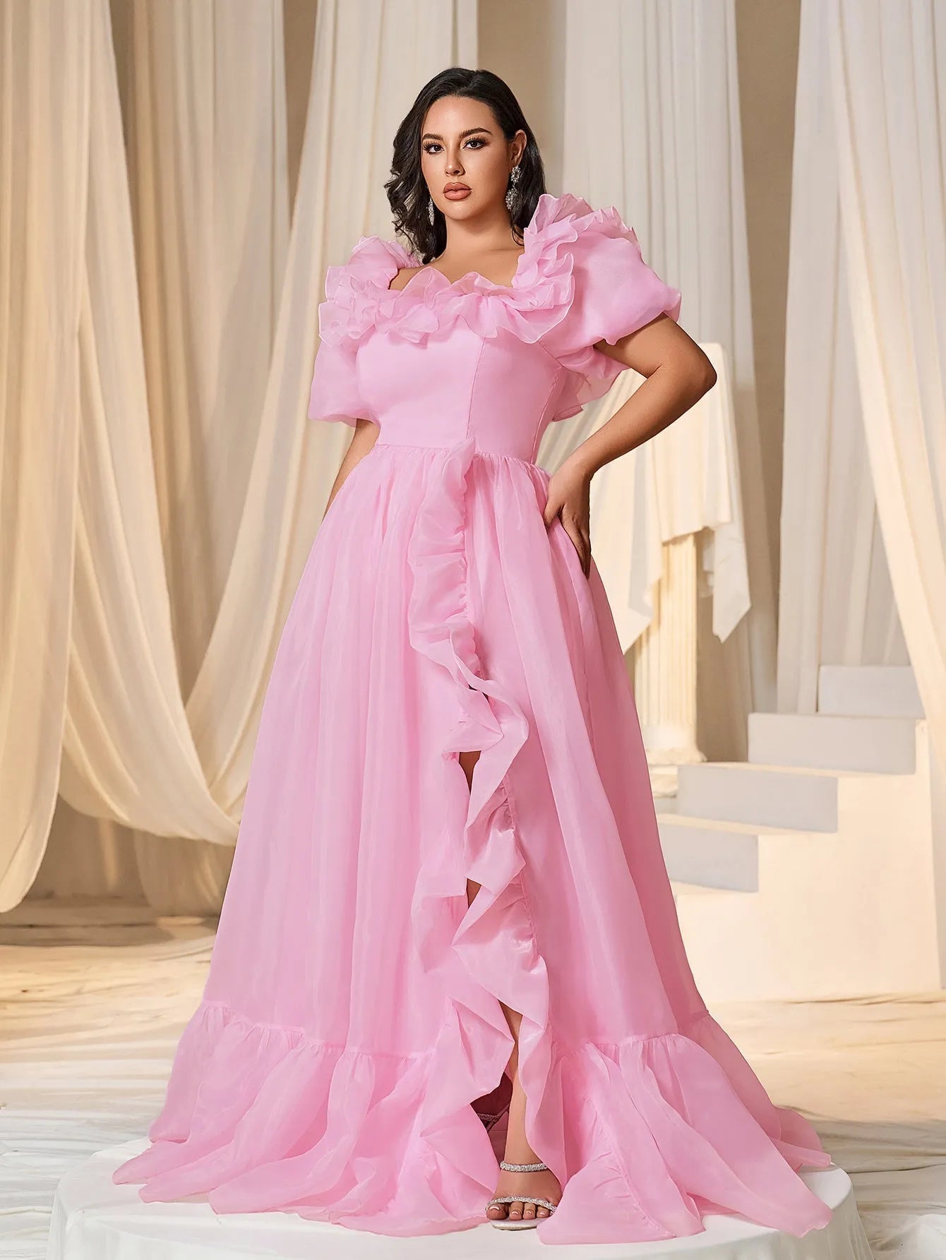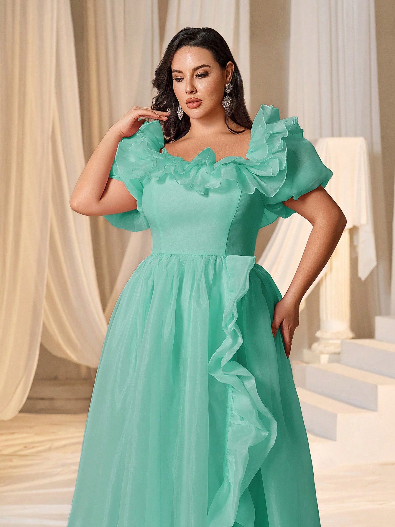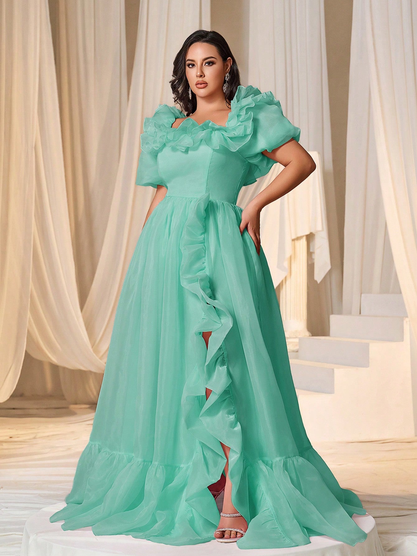 Plus Square Collar Ruffle Trim Puff Sleeves Organza Prom Dress