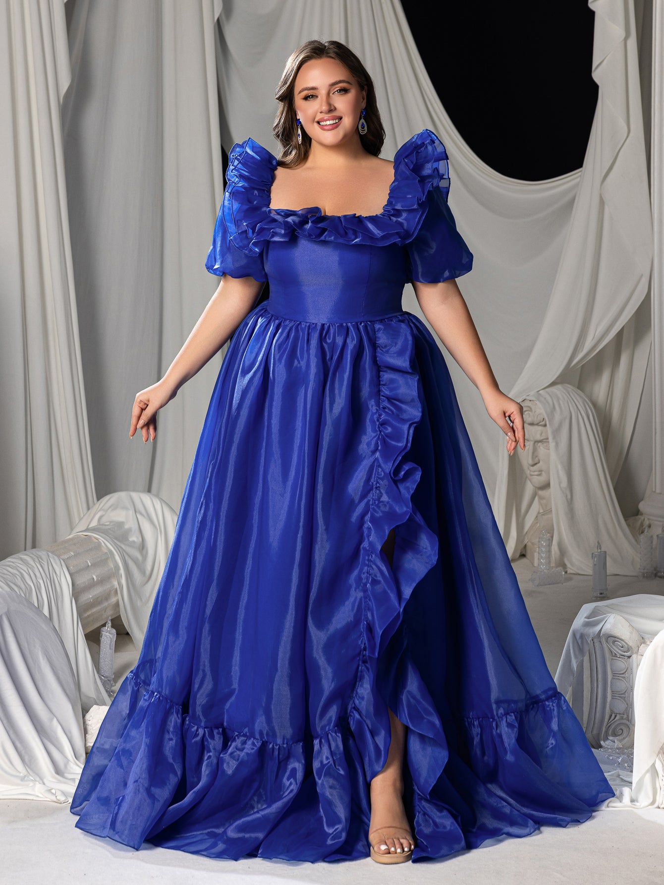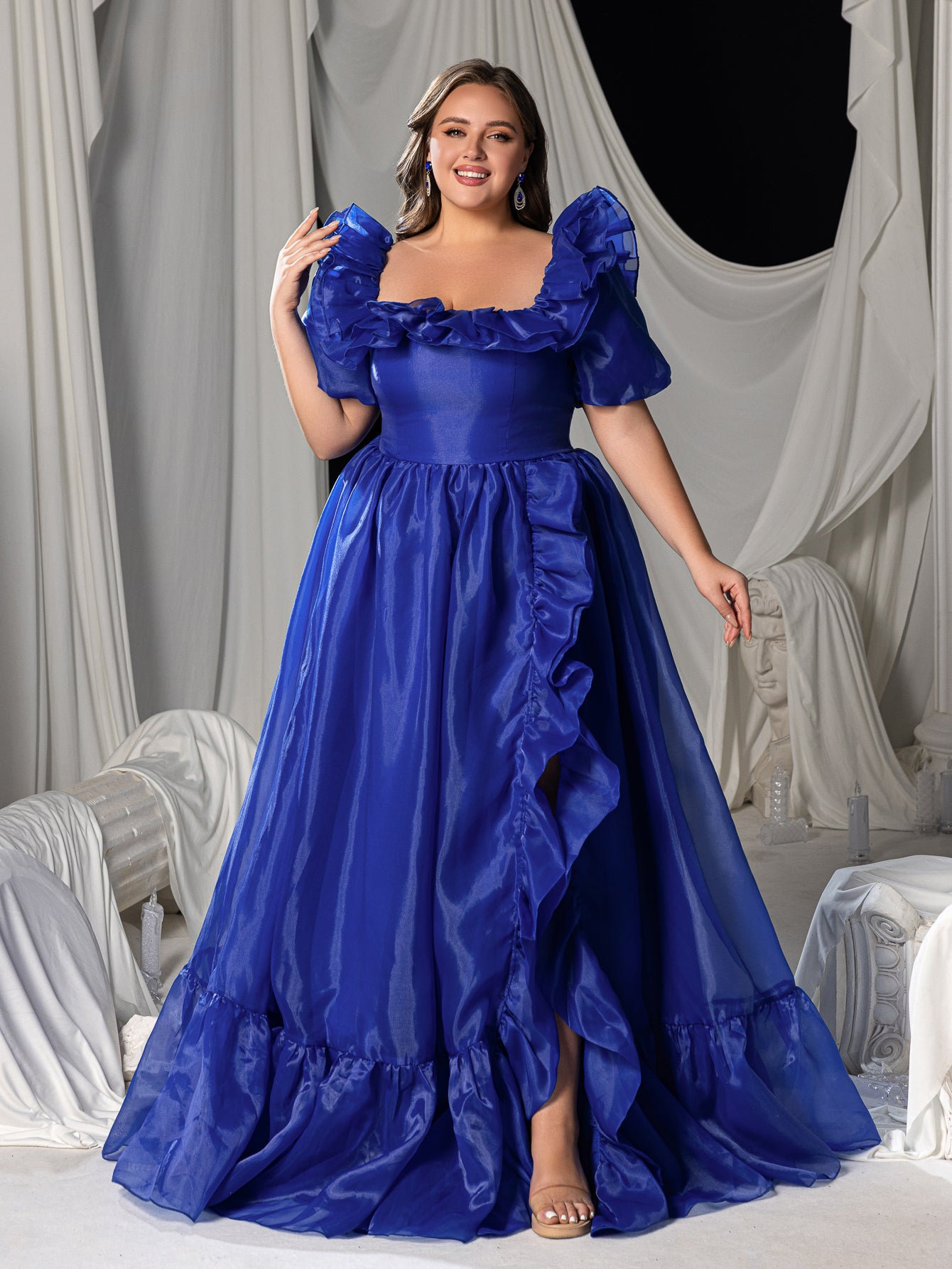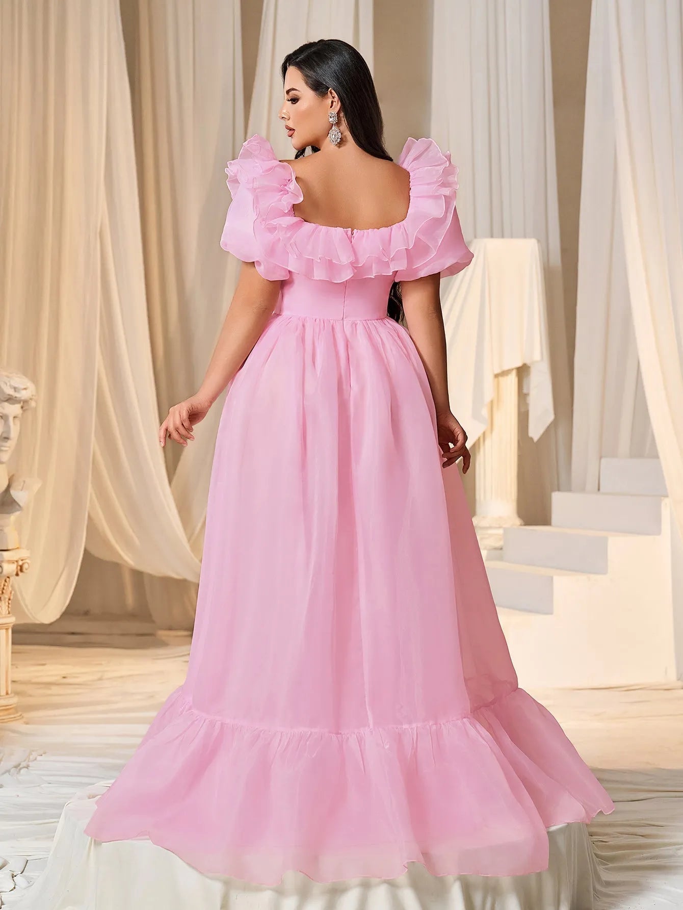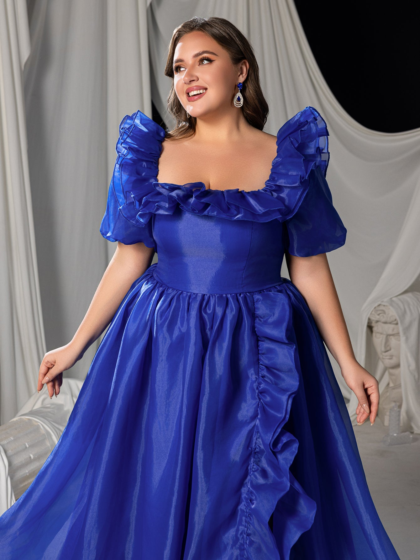 Plus Square Collar Ruffle Trim Puff Sleeves Organza Prom Dress