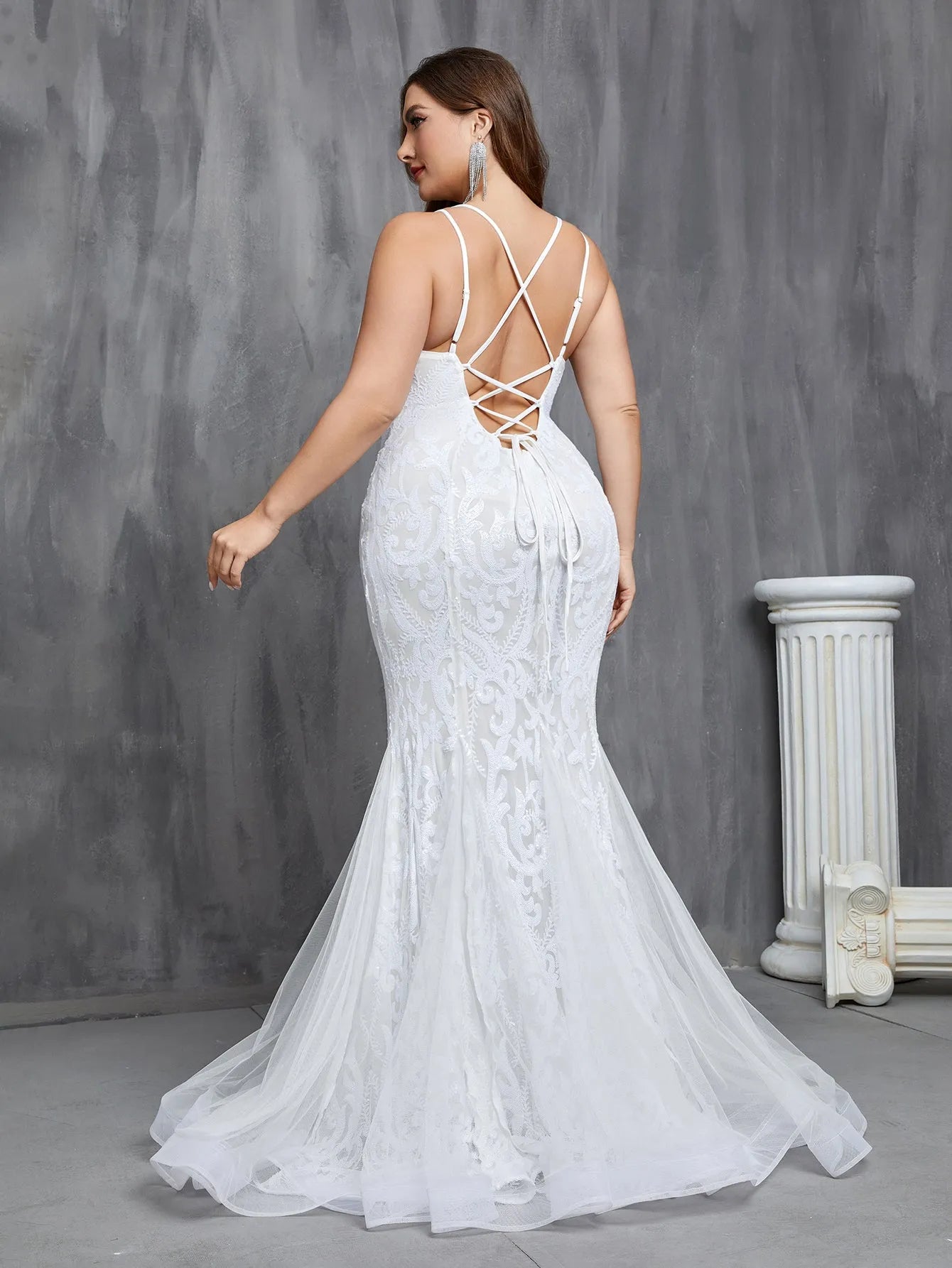 Step into elegance with our captivating bridal gown, a perfect blend of classic charm and modern sophistication. This gown showcases a delicate v-neckline with slim, crisscross straps, providing an alluring open-back design that adds a touch of contemporary style. The figure-flattering mermaid silhouette gracefully flows into a soft, airy tulle train, creating a stunning visual effect.