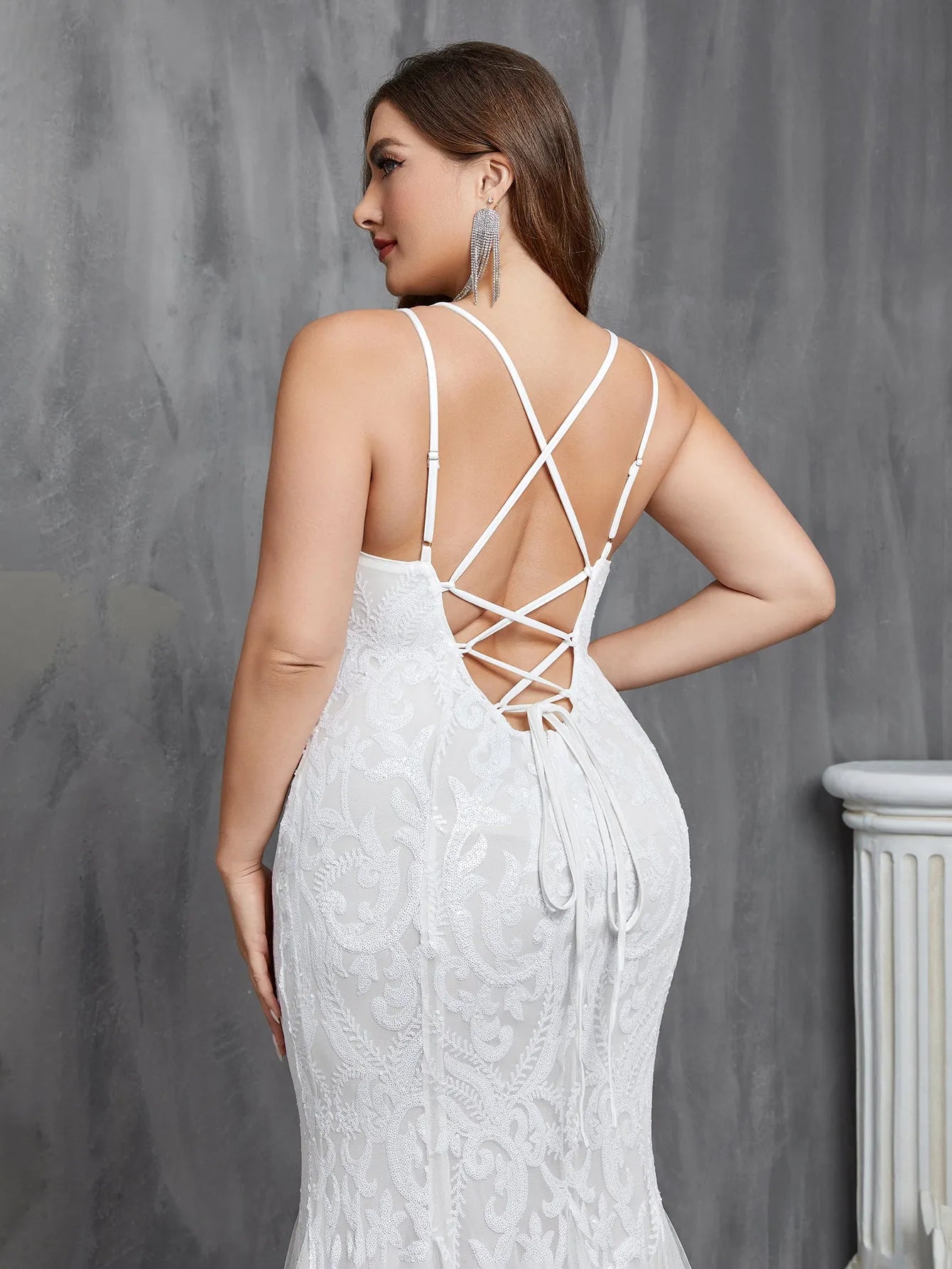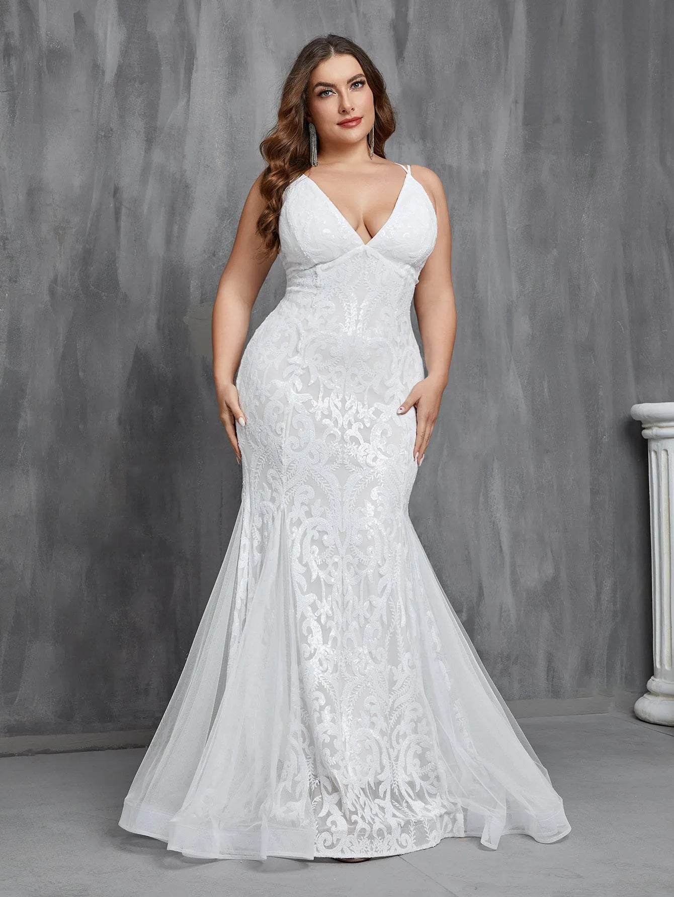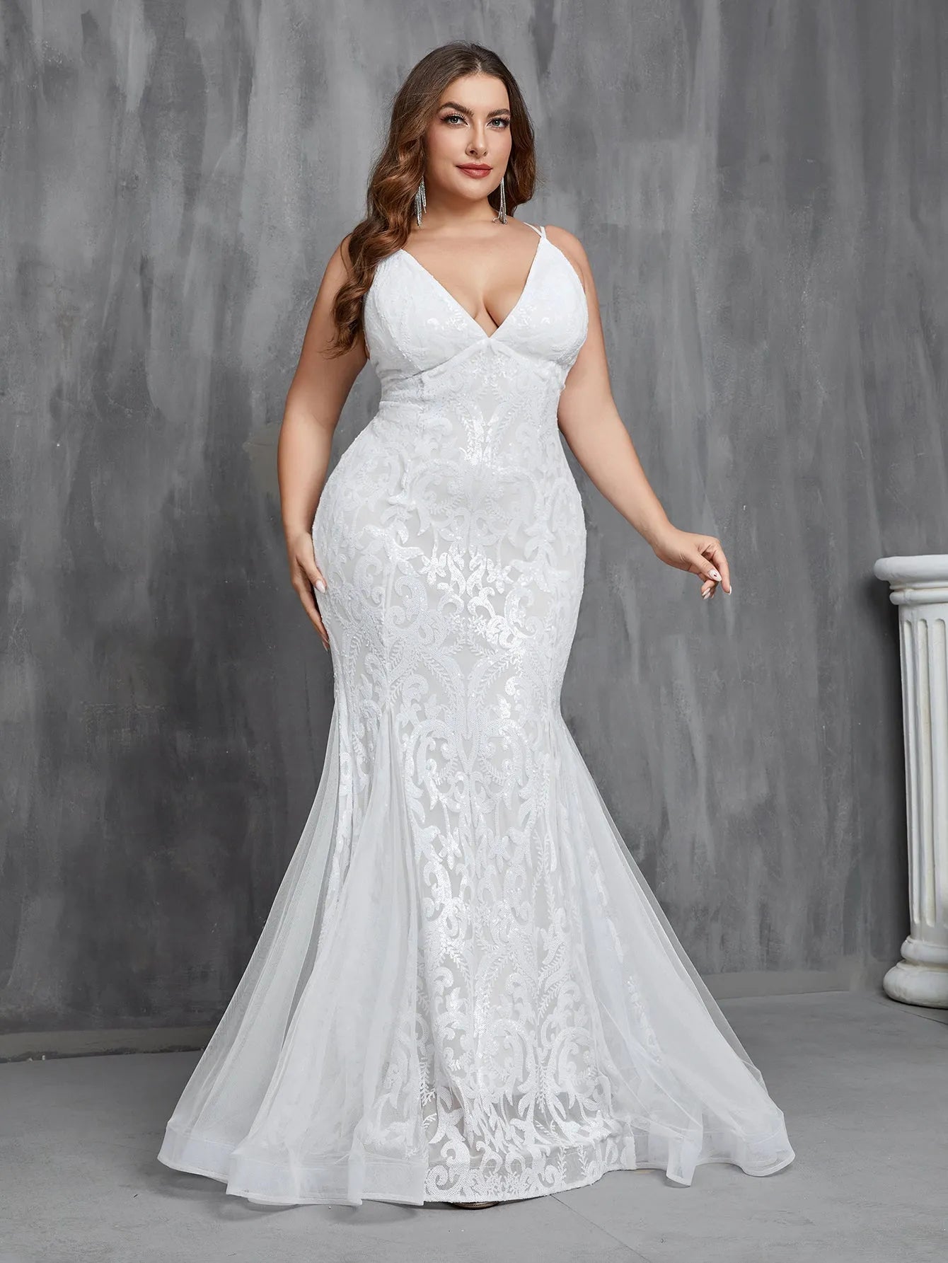 This dress combines intricate sequin details with a romantic mermaid silhouette, making it perfect for brides who seek a balance of elegance and allure on their special day.
