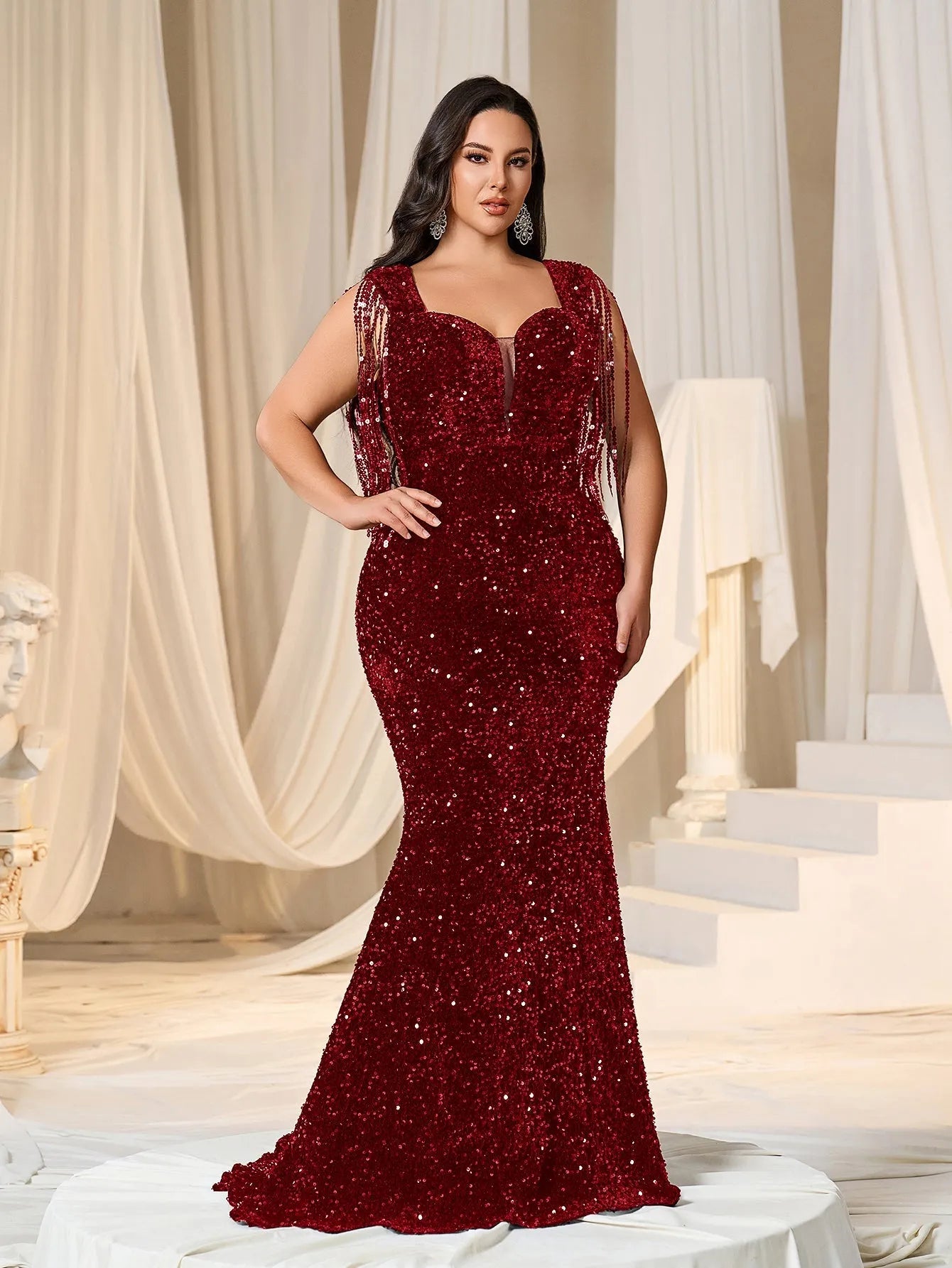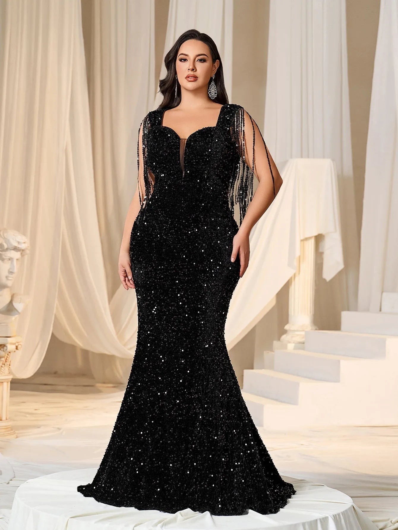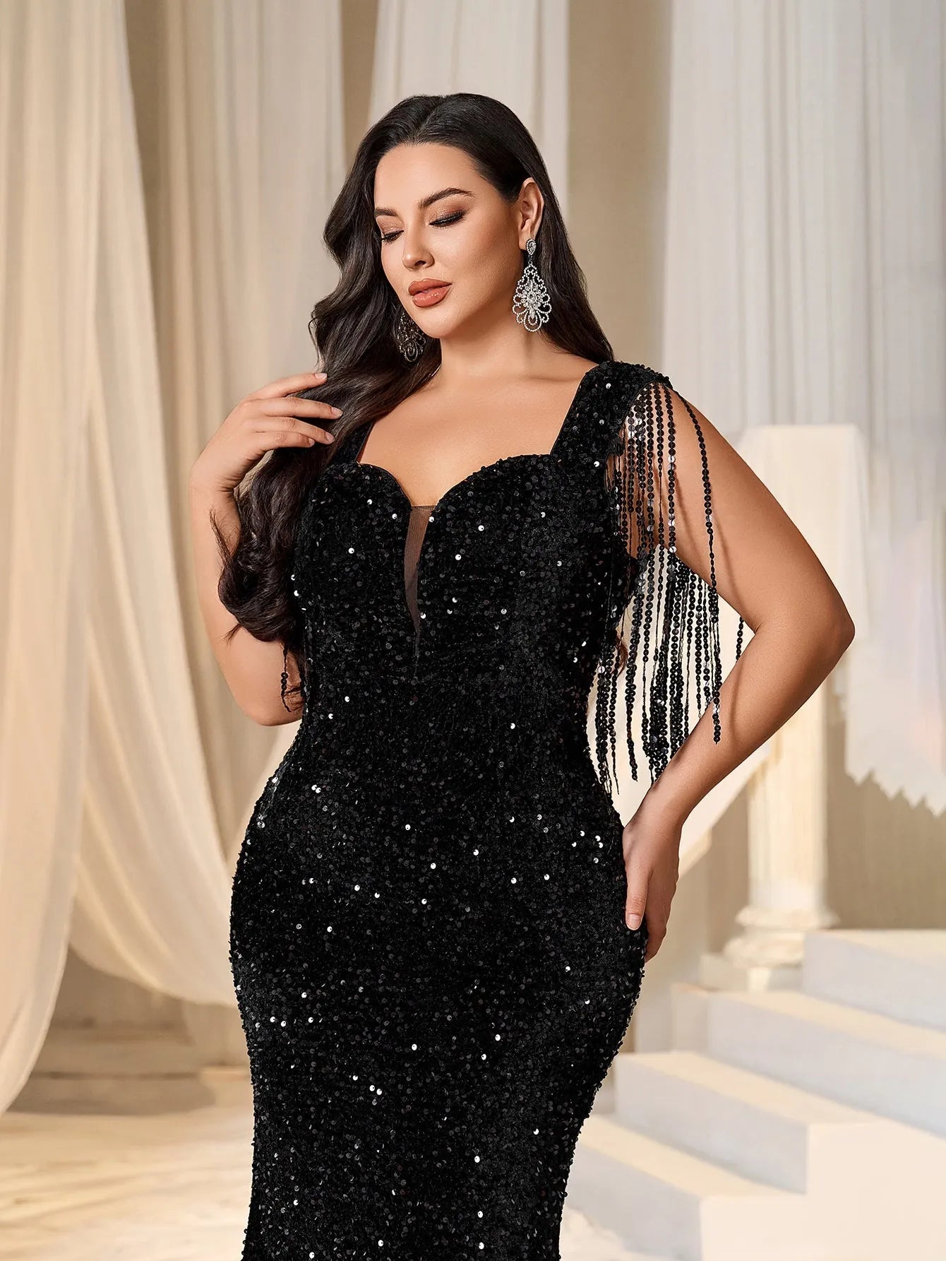 Make a breathtaking entrance with our stunning sequin gown, designed to make you shine at any formal event. The gown features a sophisticated sweetheart neckline and a figure-flattering mermaid silhouette that hugs your curves and flows into a graceful train, ensuring both elegance and confidence. The shimmering sequins paired with delicate fringe details on the shoulders create a striking and luxurious look.