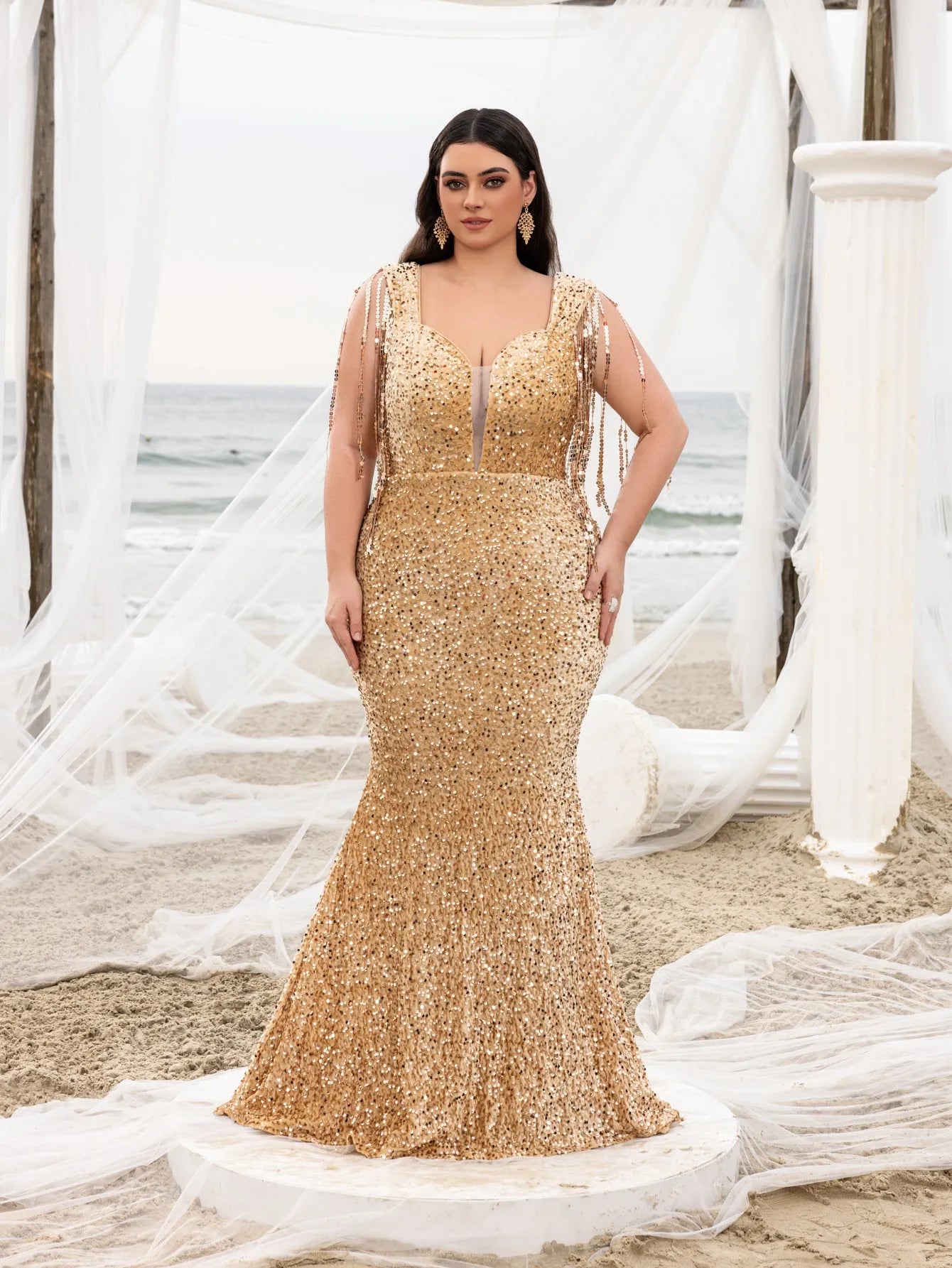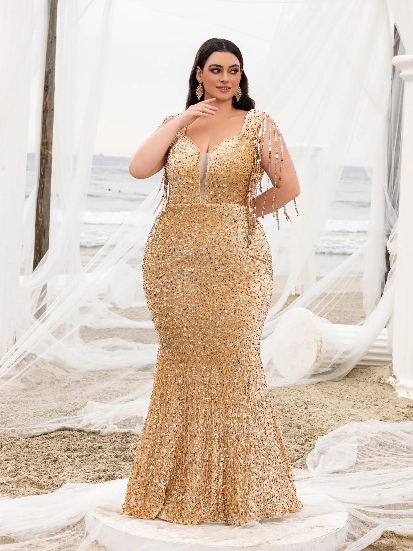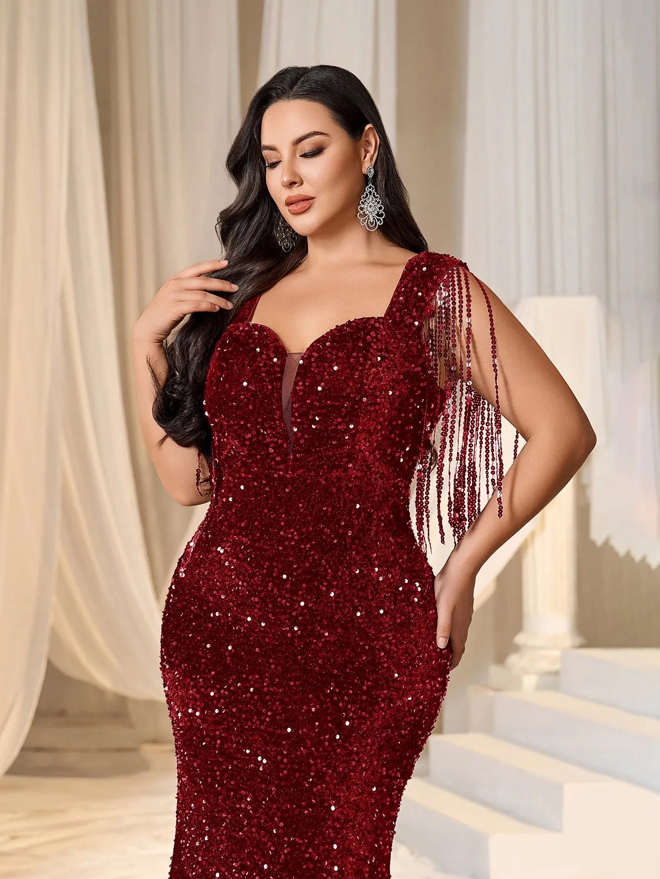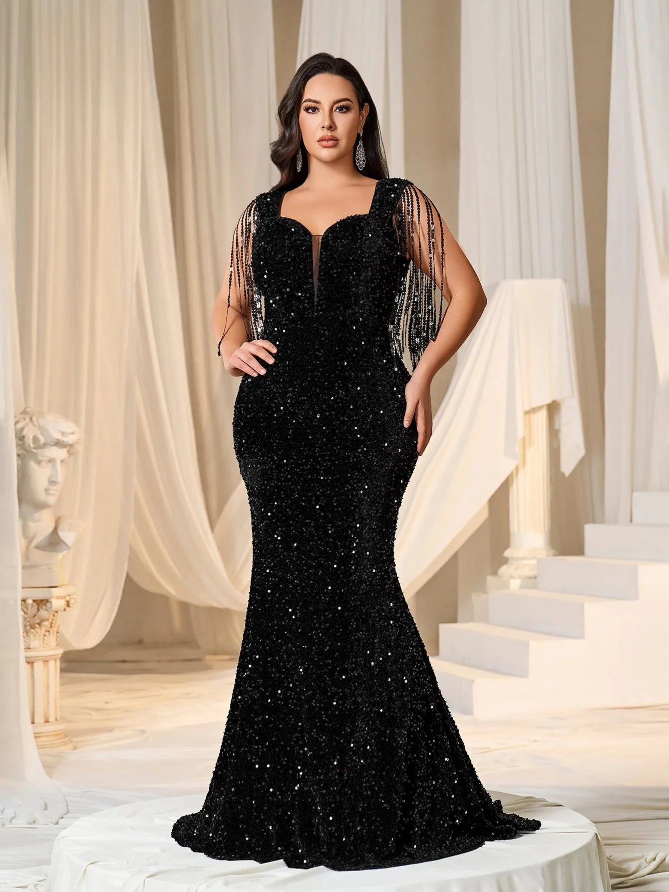 Make a breathtaking entrance with our stunning sequin gown, designed to make you shine at any formal event. The gown features a sophisticated sweetheart neckline and a figure-flattering mermaid silhouette that hugs your curves and flows into a graceful train, ensuring both elegance and confidence. The shimmering sequins paired with delicate fringe details on the shoulders create a striking and luxurious look.