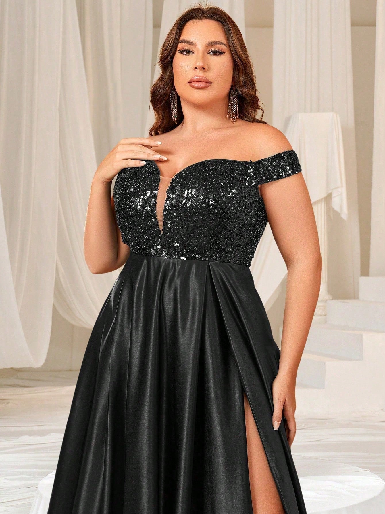 Turn heads with this stunning off-the-shoulder A-line evening gown, crafted from luxurious satin and sequins. The dress features a sweetheart neckline that beautifully highlights your décolletage, while the fitted bodice is adorned with sparkling sequins for added glamour. The voluminous satin skirt flows gracefully to the floor, creating an effortlessly elegant silhouette, enhanced by a thigh-high slit for a touch of allure. Perfect for making a grand entrance at any formal event, this dress is designed to make you feel like the belle of the ball.