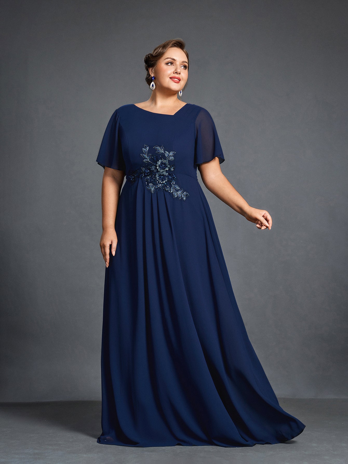 Plus Womens' Chiffon Evening Gown with Floral Appliqué Detailing – Elegant Boat Neck & Cinched Waist Formal Dress for Mothers of the Bride