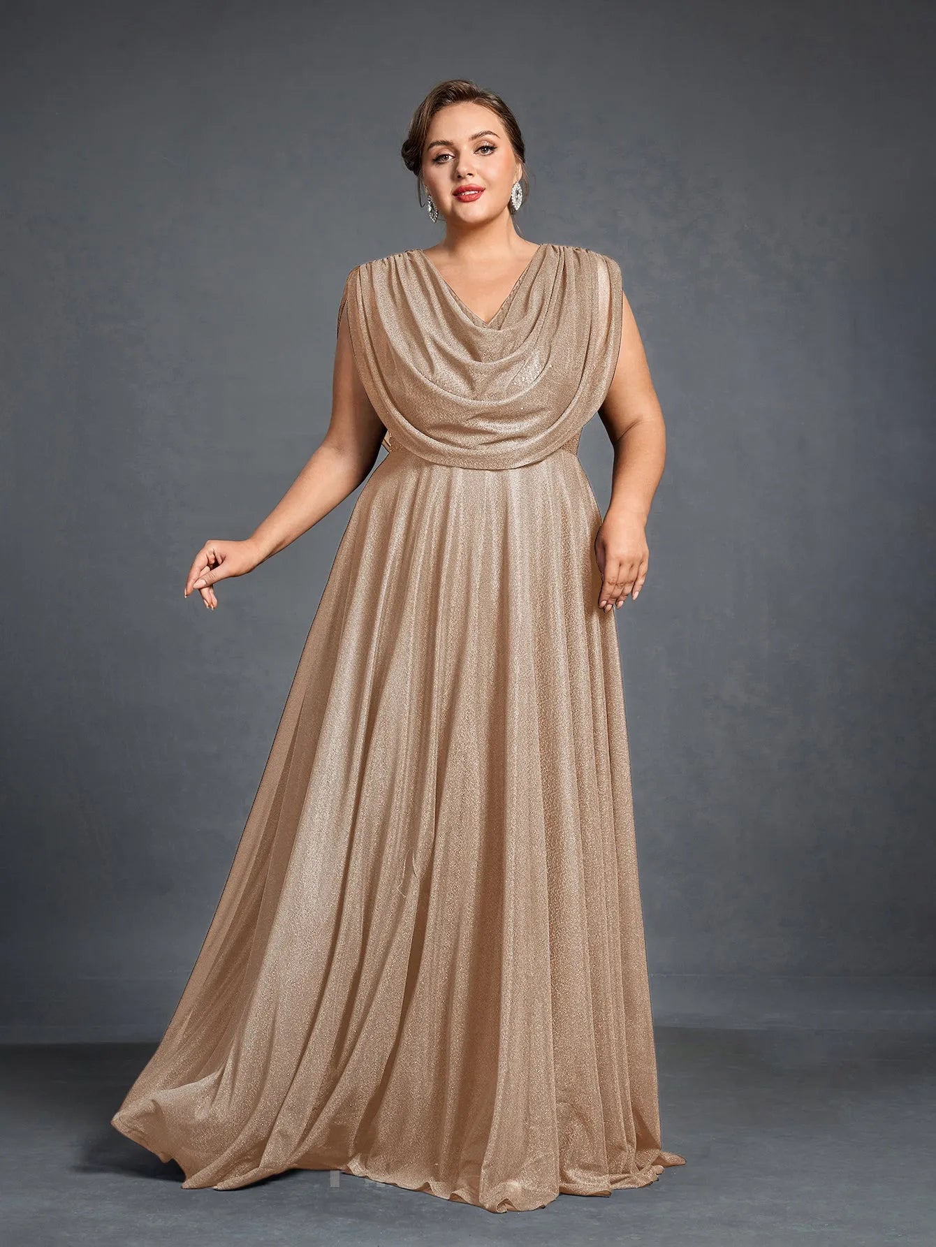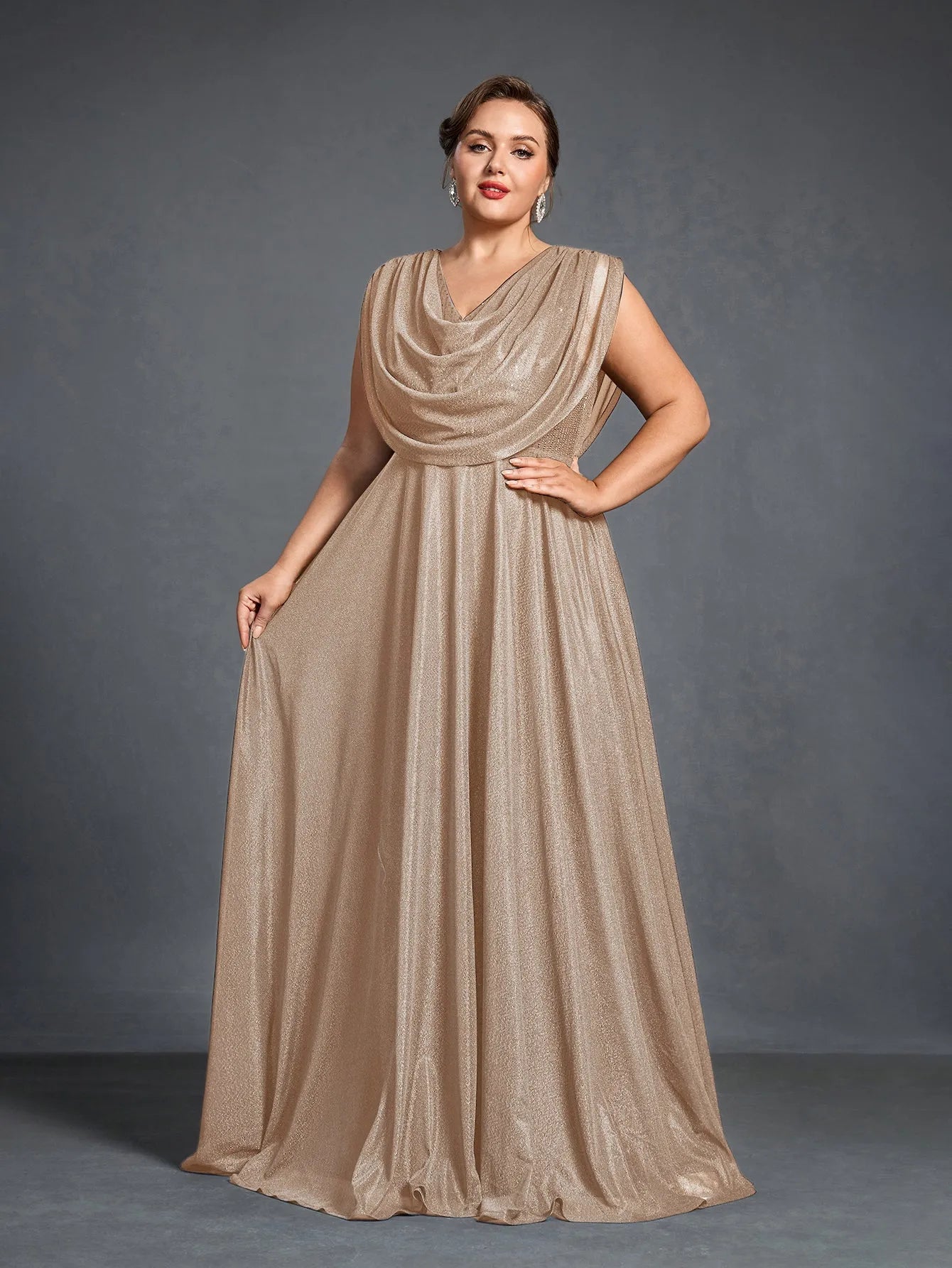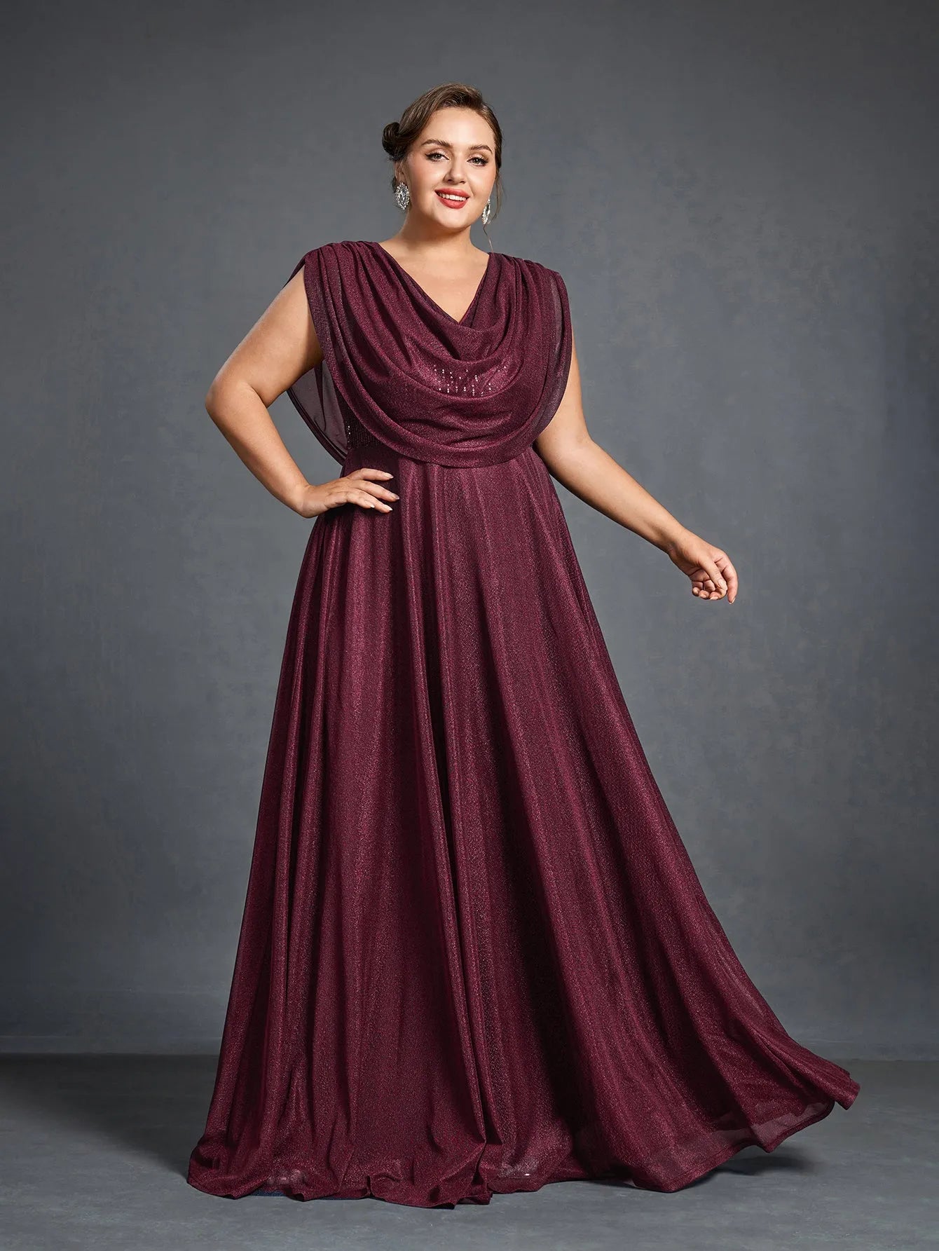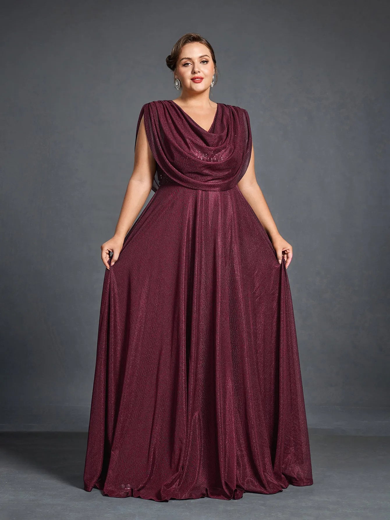 Elevate your evening look with this graceful cowl-neck gown, designed to offer both comfort and elegance. The gown features a draped cowl neckline that flows effortlessly into a full-length skirt, while the shimmering fabric adds a subtle touch of glamour. With a flattering silhouette and a beautiful flowing cape effect at the back, this gown is perfect for making a statement without sacrificing ease.