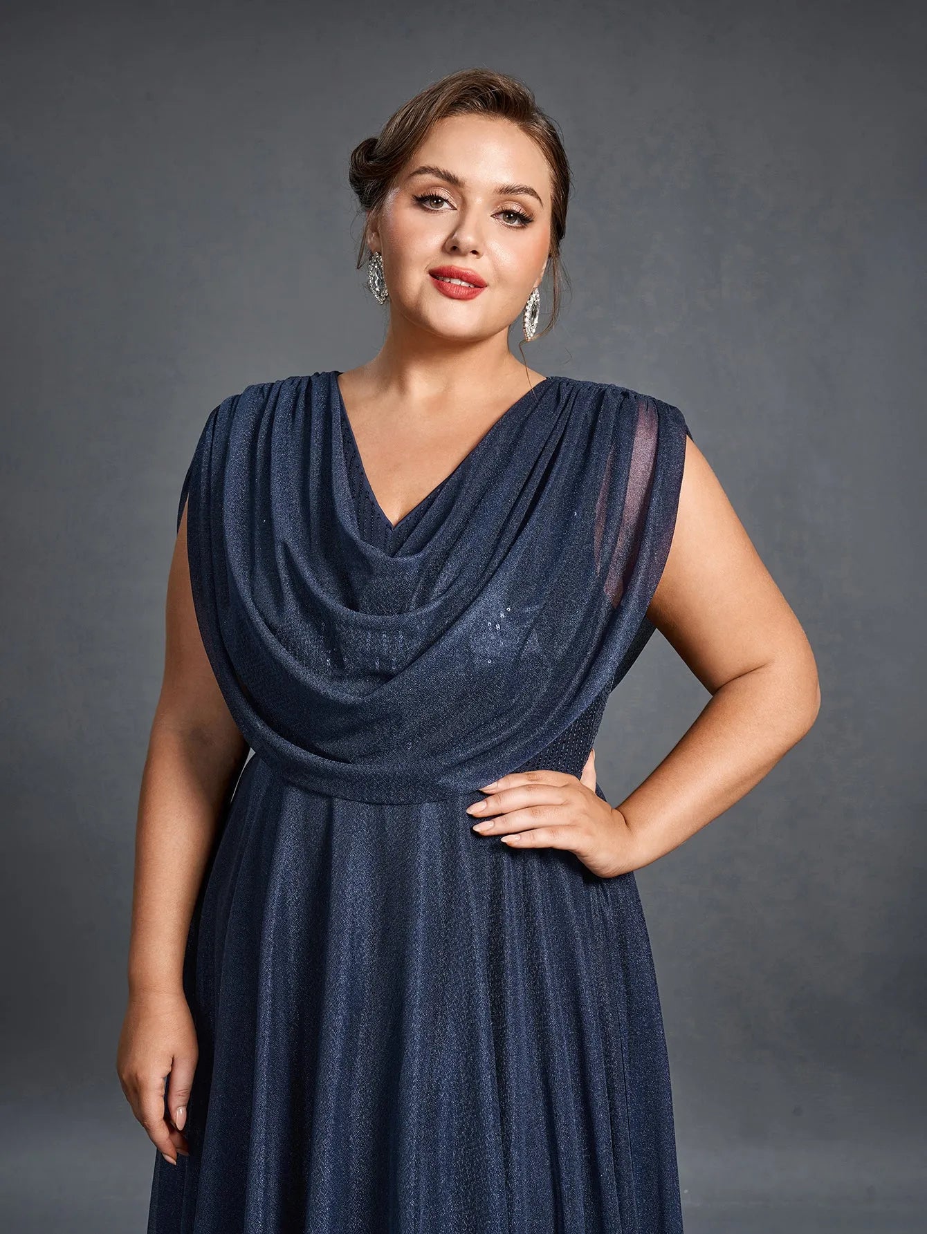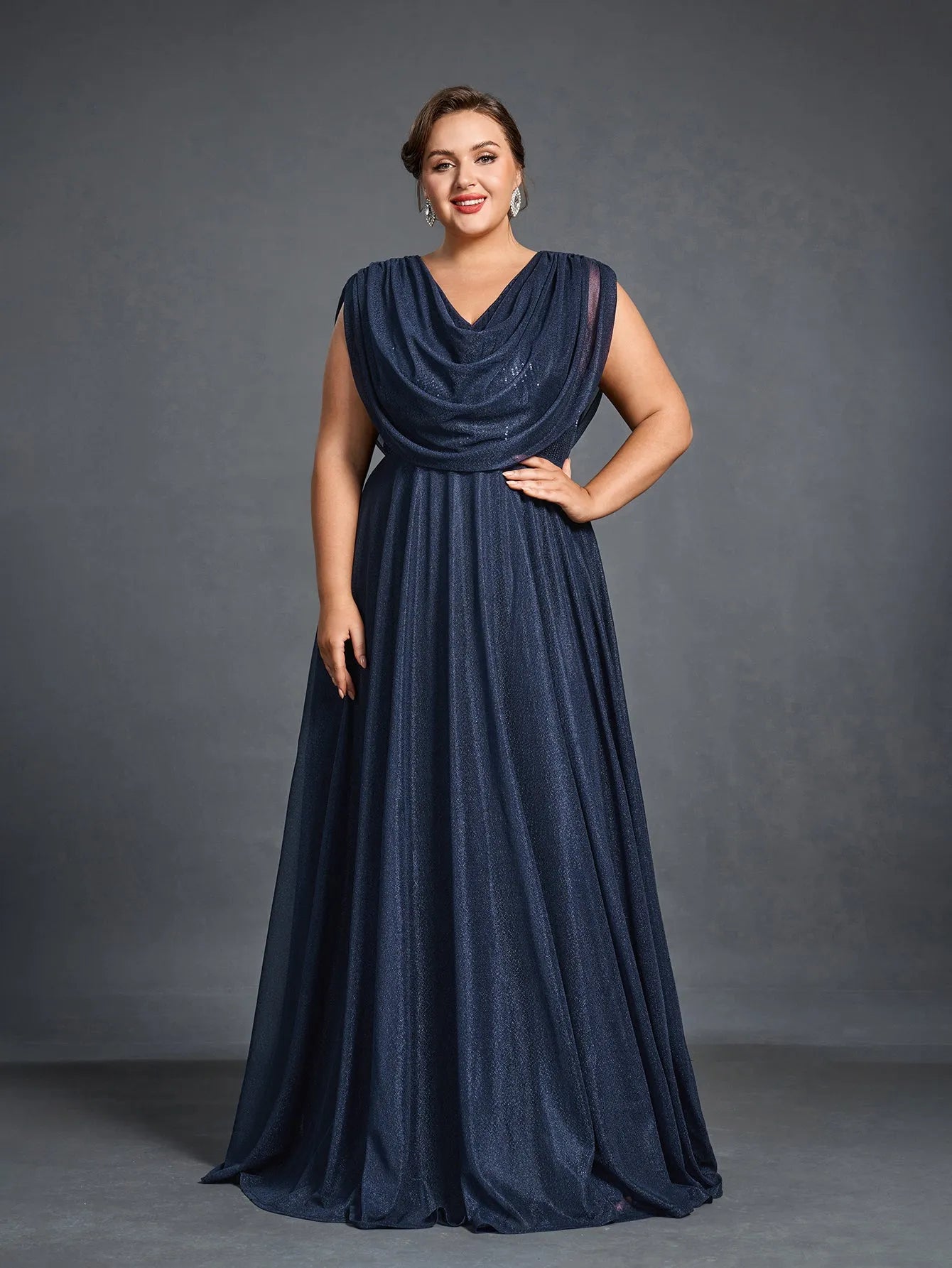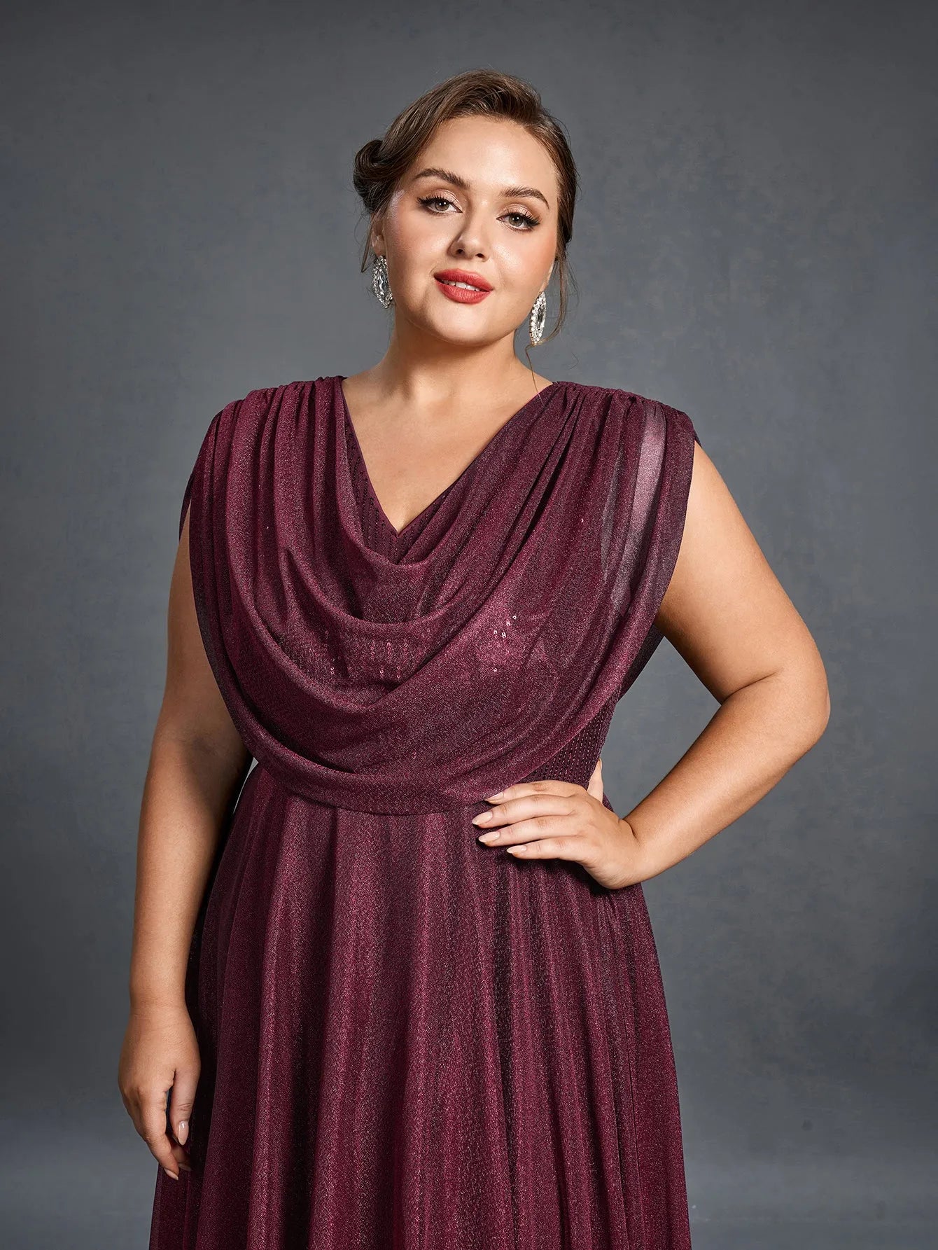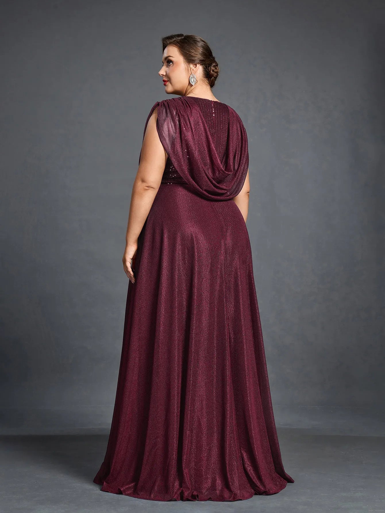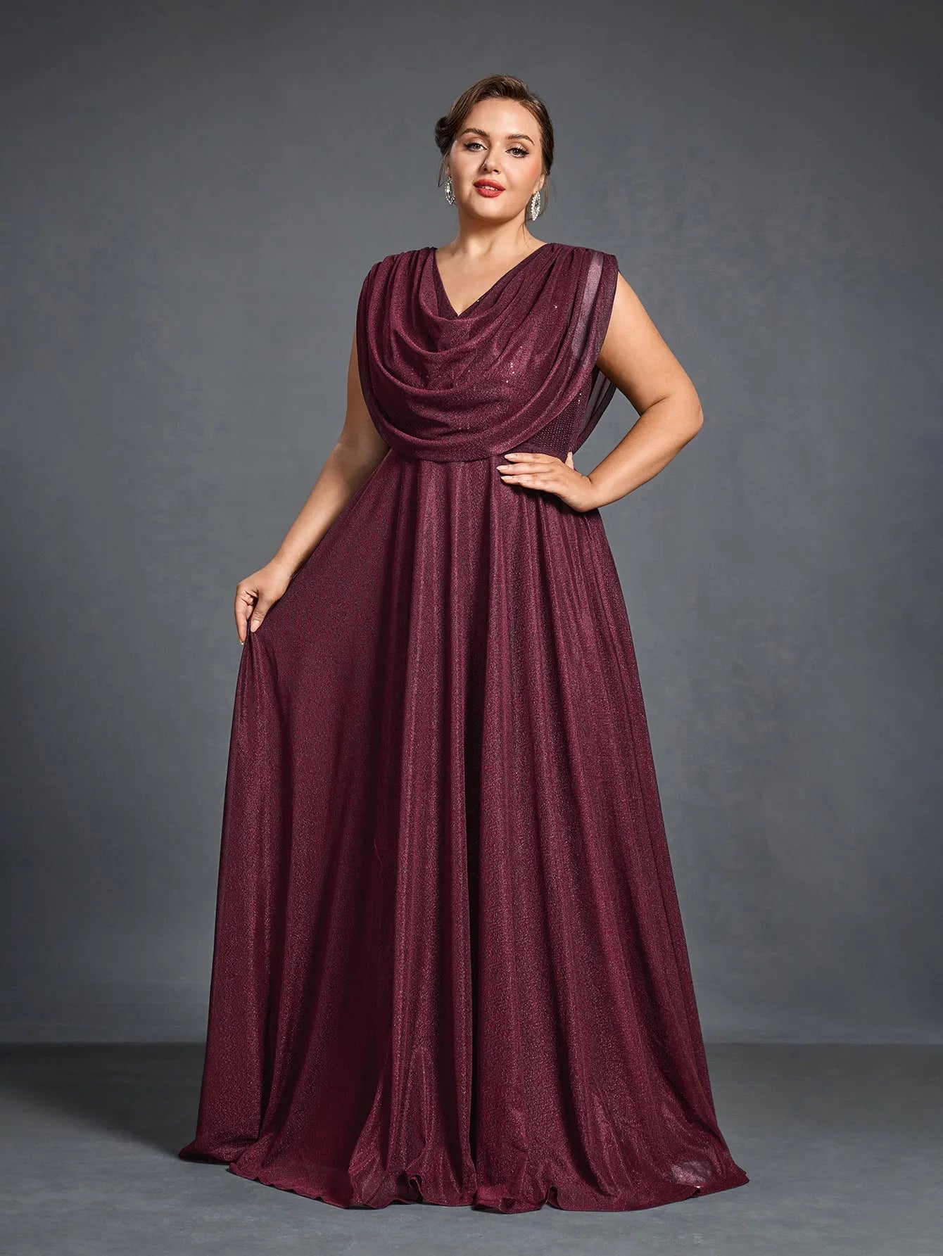 Elevate your evening look with this graceful cowl-neck gown, designed to offer both comfort and elegance. The gown features a draped cowl neckline that flows effortlessly into a full-length skirt, while the shimmering fabric adds a subtle touch of glamour. With a flattering silhouette and a beautiful flowing cape effect at the back, this gown is perfect for making a statement without sacrificing ease.