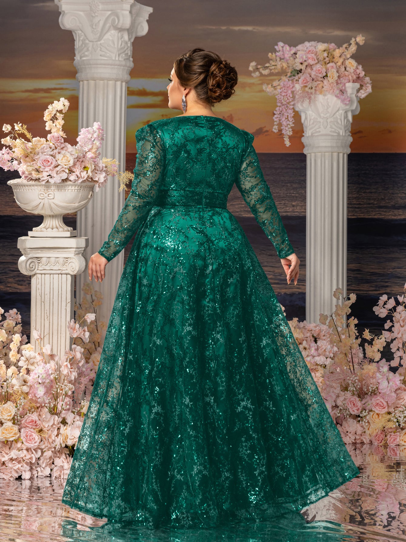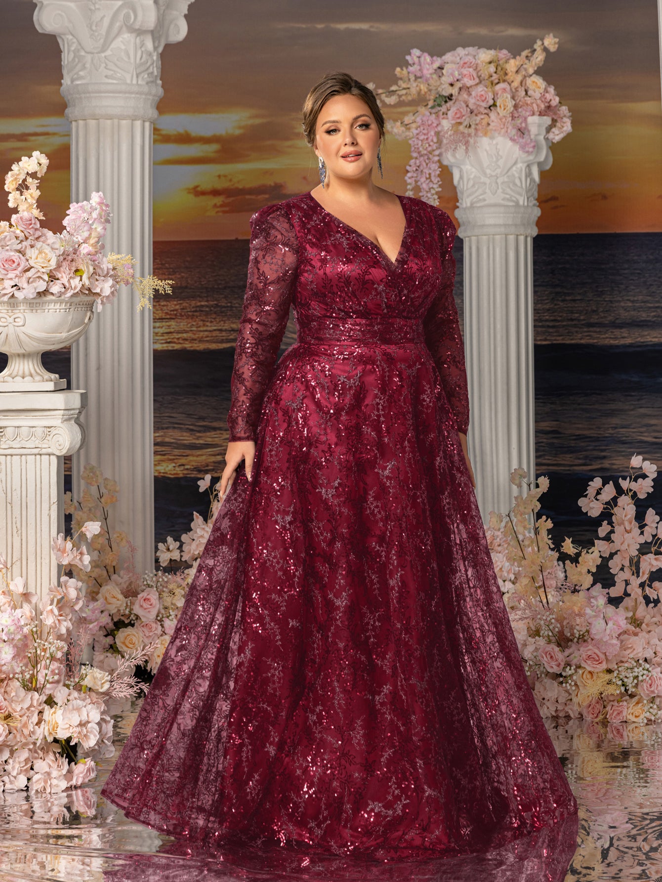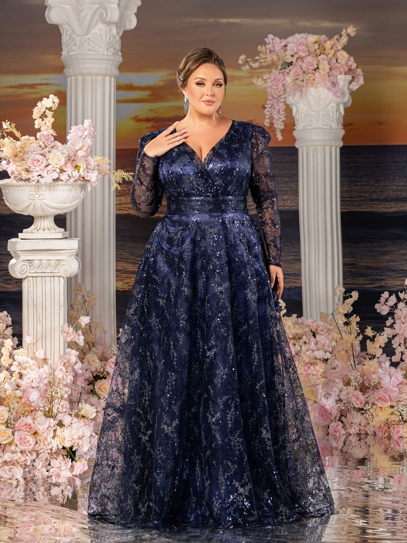 Plus Womens' Elegant Lace & Sequin Evening Gown - V-Neck Long Sleeve Design with Cinched Waist & Flowing A-Line Skirt for Coastal Weddings, Luxury Evening Events