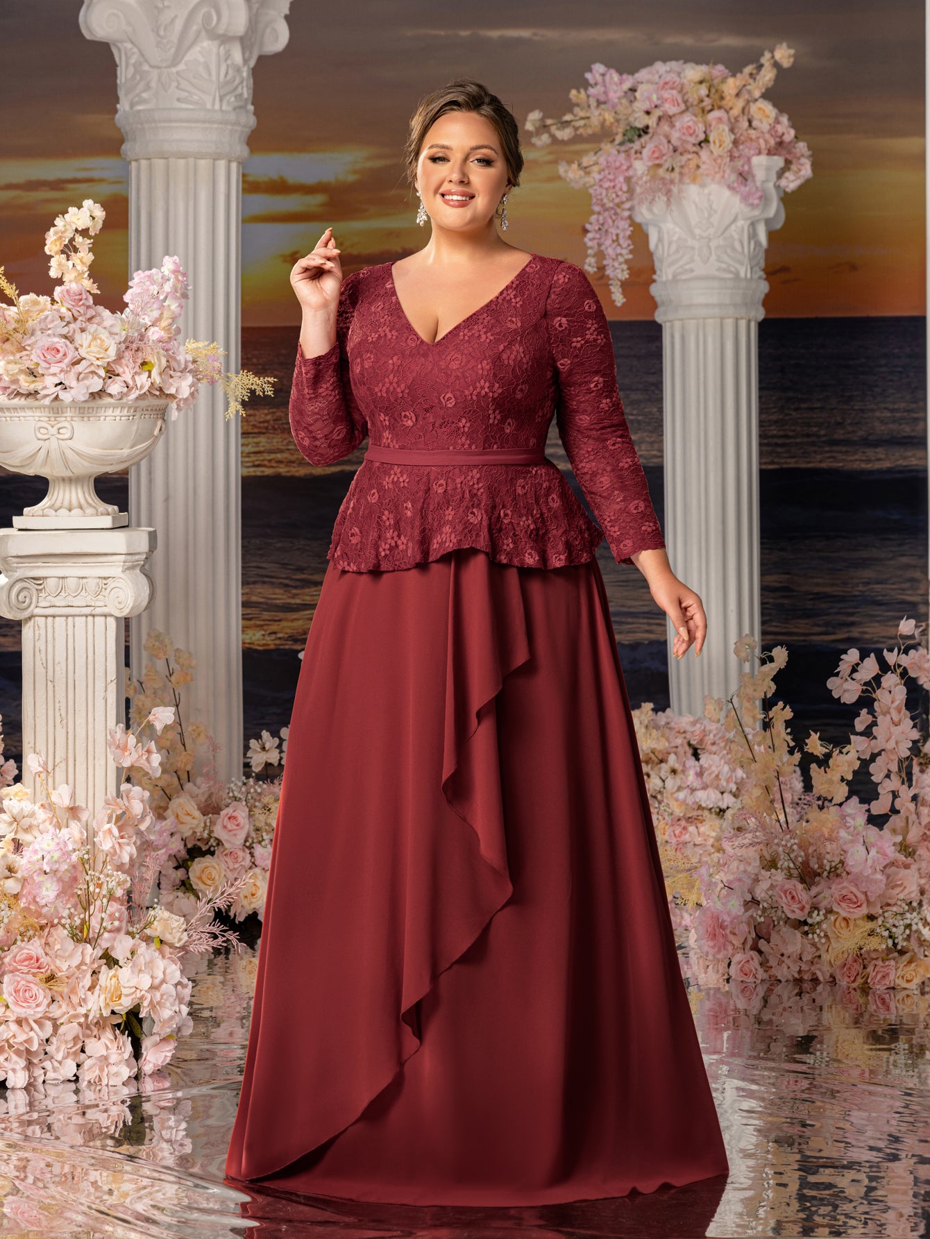 Plus Womens' Elegant Mother-of-the-Bride Gown: Lace V-Neck with Chiffon Skirt & Three-Quarter Sleeves – Elegant Formal Dress for Beach Weddings