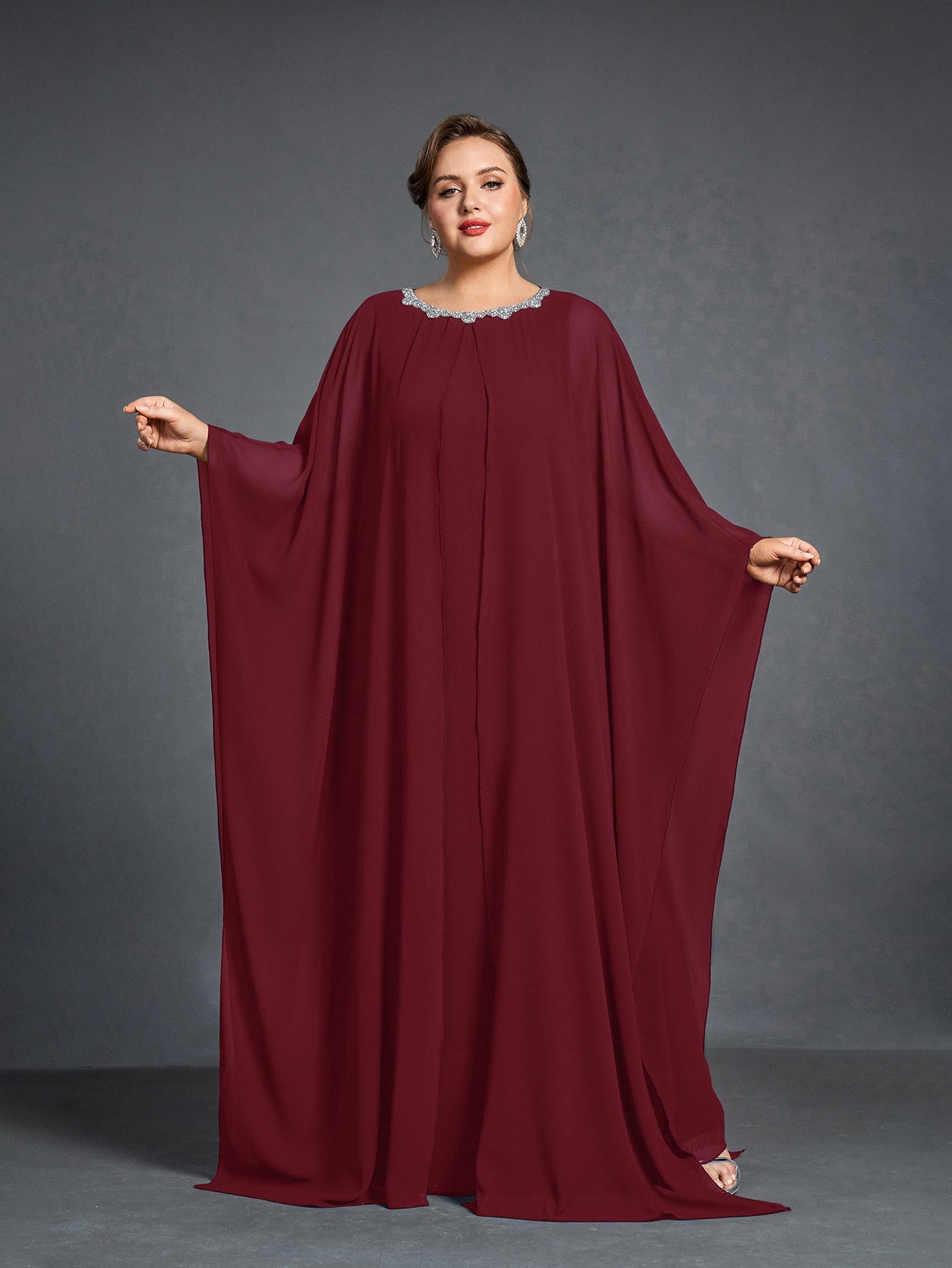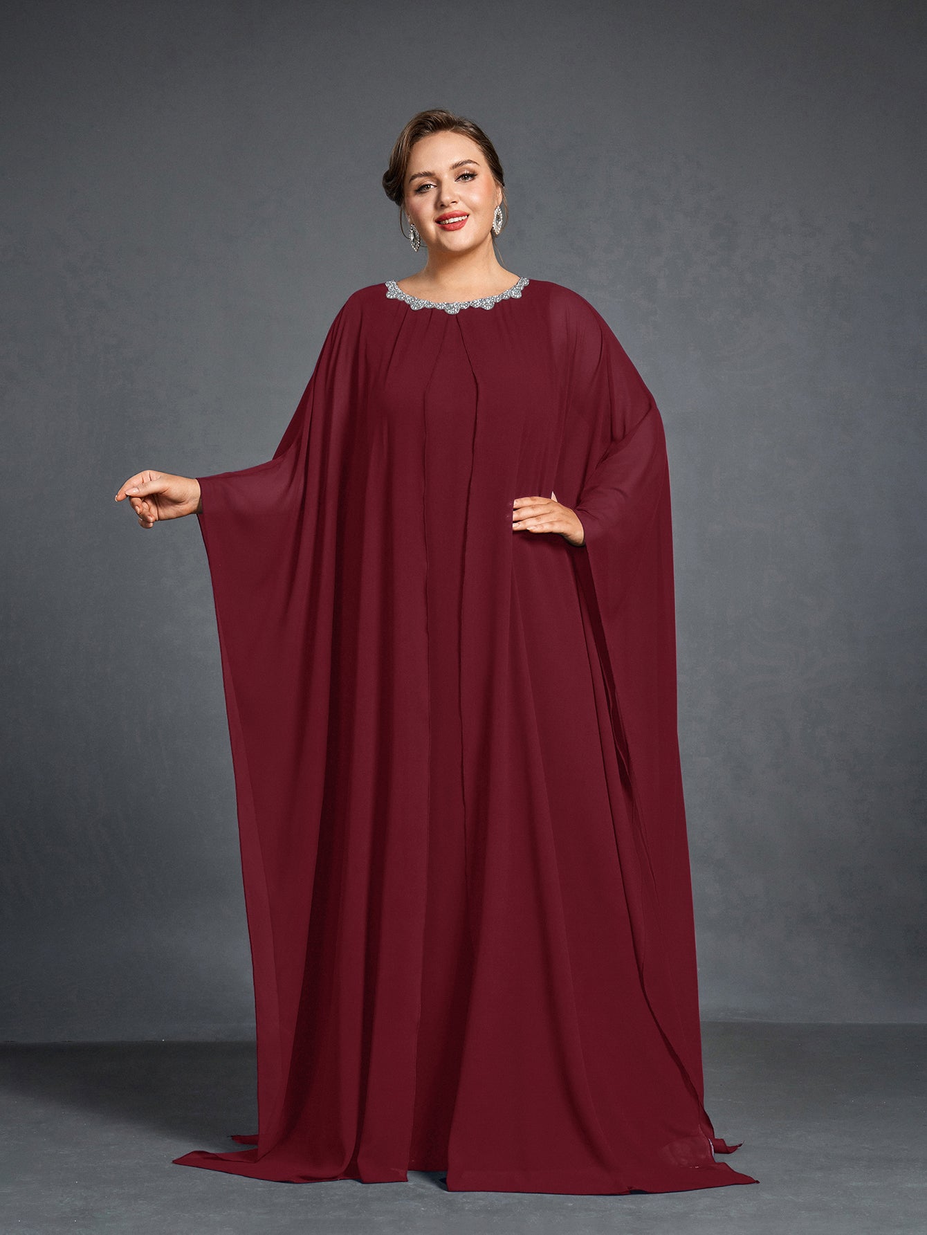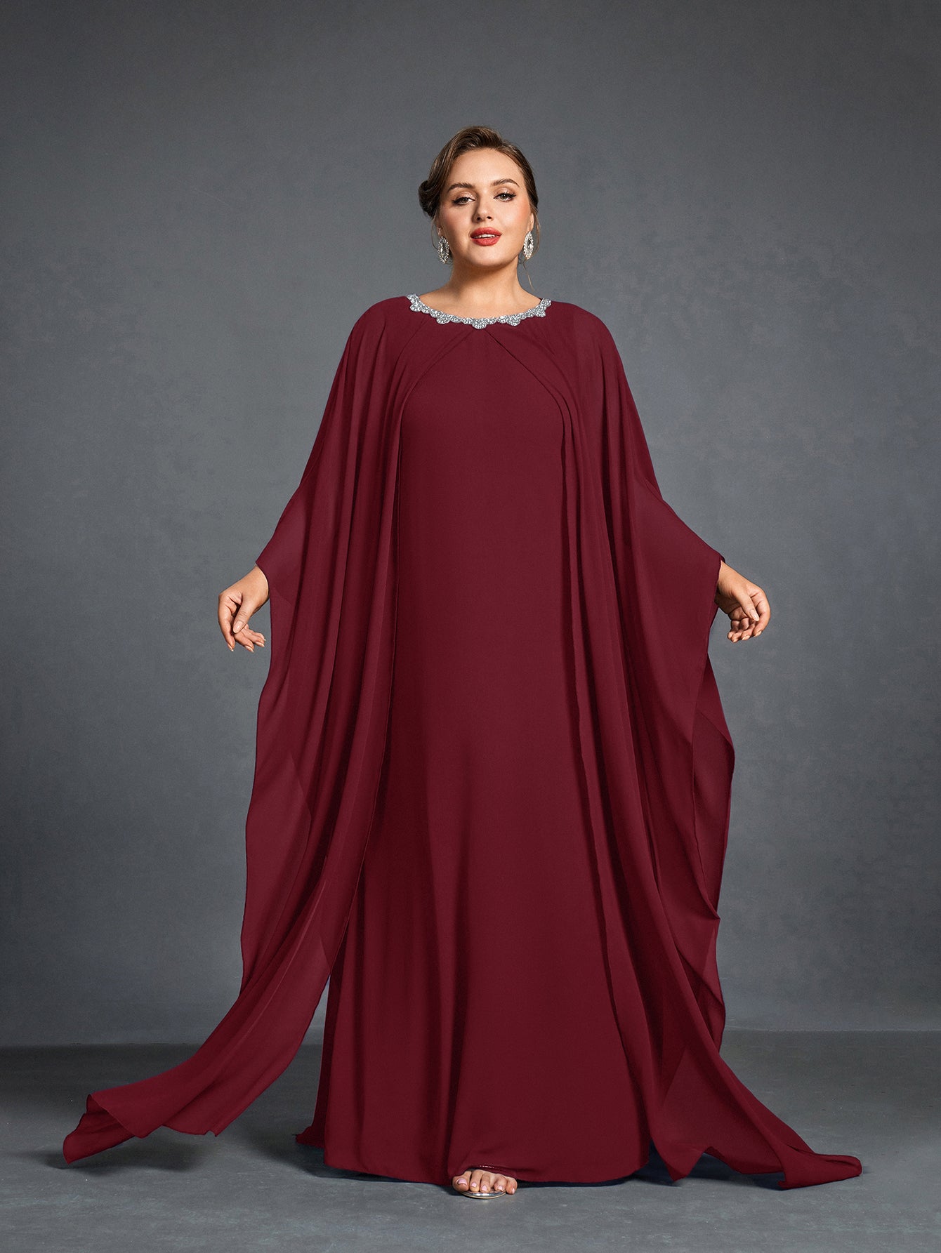 Plus Womens' Embellished Round -Neck Formal Dress with Sheer Chiffon Cape Sleeves