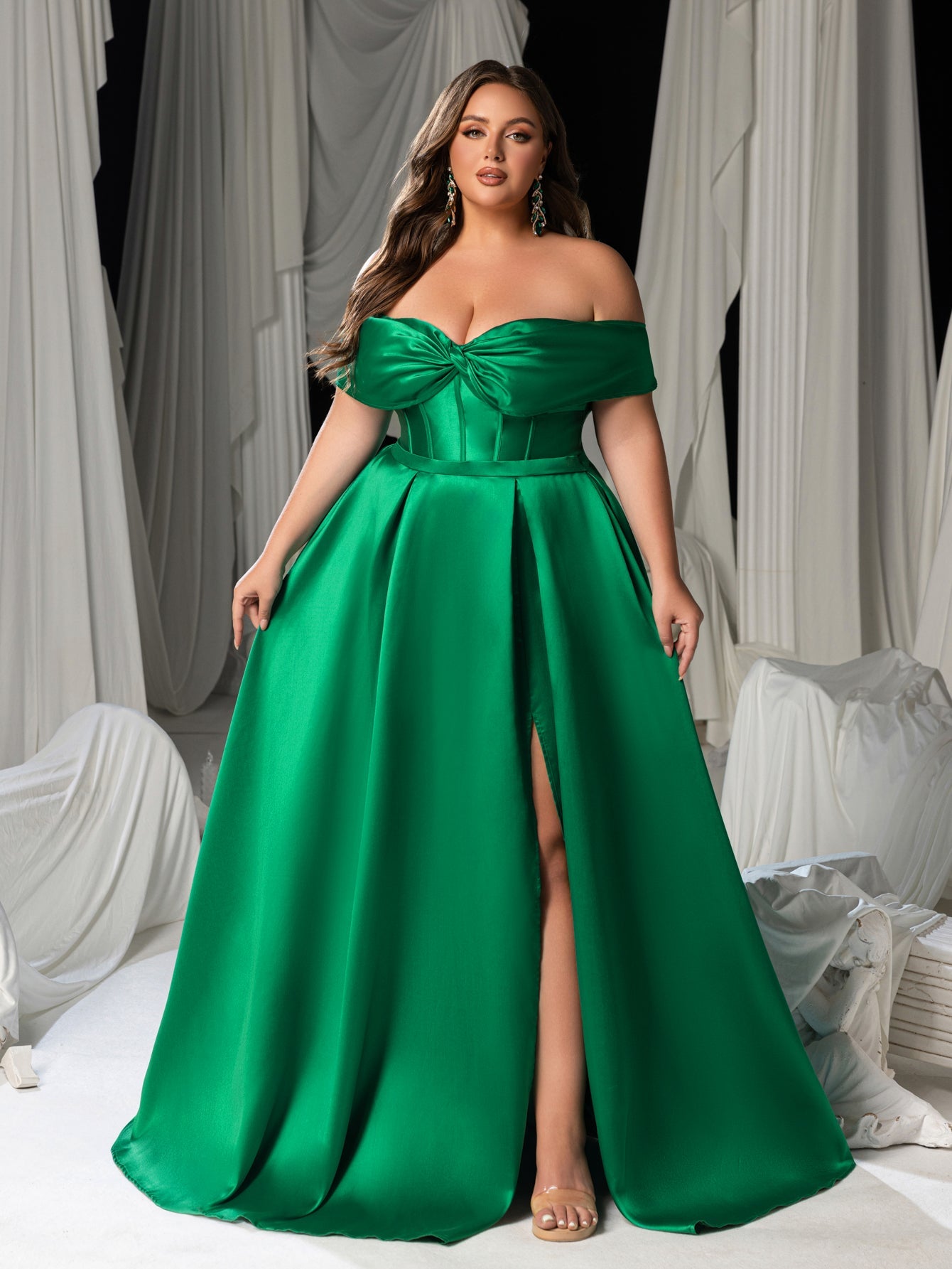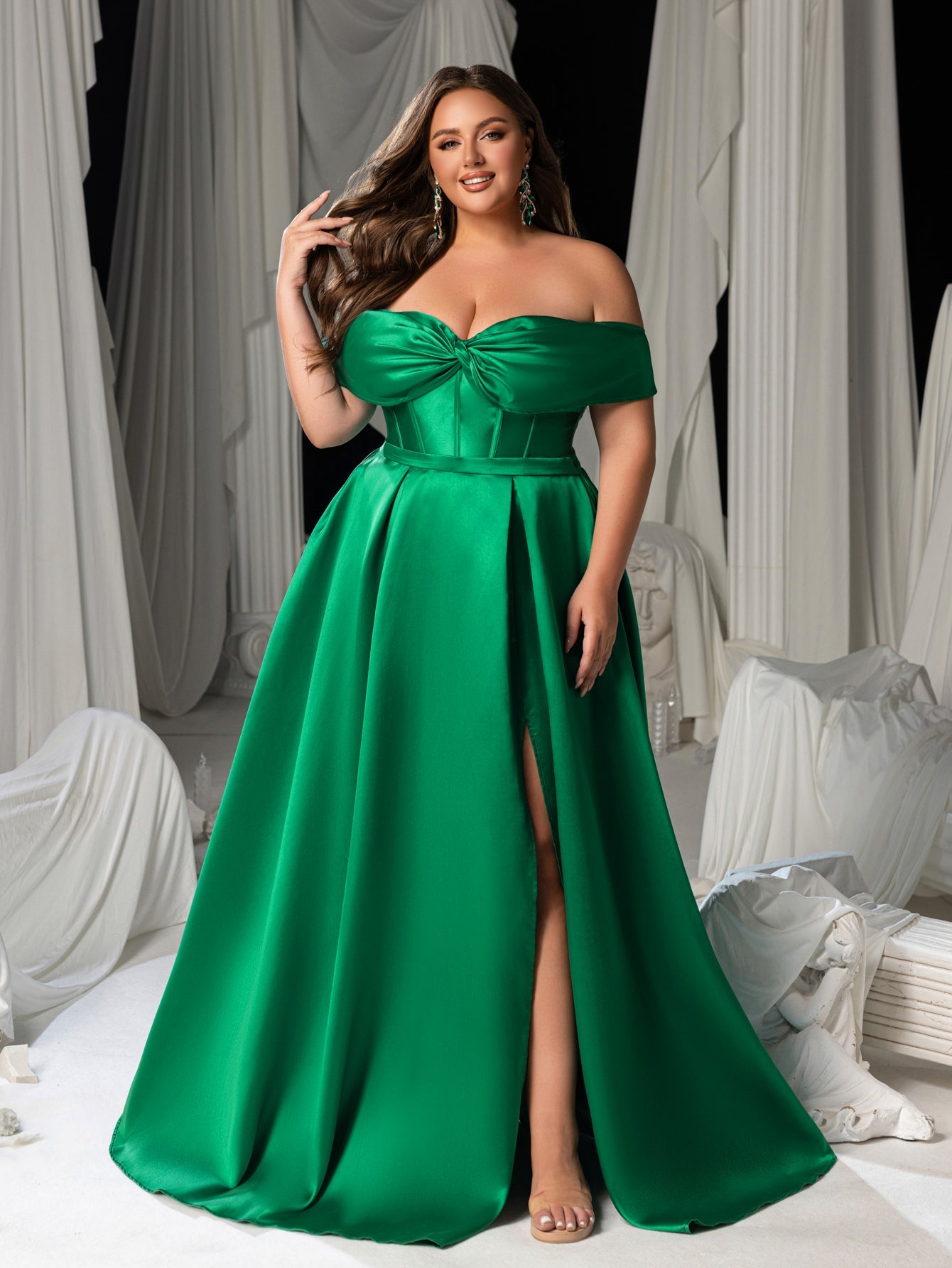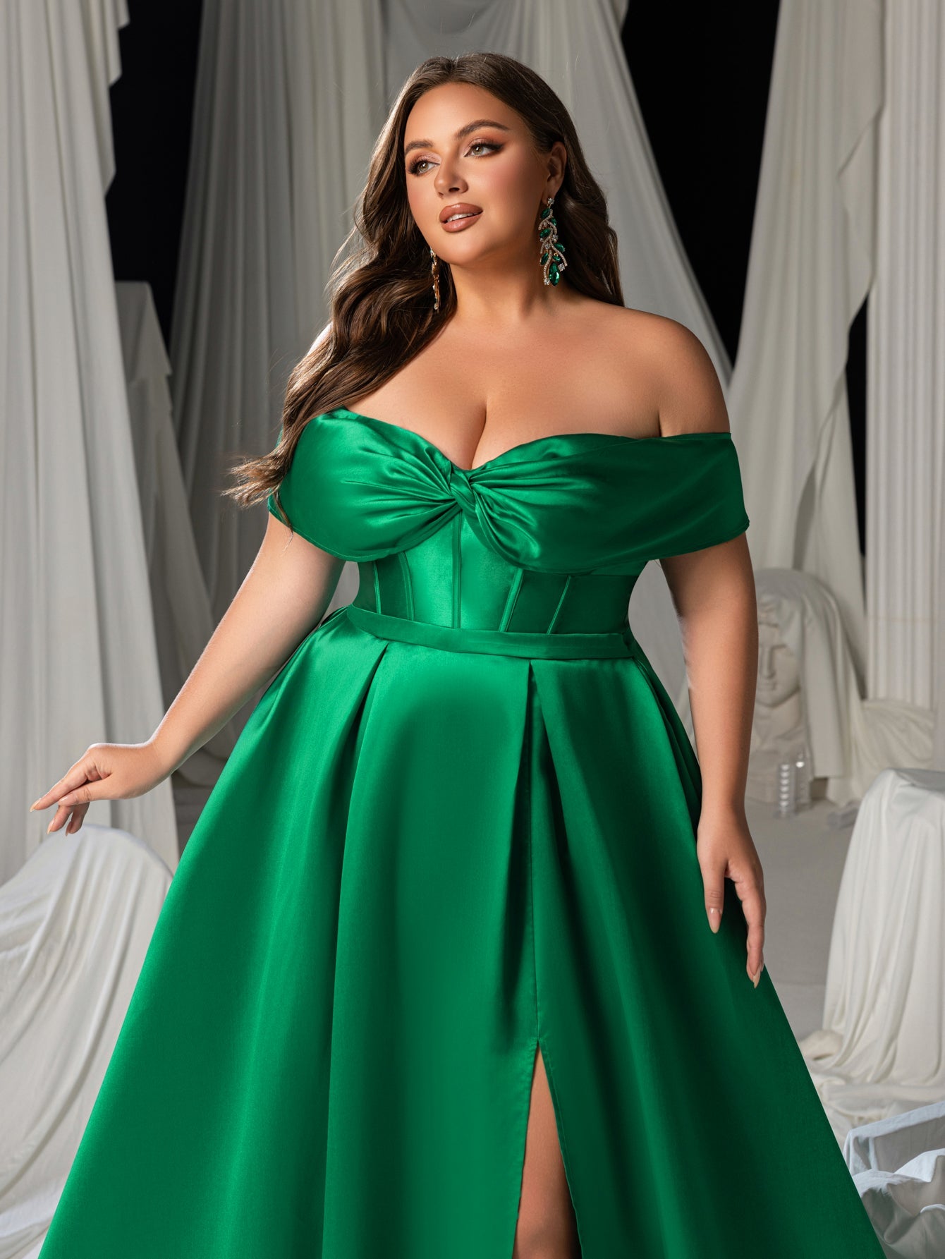Plus Women's Satin Off-Shoulder Evening Dress | High Slit & Back Lacing Gown