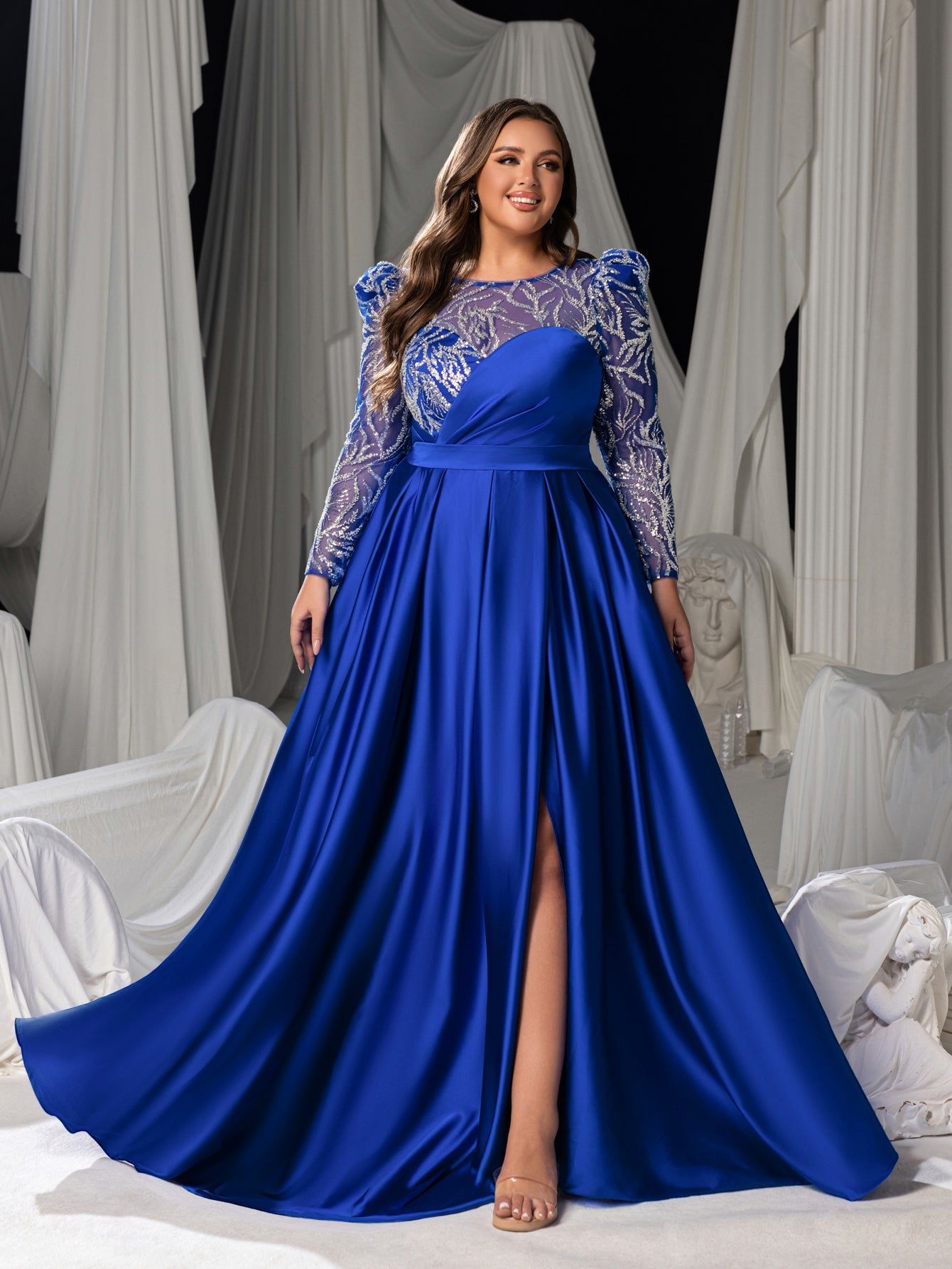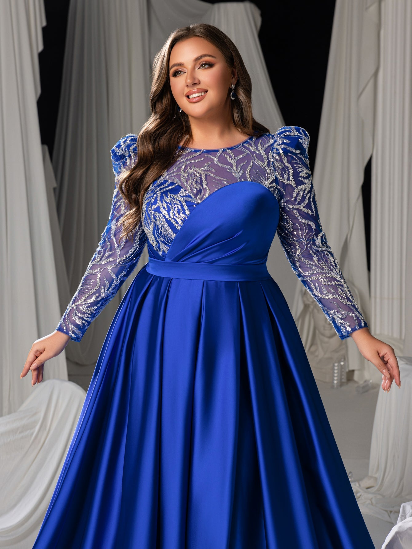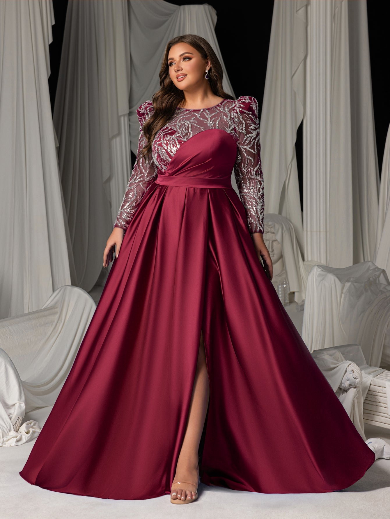 Plus Women's Sequin Bodice Formal Gown | Long Sleeves | Full Flared Skirt