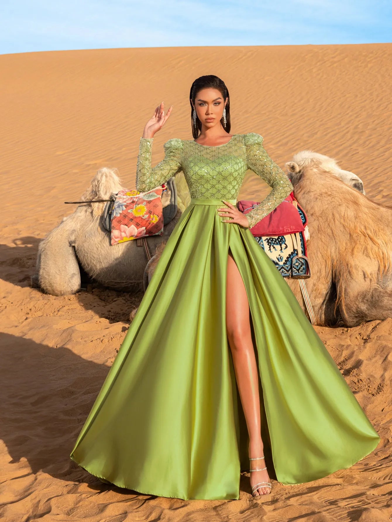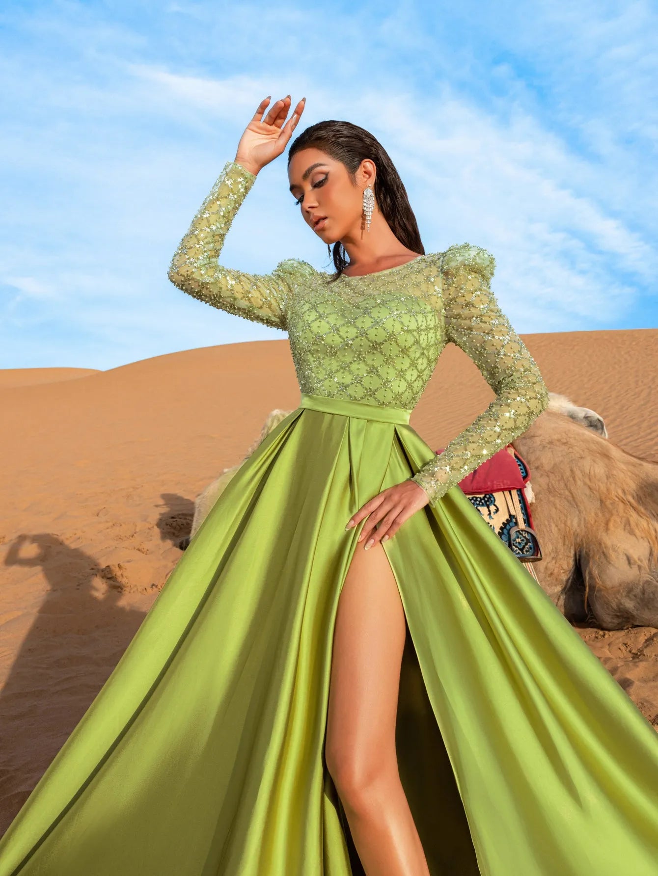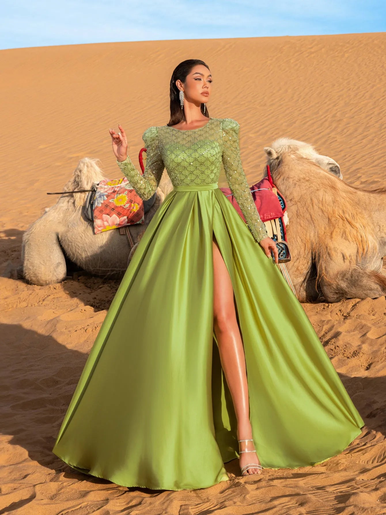 Embrace the elegance of the desert with this captivating gown, designed for the woman who commands attention with every step. This dress features a fitted bodice adorned with shimmering bead and sequin embellishments, crafted to reflect light and add sparkle to your evening. The high-slit satin skirt flows gracefully, offering both movement and sophistication, while the fitted waistband accentuates the silhouette, creating a striking contrast with the voluminous skirt.