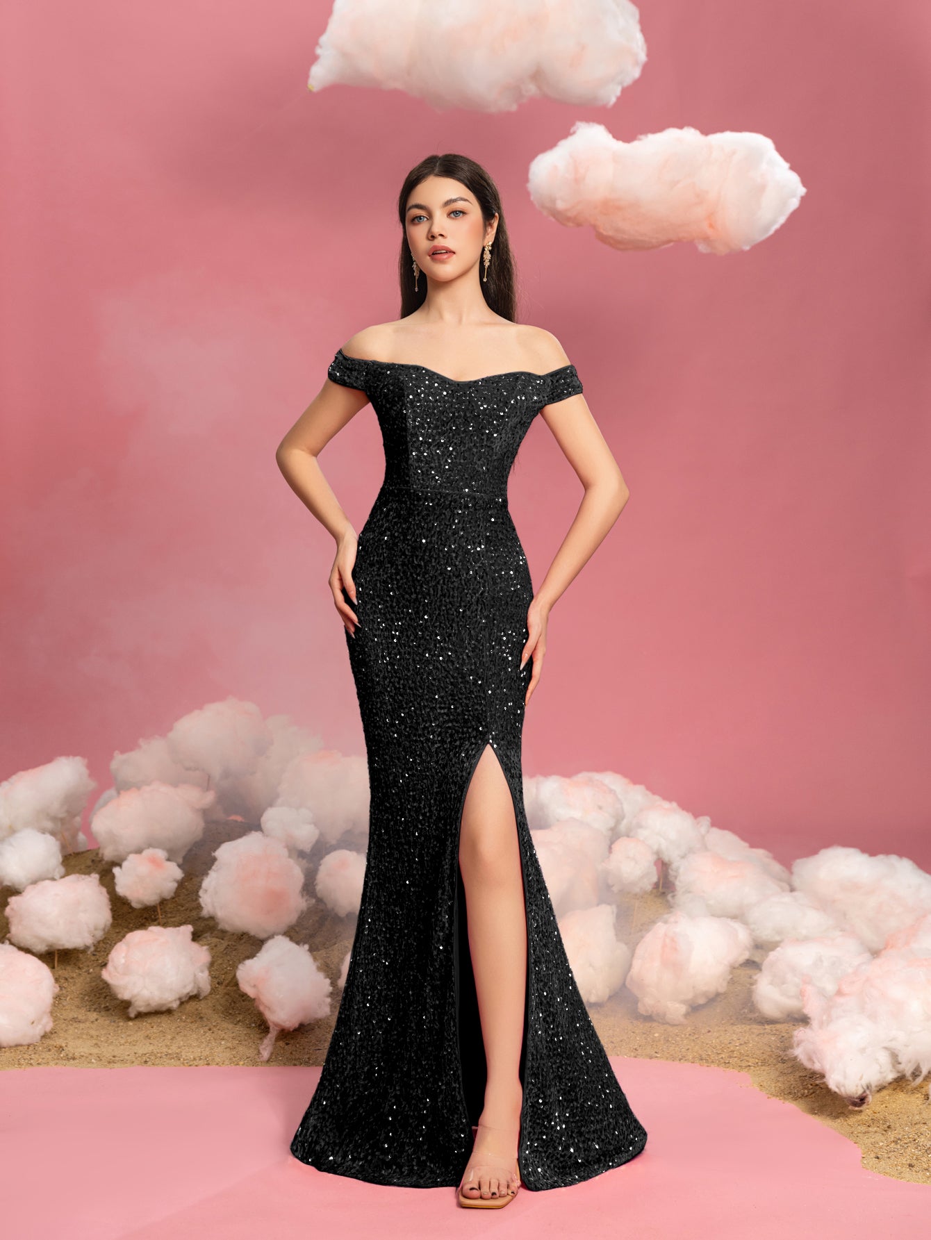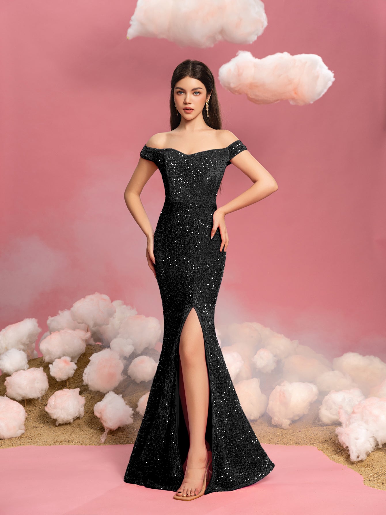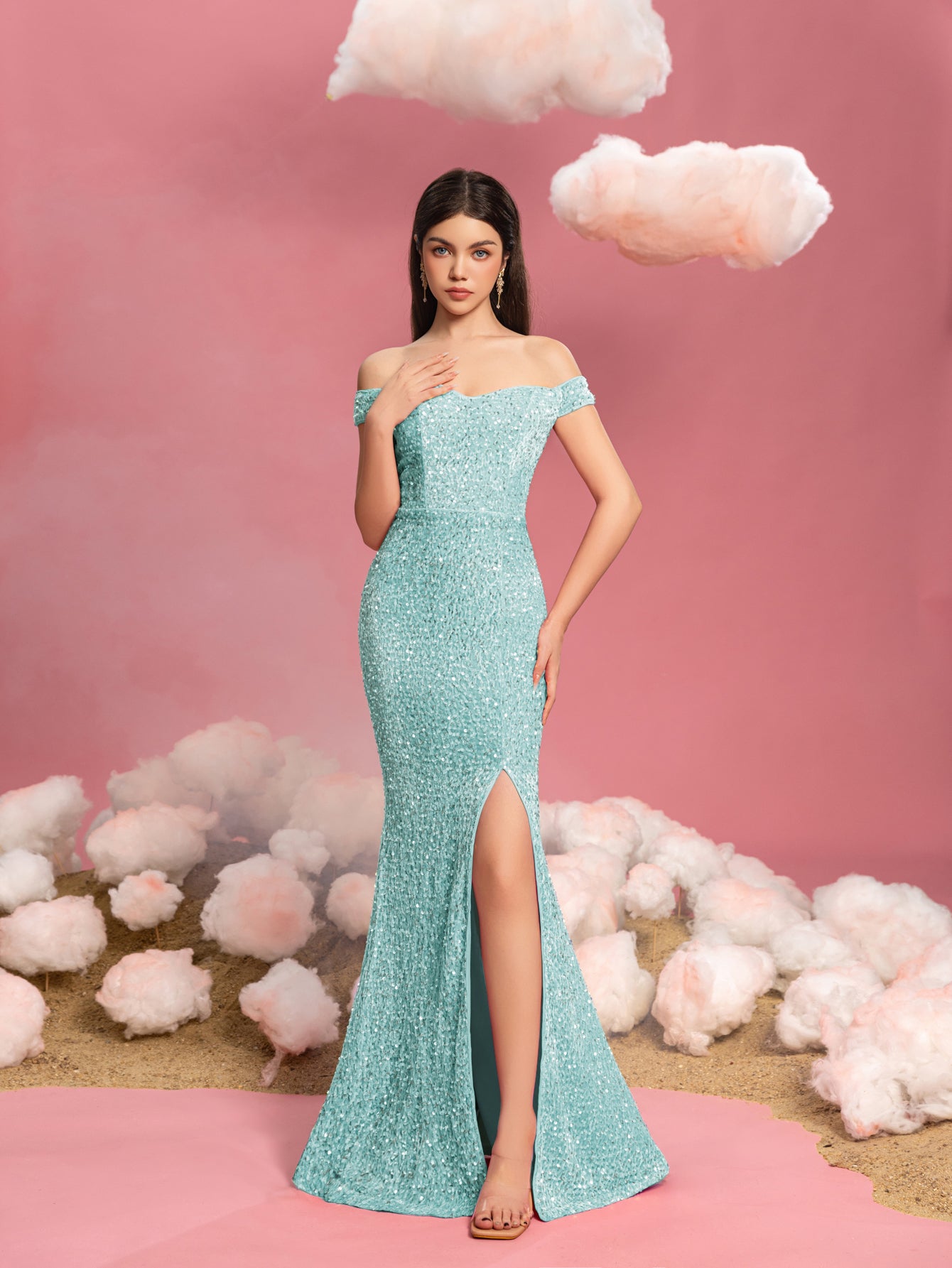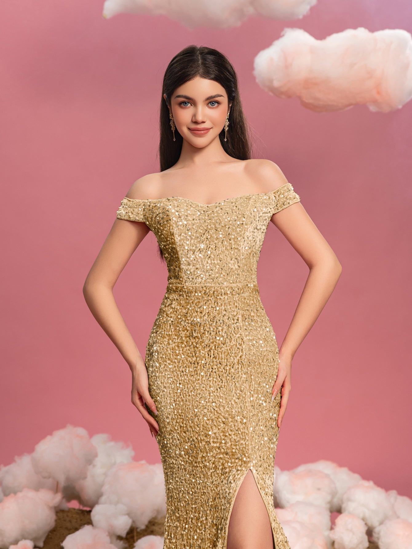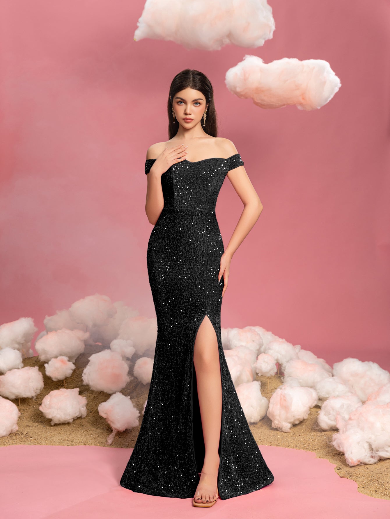 Elevate your elegance with our stunning sequined gown, perfect for making a statement at any glamorous event. The gown boasts an off-shoulder neckline that accentuates your neckline, paired with a figure-hugging silhouette that flatters your curves. The floor-length design features a daring thigh-high slit, adding a touch of allure and sophistication.