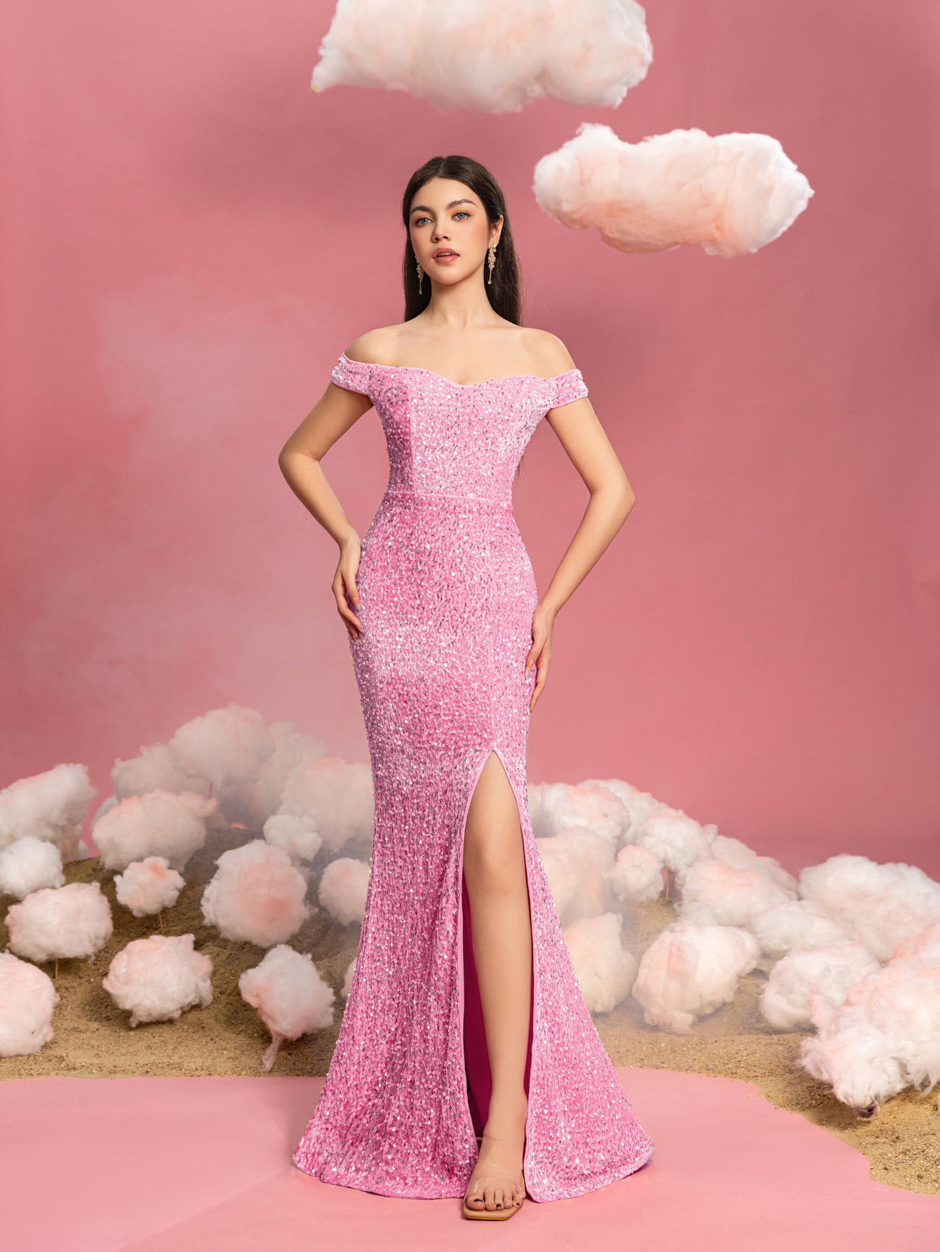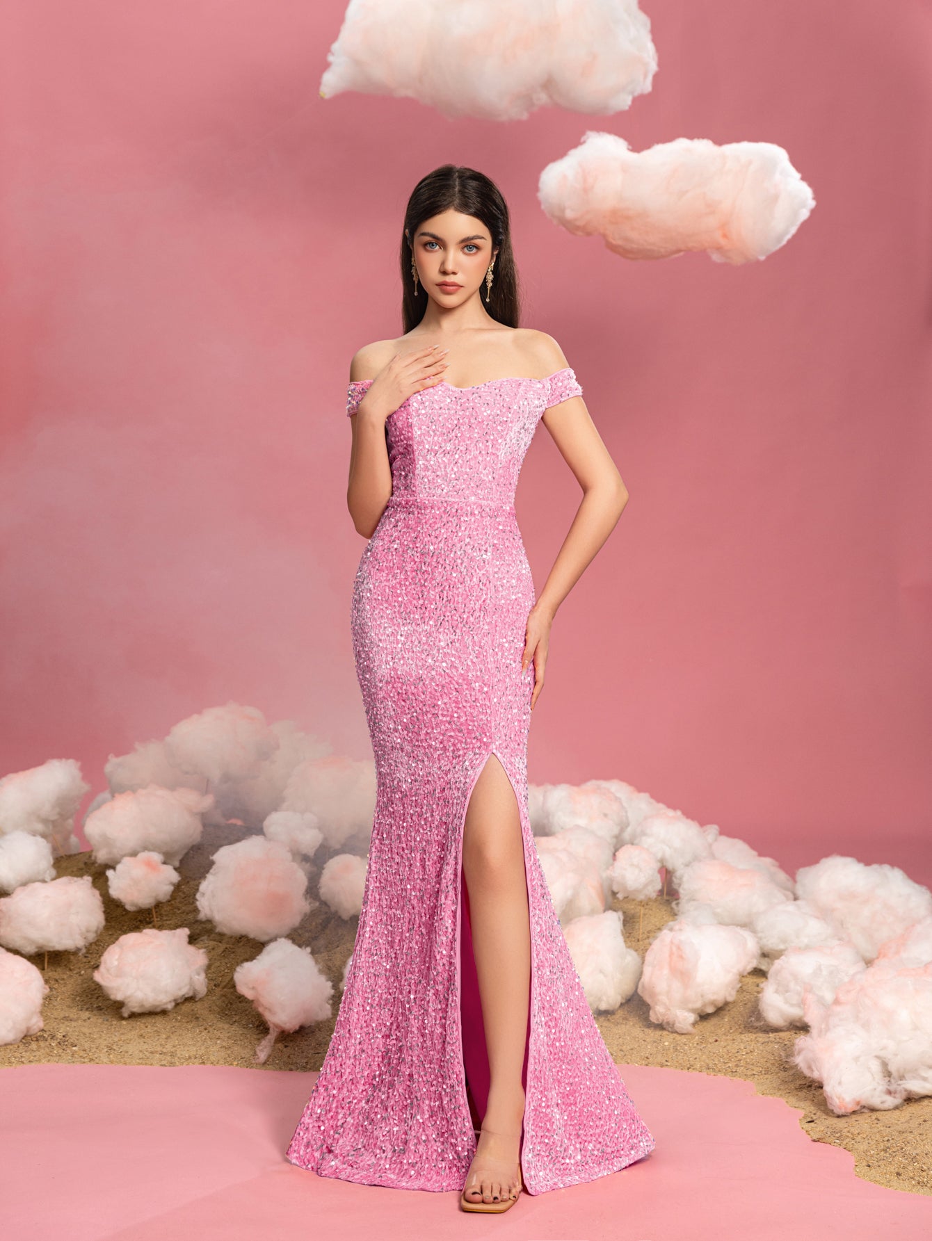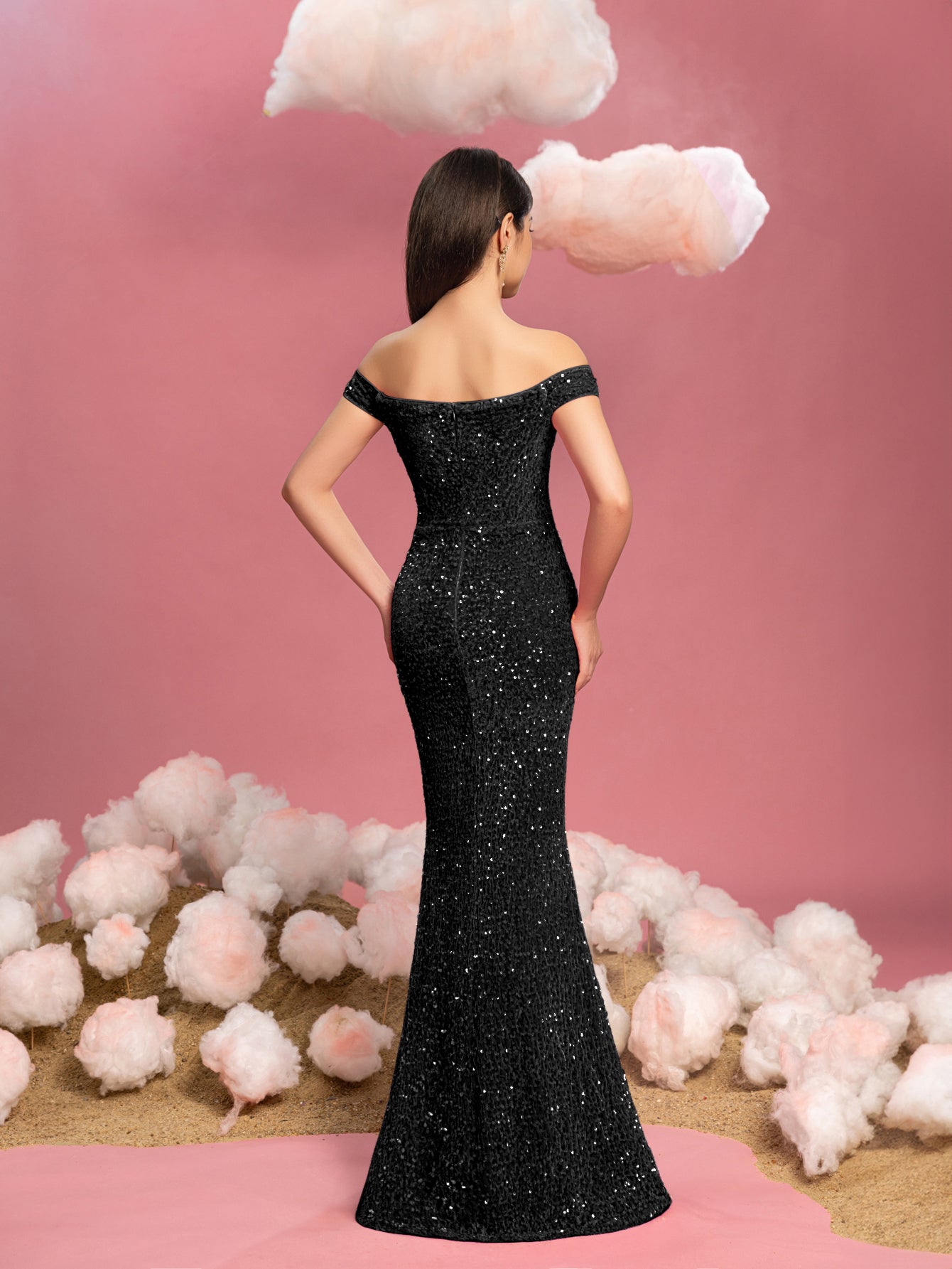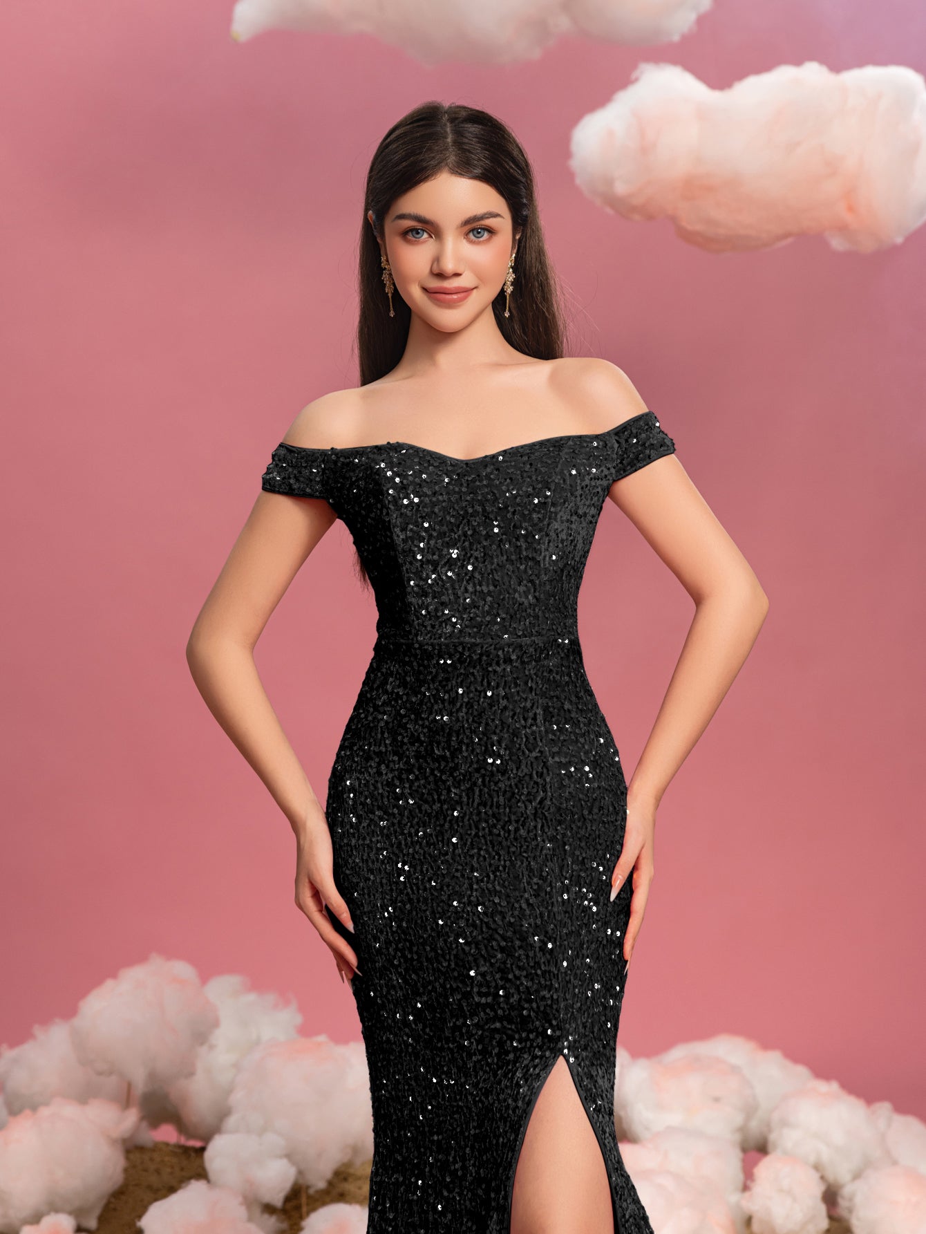 Elevate your elegance with our stunning sequined gown, perfect for making a statement at any glamorous event. The gown boasts an off-shoulder neckline that accentuates your neckline, paired with a figure-hugging silhouette that flatters your curves. The floor-length design features a daring thigh-high slit, adding a touch of allure and sophistication.