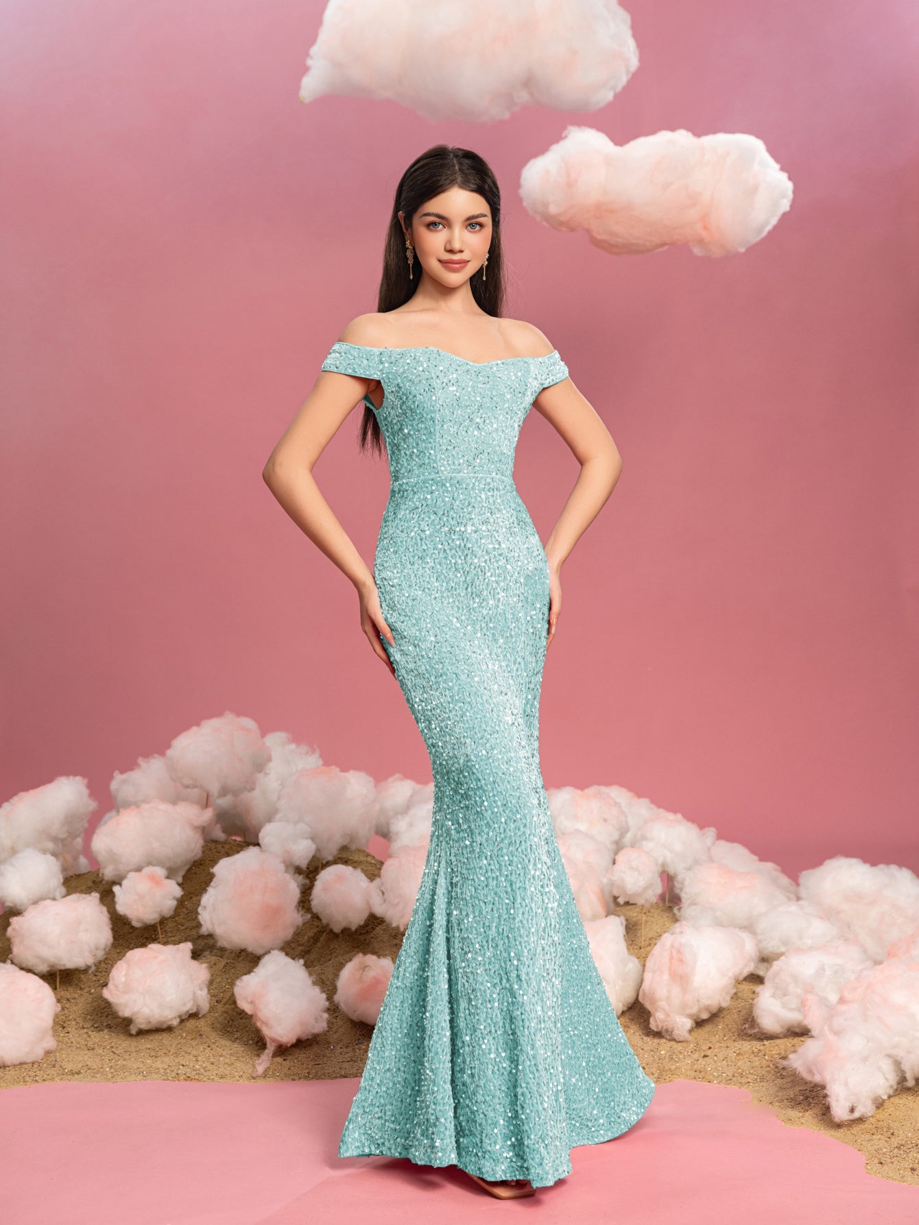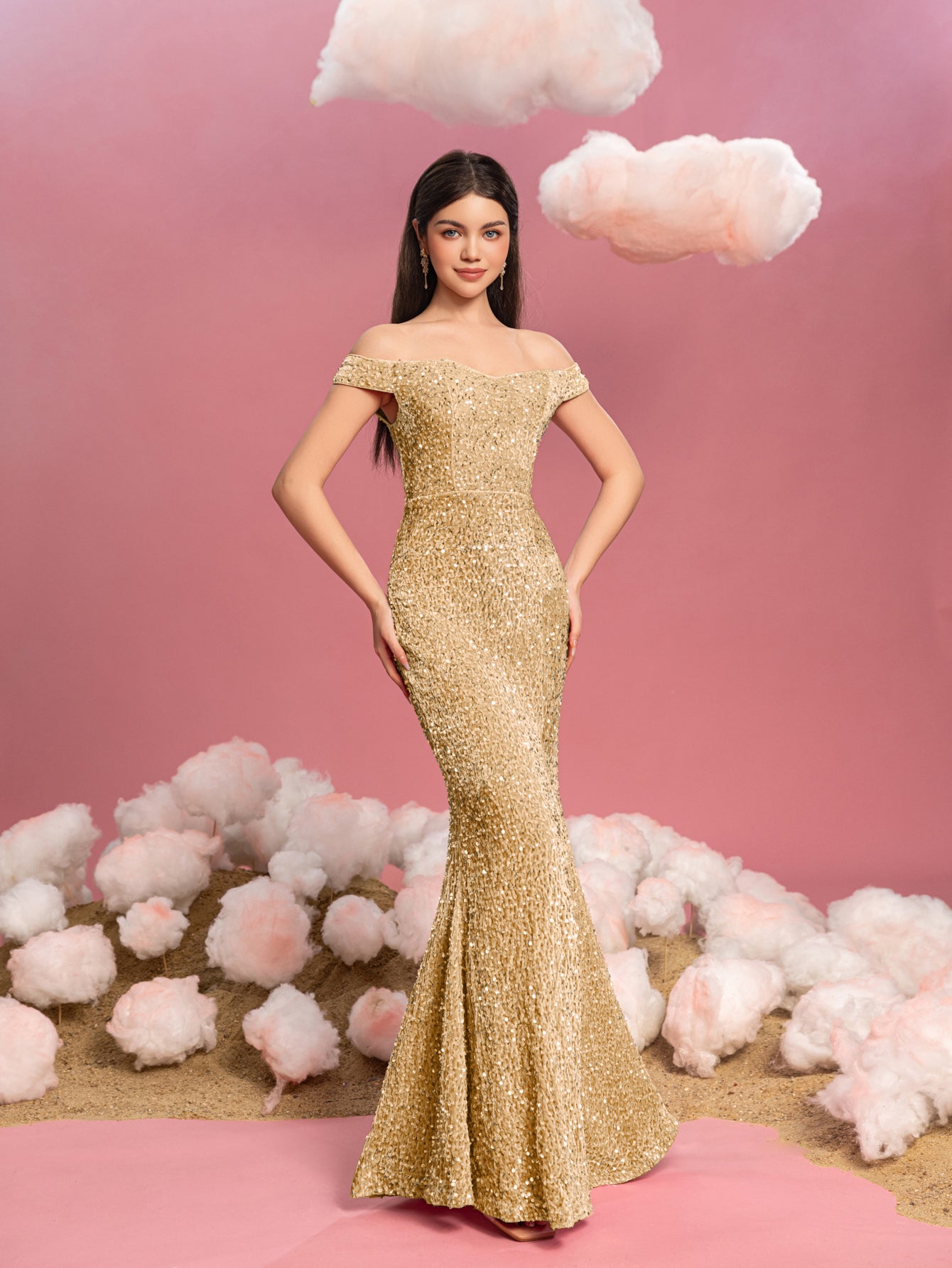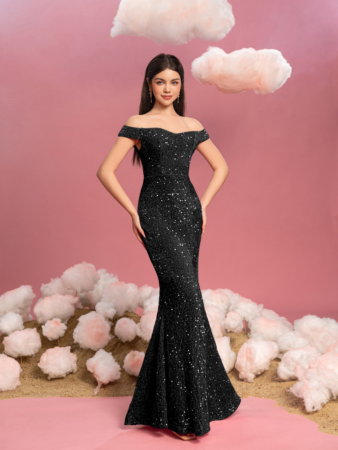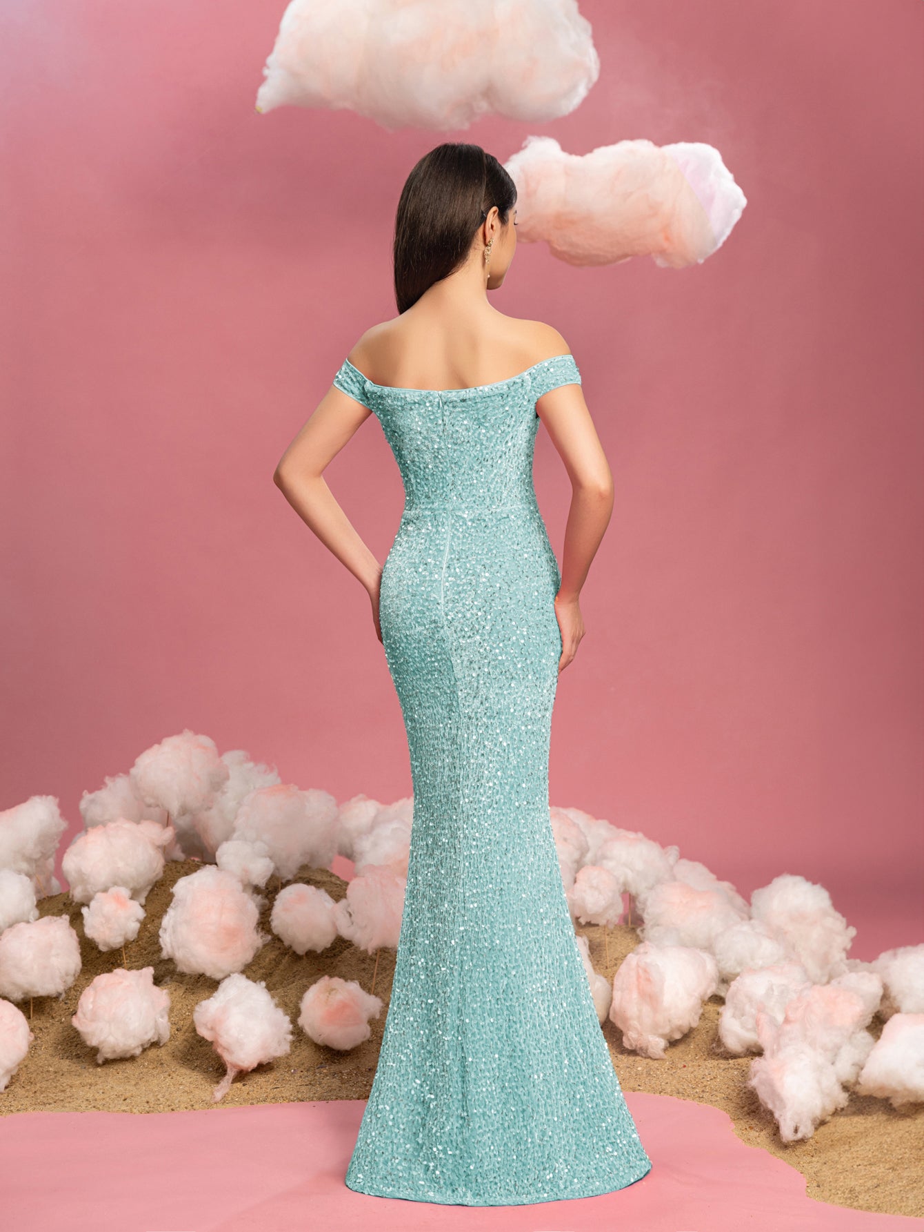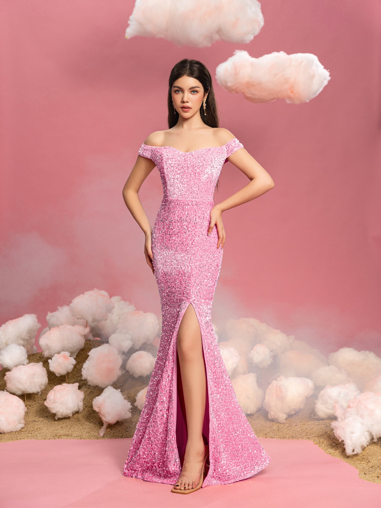 Elevate your elegance with our stunning sequined gown, perfect for making a statement at any glamorous event. The gown boasts an off-shoulder neckline that accentuates your neckline, paired with a figure-hugging silhouette that flatters your curves. The floor-length design features a daring thigh-high slit, adding a touch of allure and sophistication.