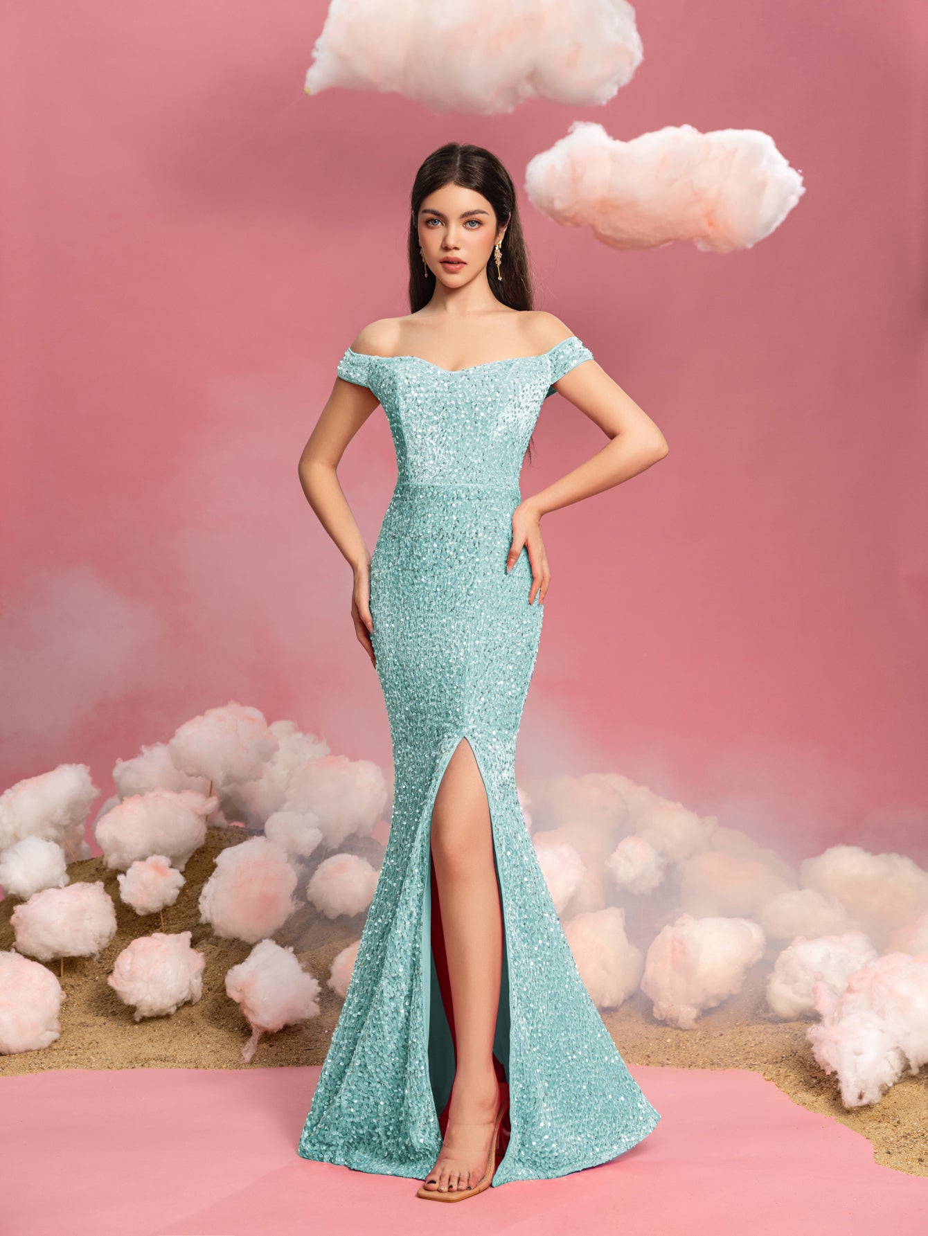 Teen Girls' Elegant Off Shoulder Split Mermaid Hem Sequin Party Dress