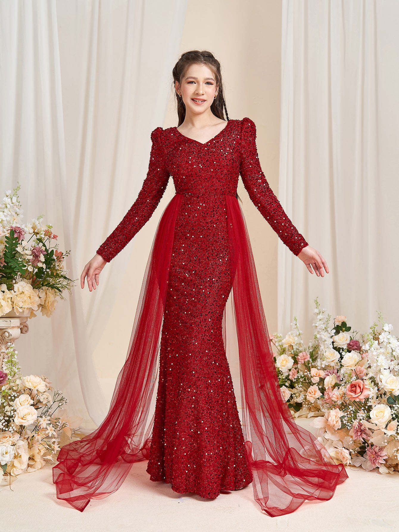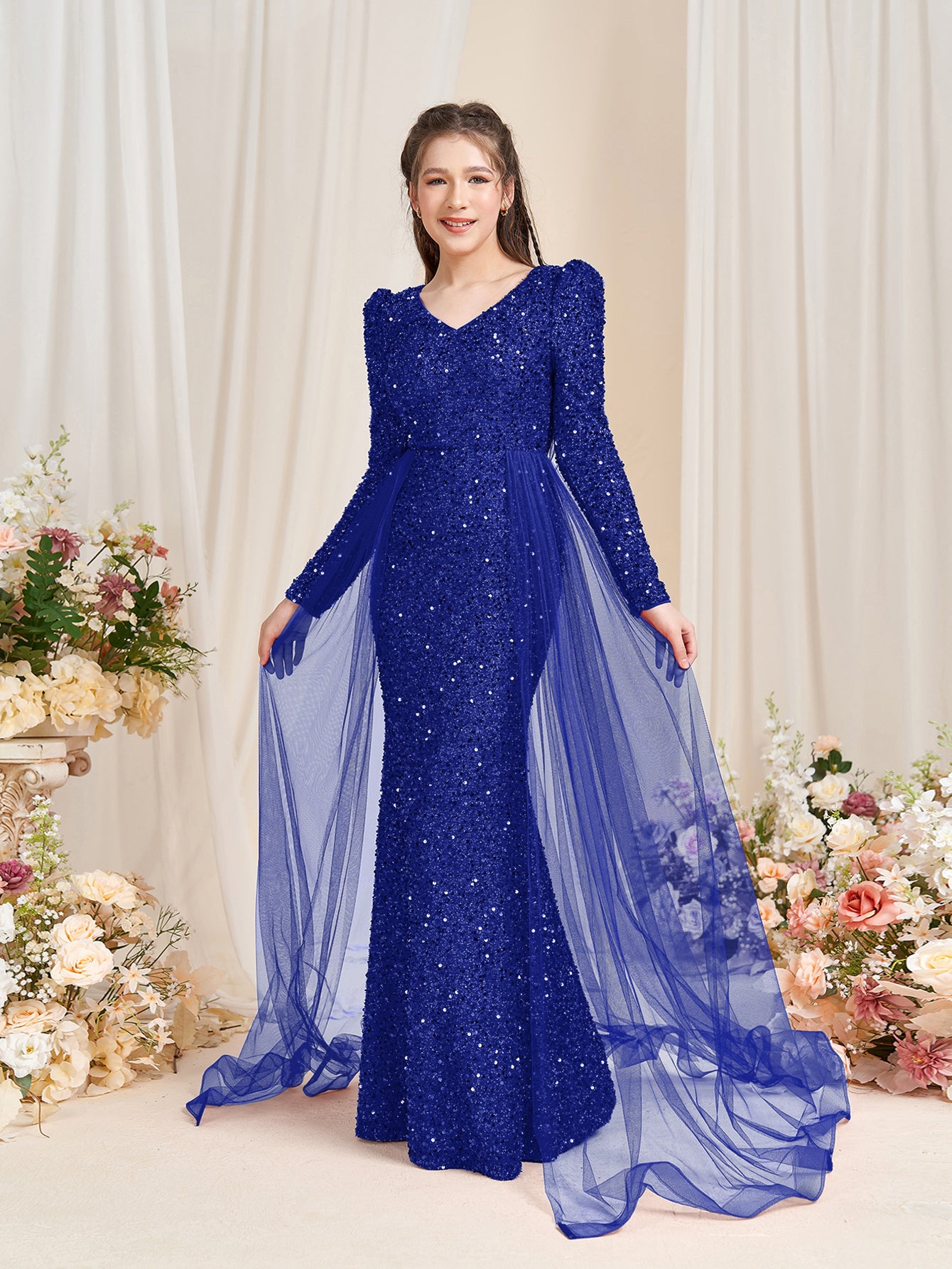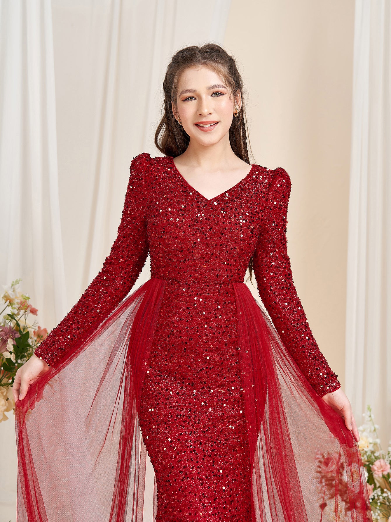 Teen Girls' Long Sleeves Mesh Overlay Sequin Mermaid Dress