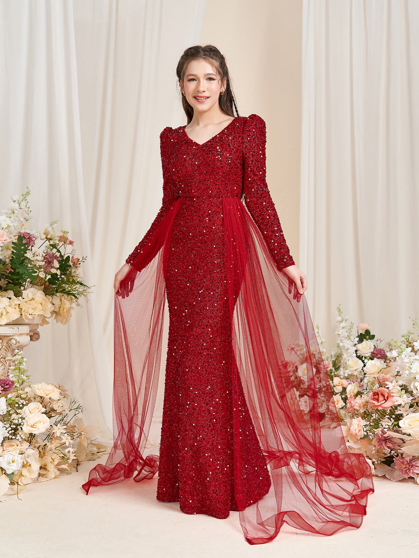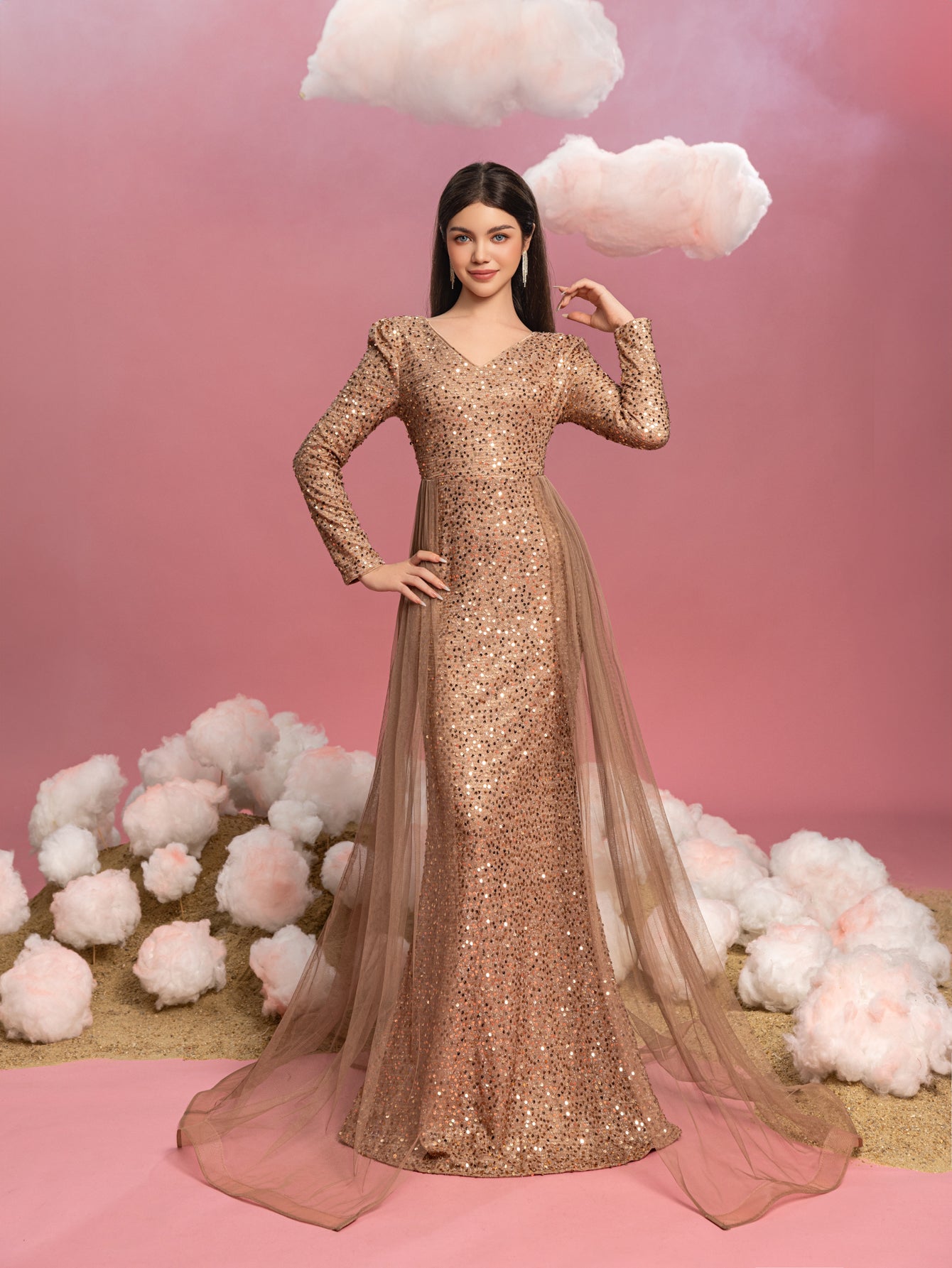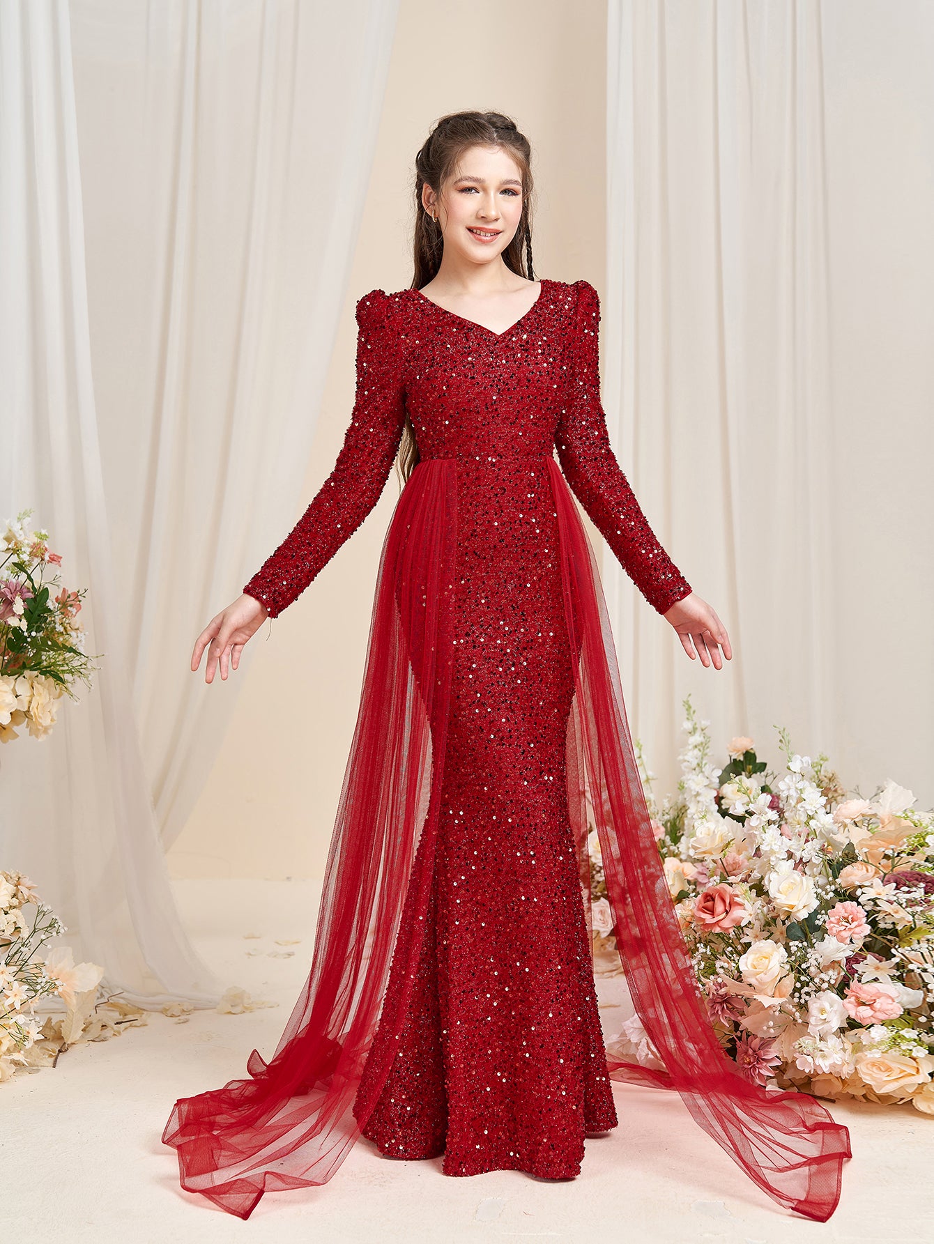 Step into a world of elegance and charm with our exquisite sequin gown, designed to make every girl feel like a princess. The gown features a V-neckline and a figure-flattering silhouette that flows gracefully to the floor, ensuring comfort and grace. The luxurious sequined fabric paired with delicate tulle creates a dreamy and glamorous look, enhanced by the intricate sequin details throughout the dress.