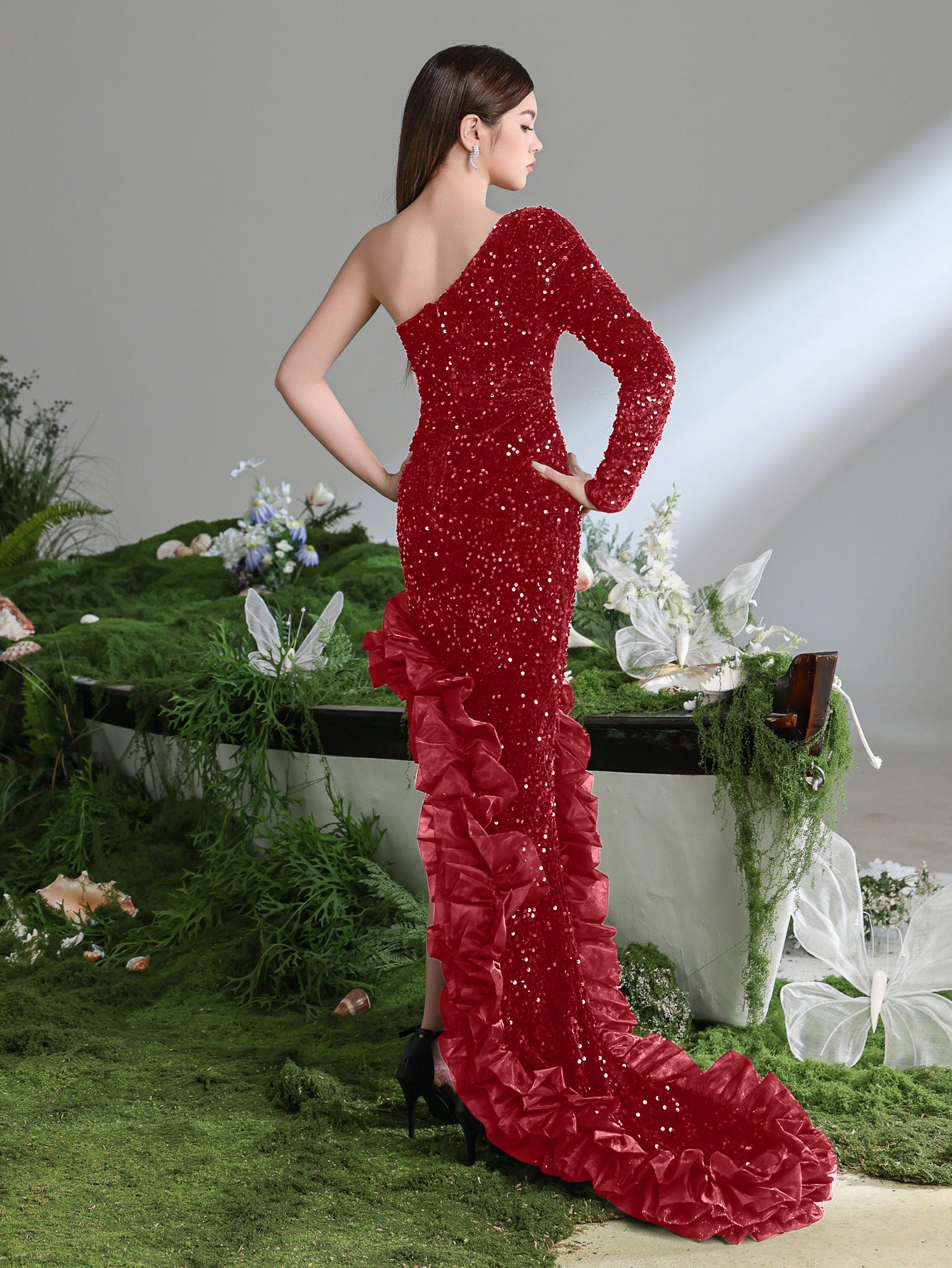 Elevate your evening look with our stunning evening gown, perfect for any formal occasion. The gown features a one-shoulder neckline that adds a touch of sophistication and allure. The figure-hugging silhouette accentuates your curves, while the cascading ruffle details along the skirt add a dramatic flair. The dress is crafted from a luxurious fabric that sparkles under the light, ensuring you stand out from the crowd.