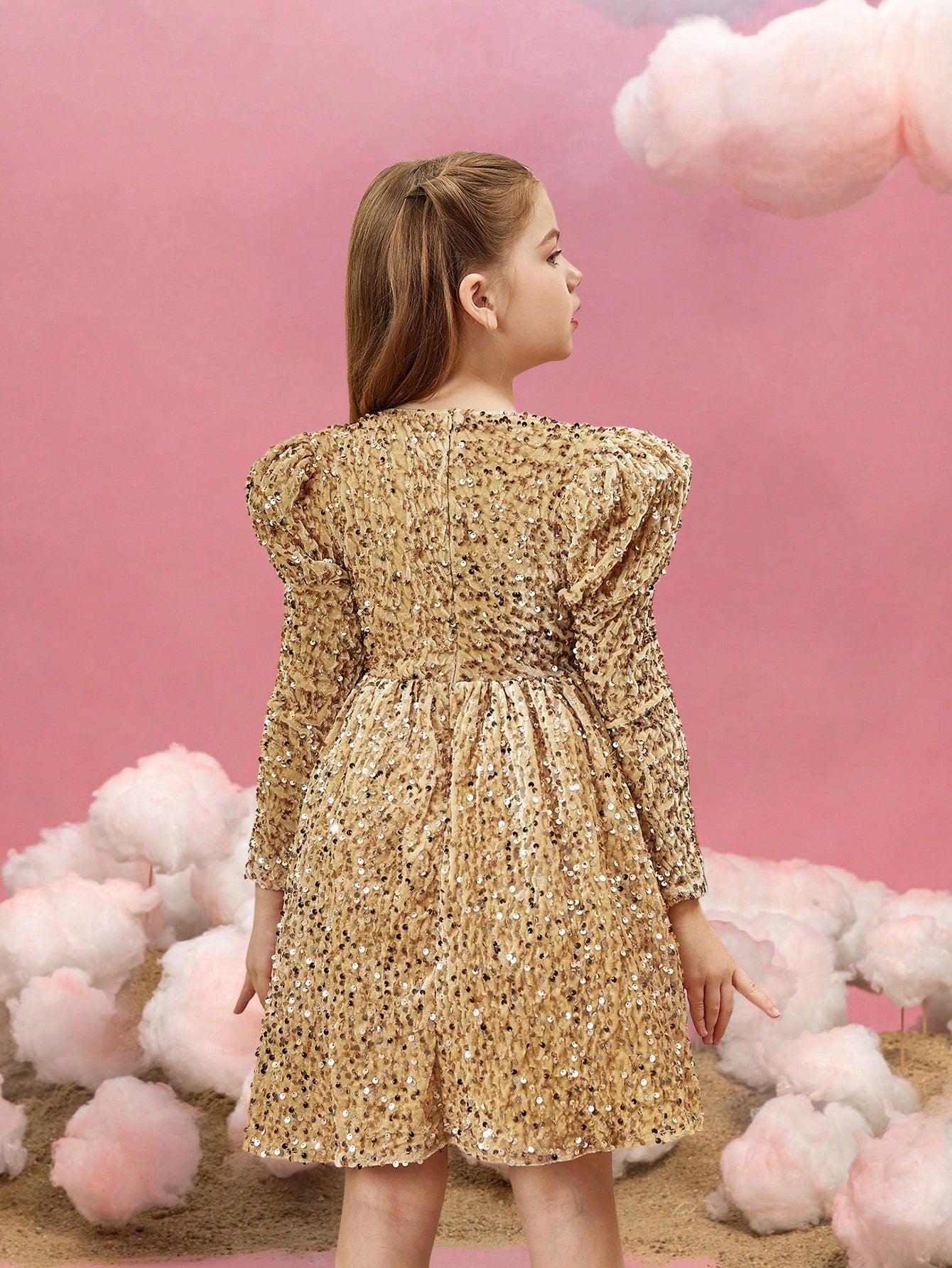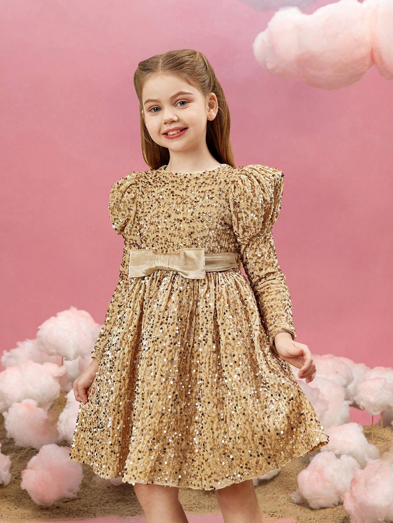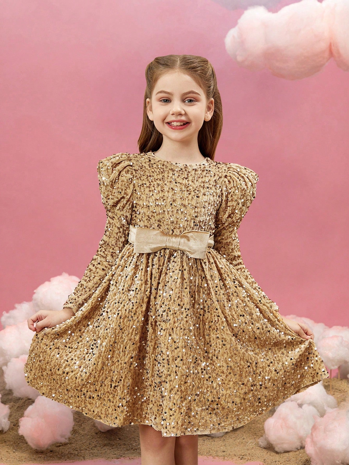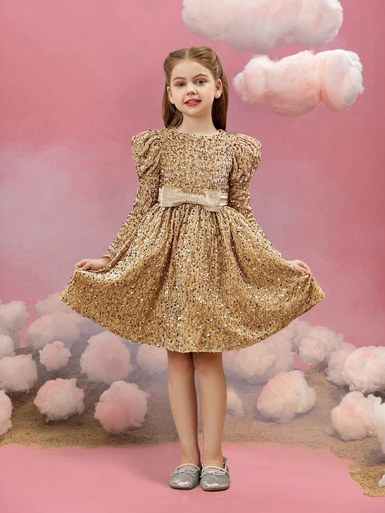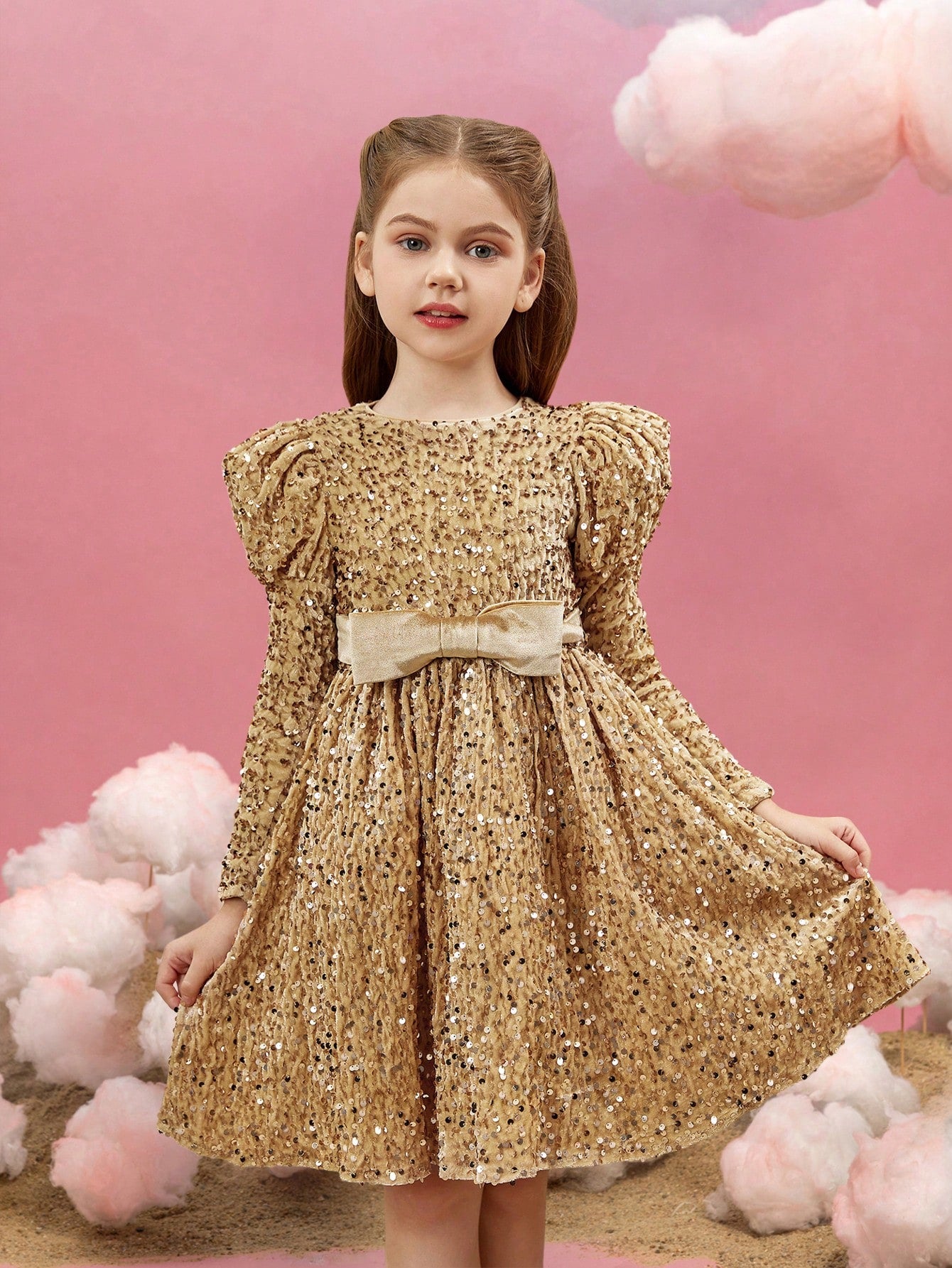 Tween Girls' Gigot Sleeve Bow Decor Sequin Midi Dress - Elonnashop