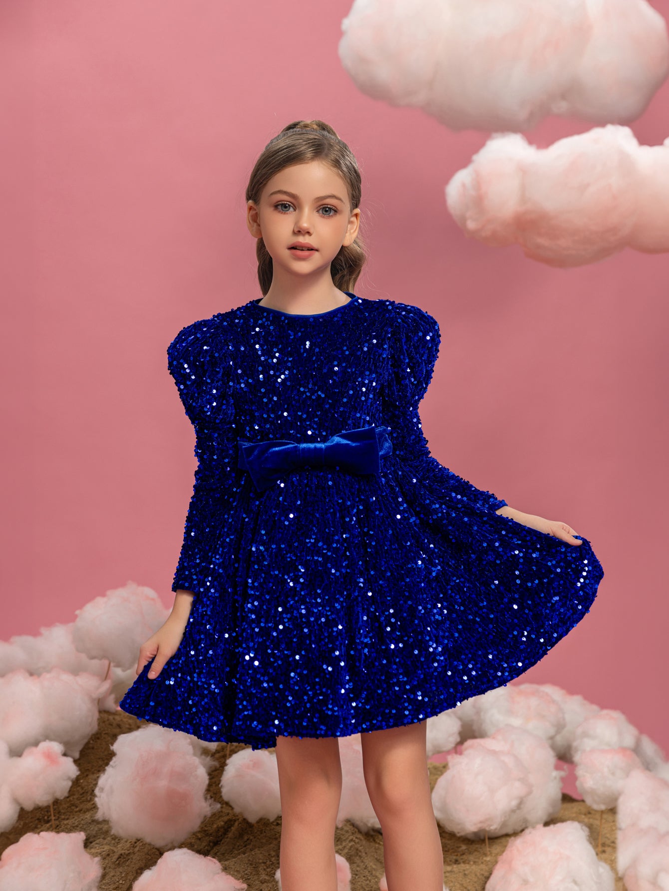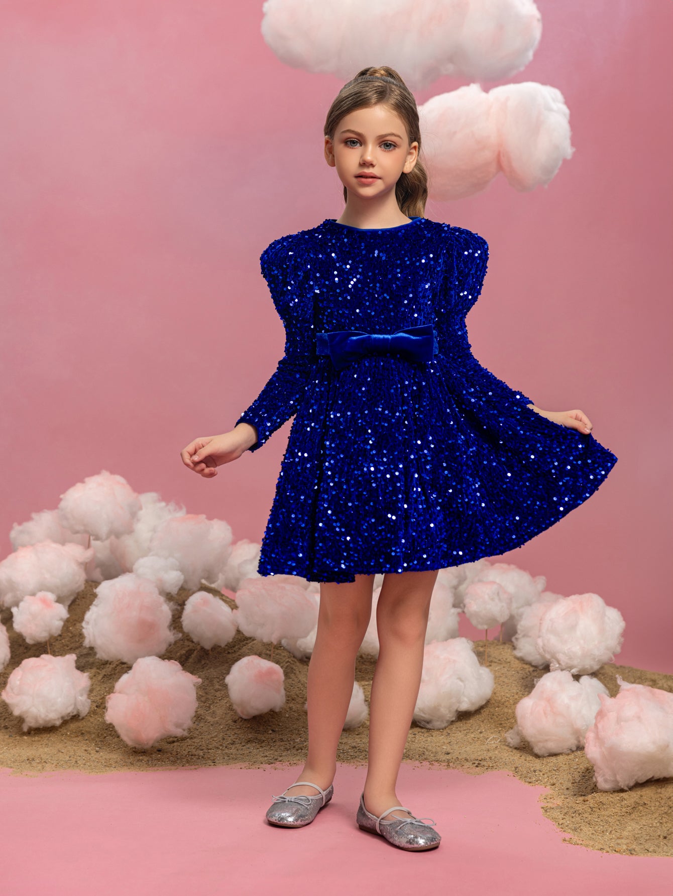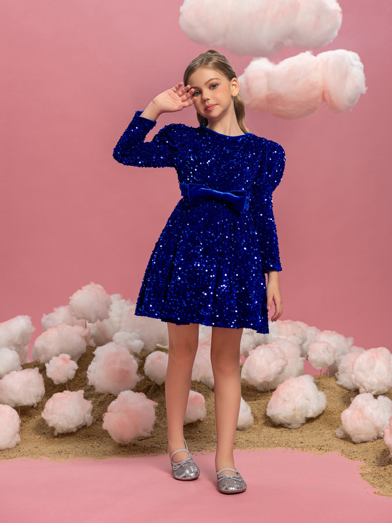 She's the night sky in motion in this enchanting sapphire blue sequin dress. With a fabric that mirrors the gleam of stars against the evening canvas, every sequin twinkles with the promise of wishes waiting to be made. The full skirt flares out like a constellation, ready to guide her through grand halls and magical moments alike. The dress's gathered waist is accented with a velvet bow, the perfect anchor to the celestial display above. She won't just be attending the event—she'll be the celestial event, a spectacle of dreams and beauty in her own right.