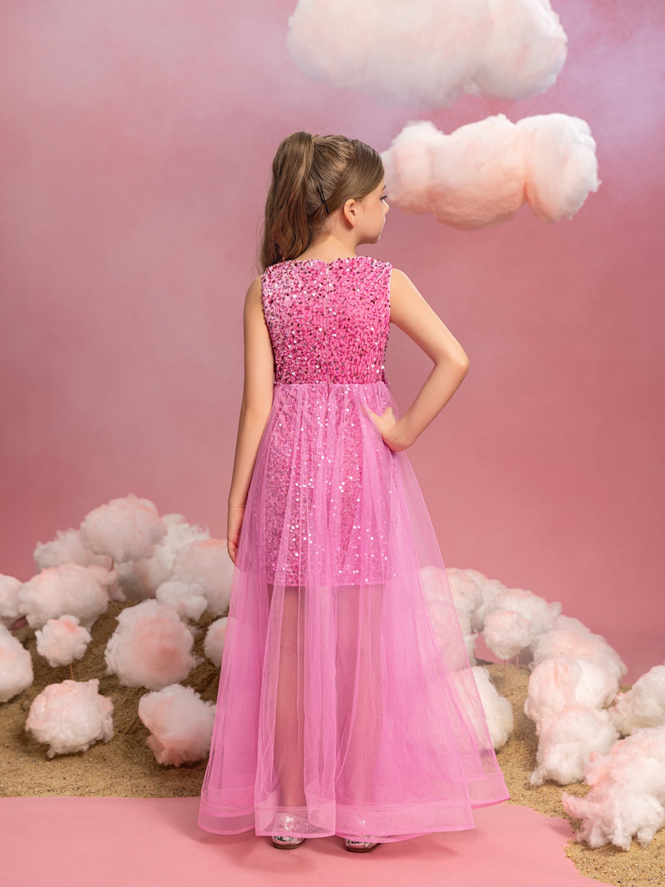 Infuse any occasion with a burst of joy and color in this vibrant pink sequin dress, complete with a flowing tulle cape that adds a superheroine touch to the classic party look. The fitted sequin bodice sparkles with every giggle and twirl, while the sheer pink cape flows majestically behind, making her feel like the star of her own story. This dress is perfect for birthday parties, dress-up days, or any event where a little extra fun and flair are on the agenda. She'll be ready to soar into her next adventure with style and confidence!