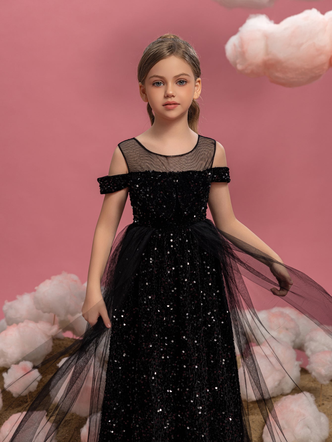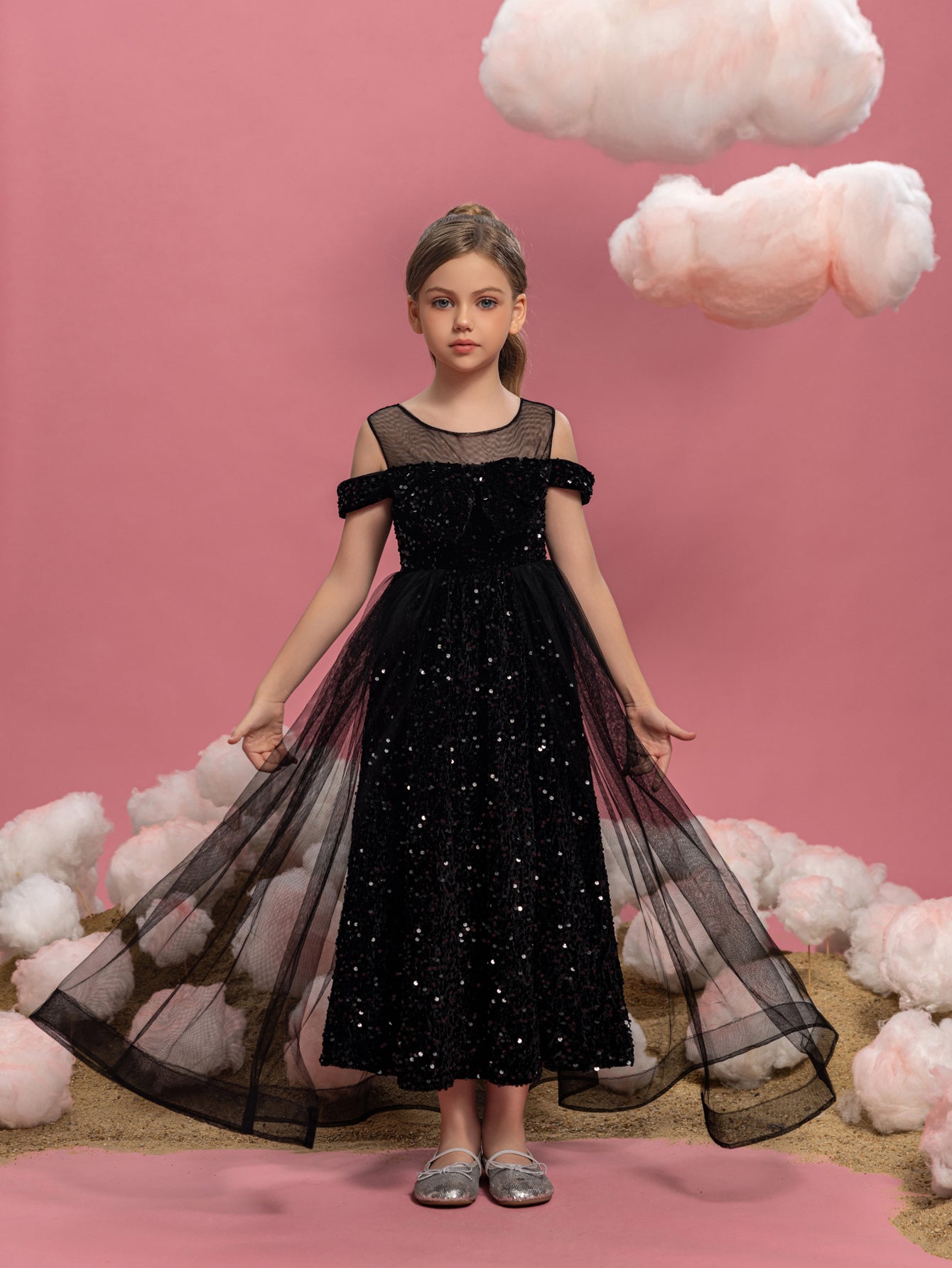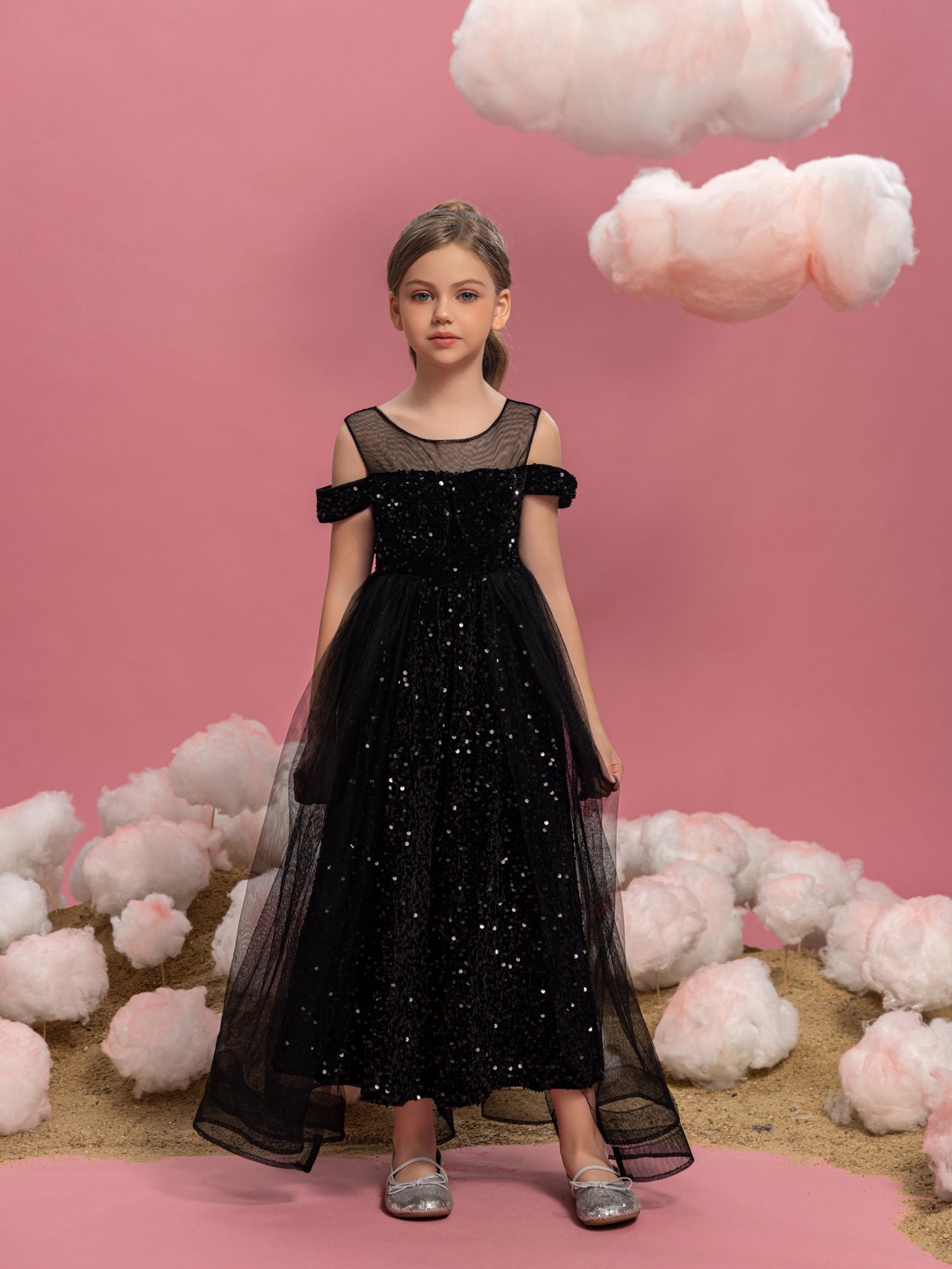 This dress is like a midnight sky lit up by twinkling stars, designed for the little dreamer who loves to shine. The sequined bodice catches every glimmer of light, paired with a sheer tulle overlay that adds a layer of mystique and grace. The off-shoulder sleeves, with their delicate edging, bring a touch of softness and sophistication to the gown's silhouette. It’s a magical ensemble for performances, celebrations, or whenever a child wishes to feel as special and unique as a starry night.