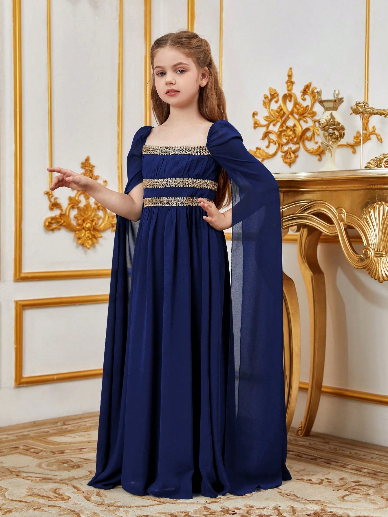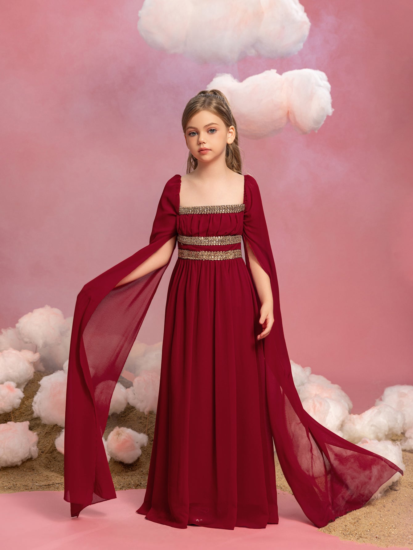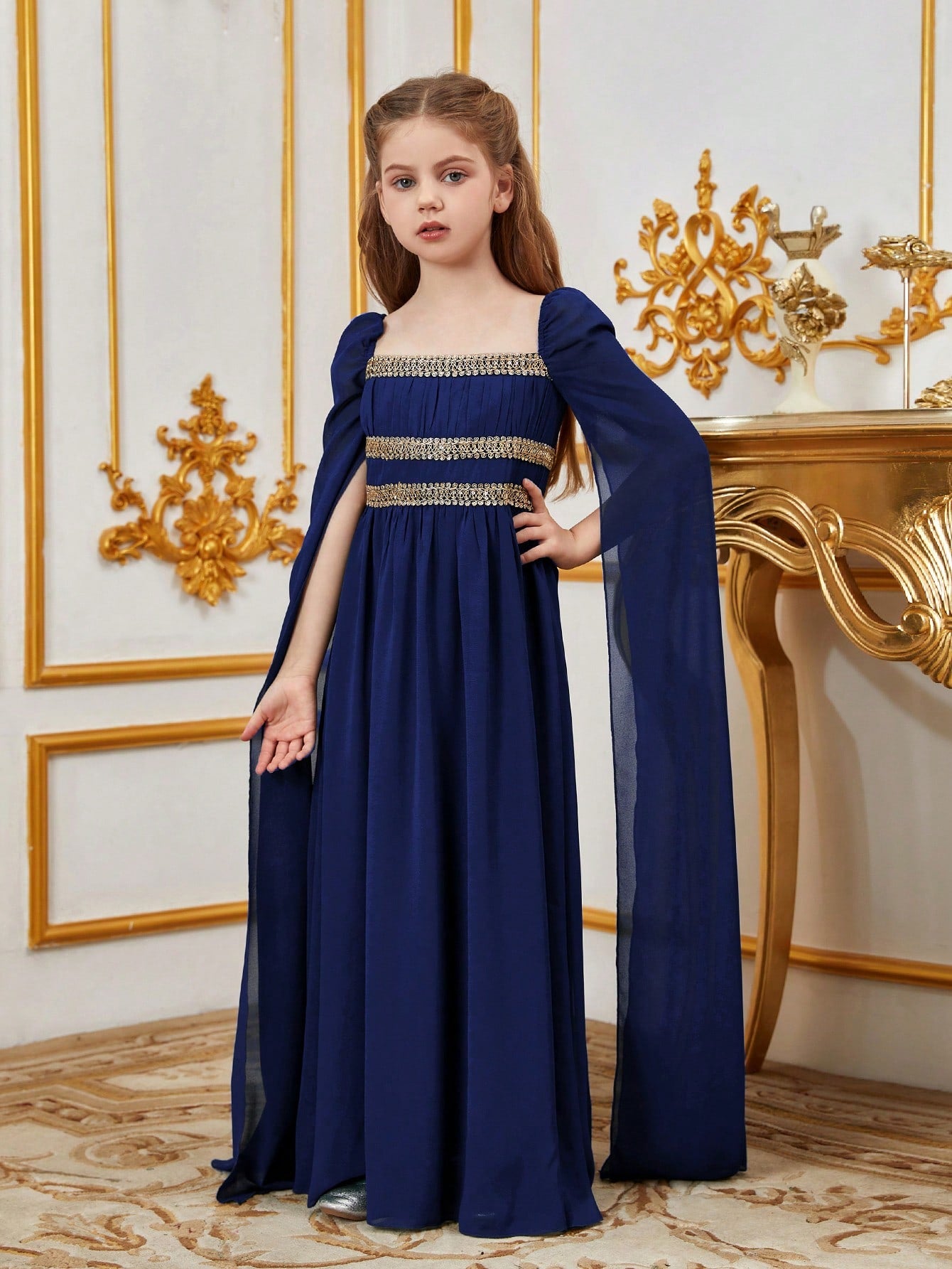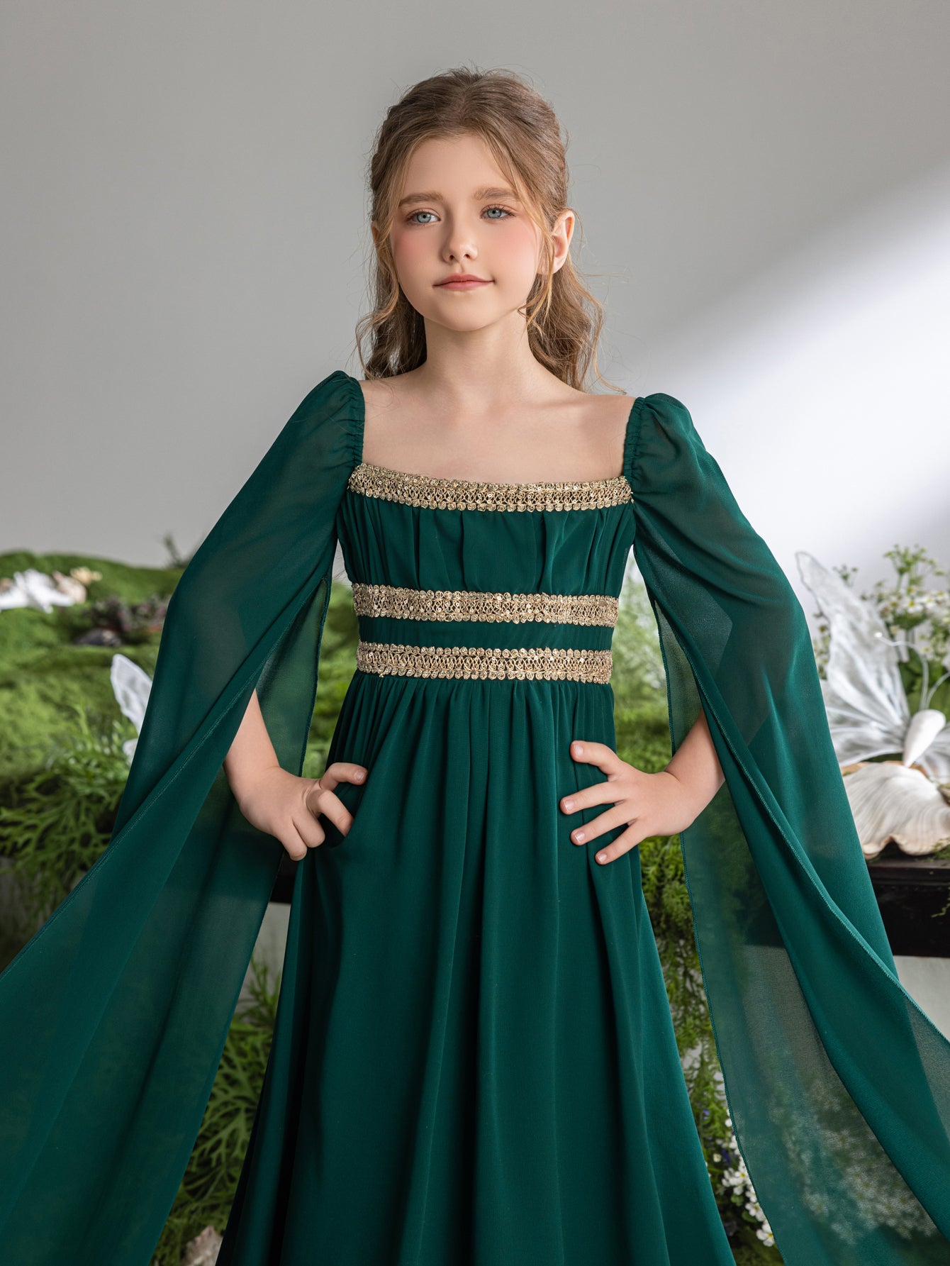 Tween Girls' Lace Trim Decoration Cape Sleeves Chiffon Party Dress