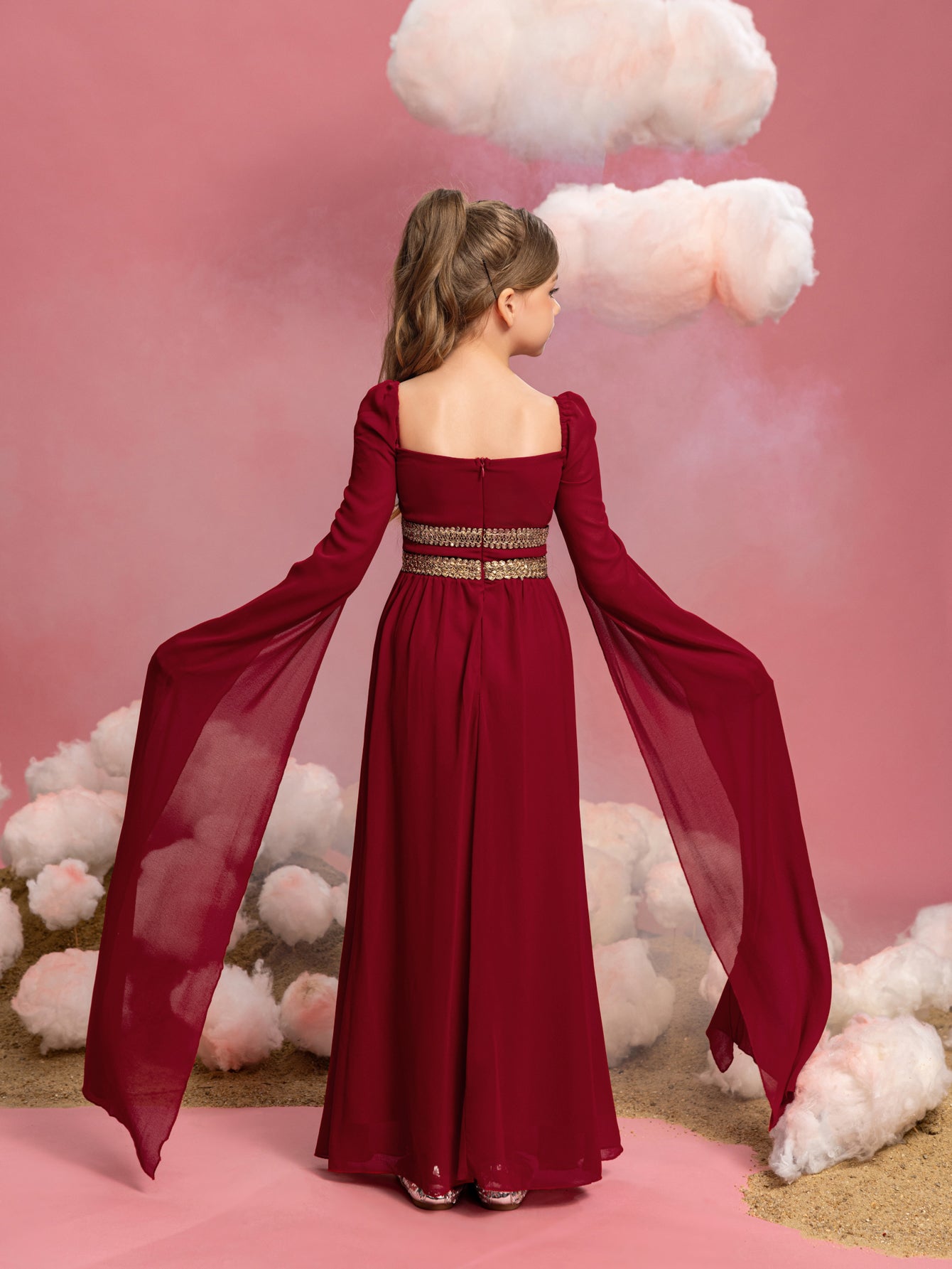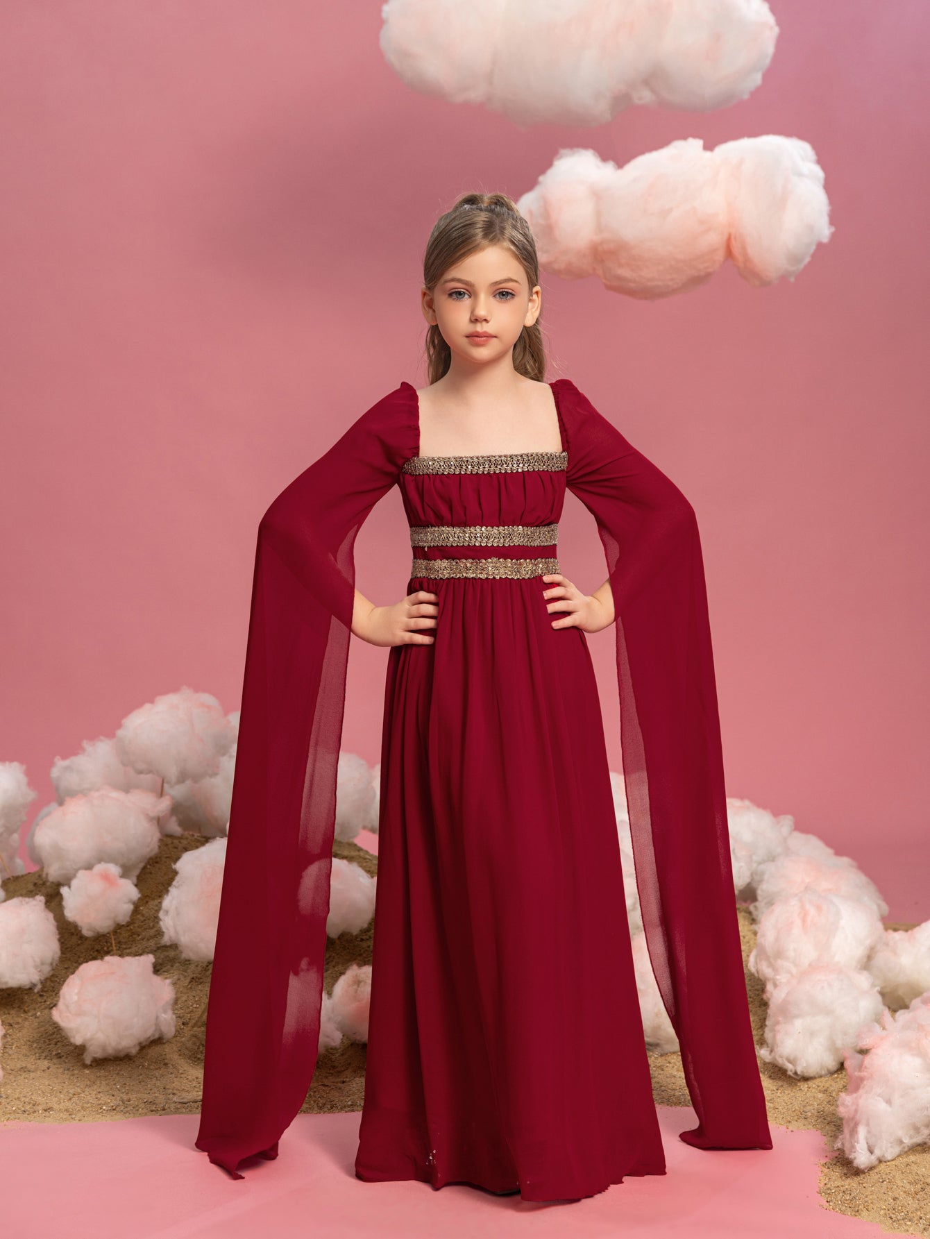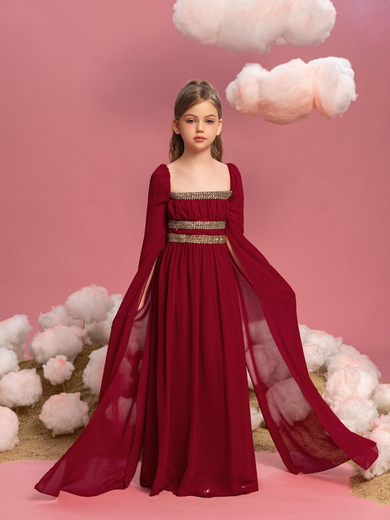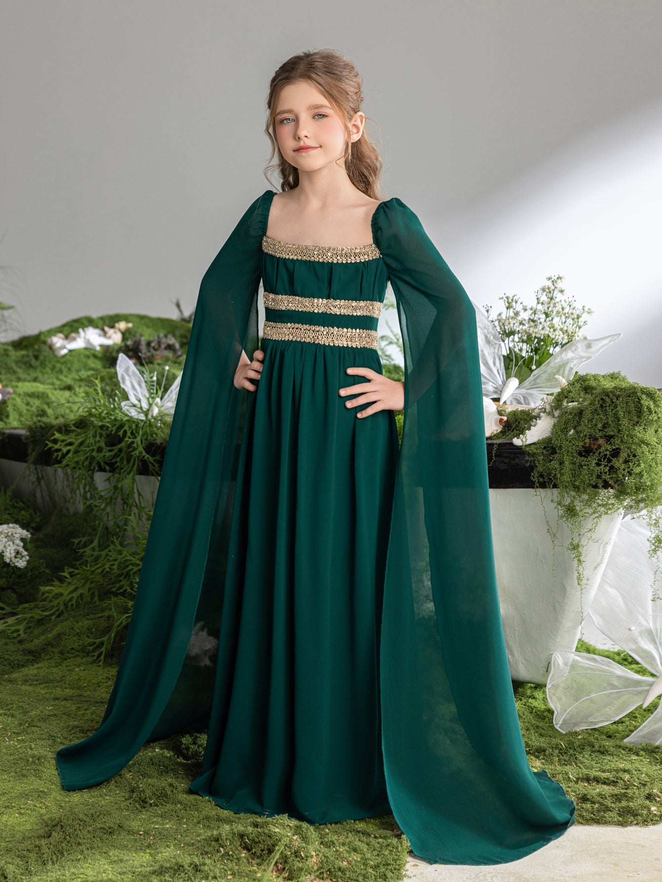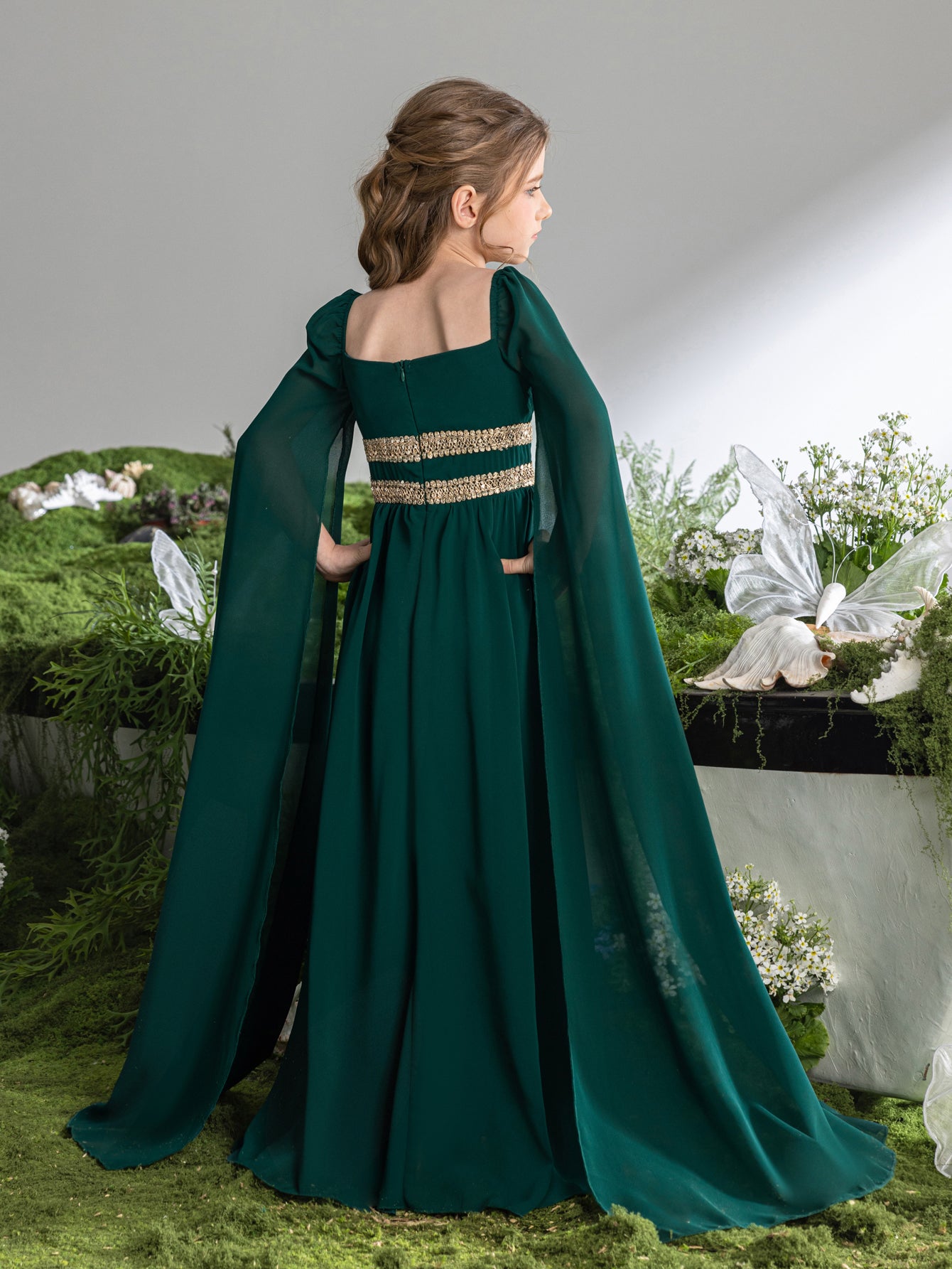 Step into a world of elegance and charm with our stunning children's gown, perfect for making a memorable impression at any special occasion. The gown boasts an off-shoulder neckline that exudes sophistication and a fitted bodice adorned with intricate gold embroidery, accentuating the waistline. The flowing skirt cascades into a dramatic train, complemented by a matching cape that adds a touch of regality.