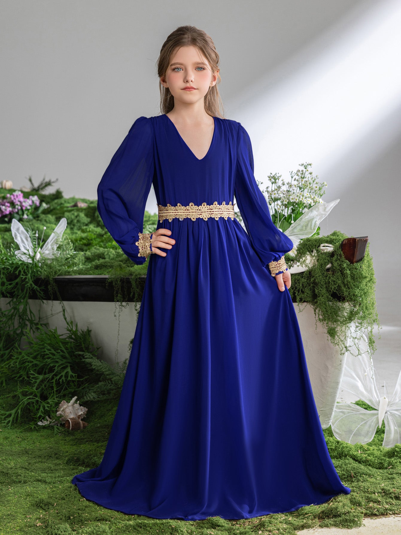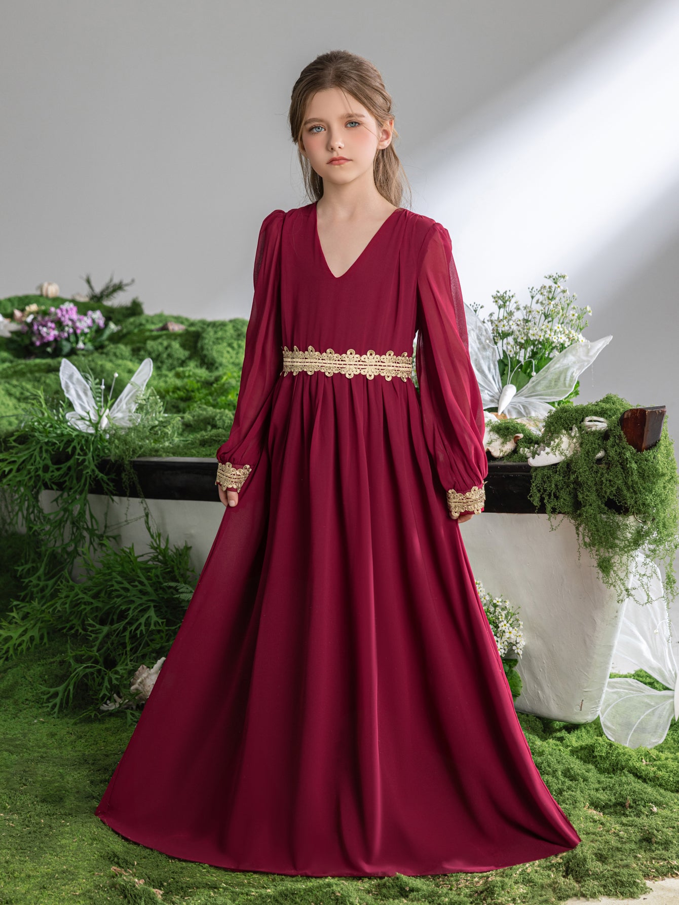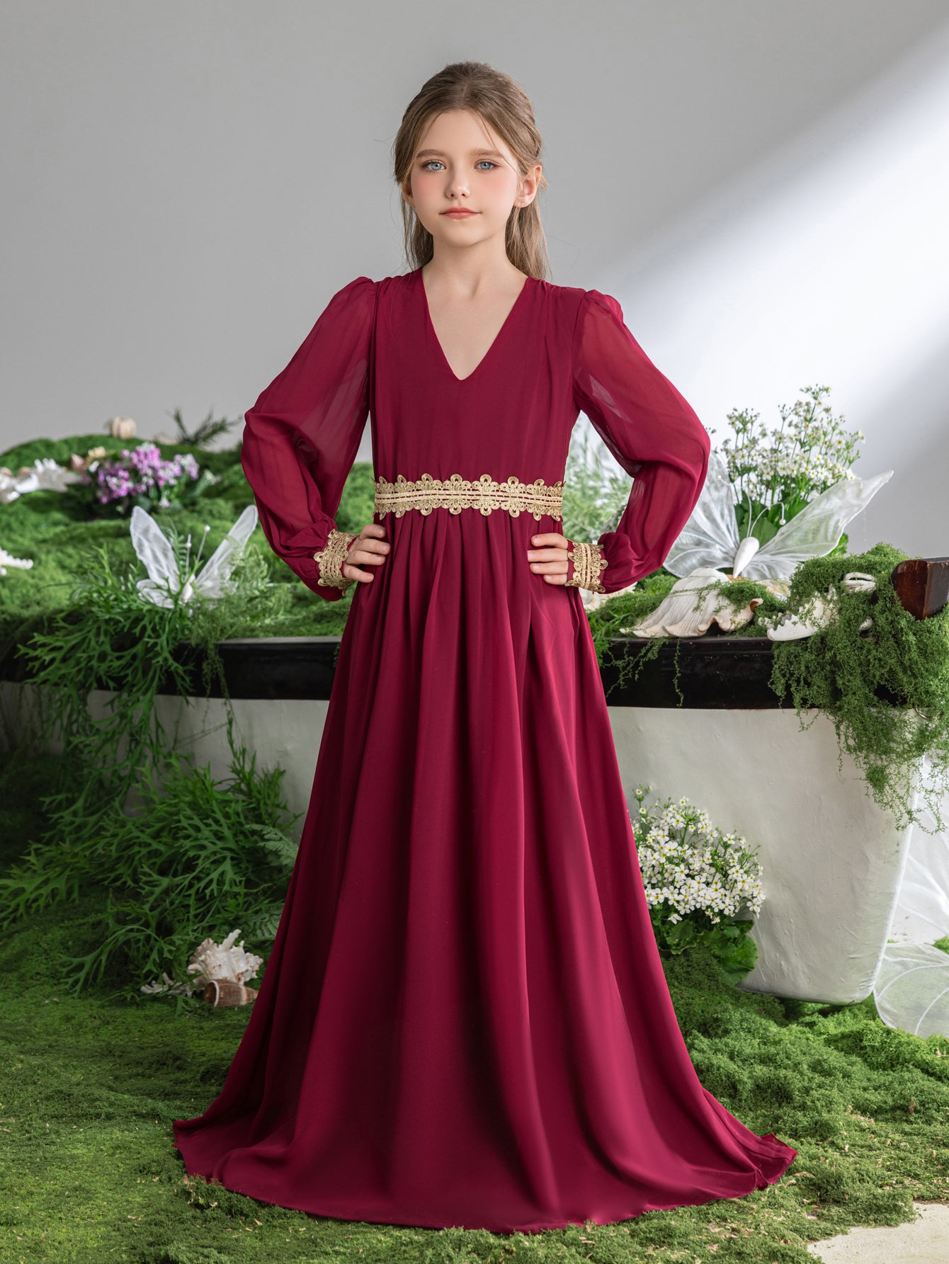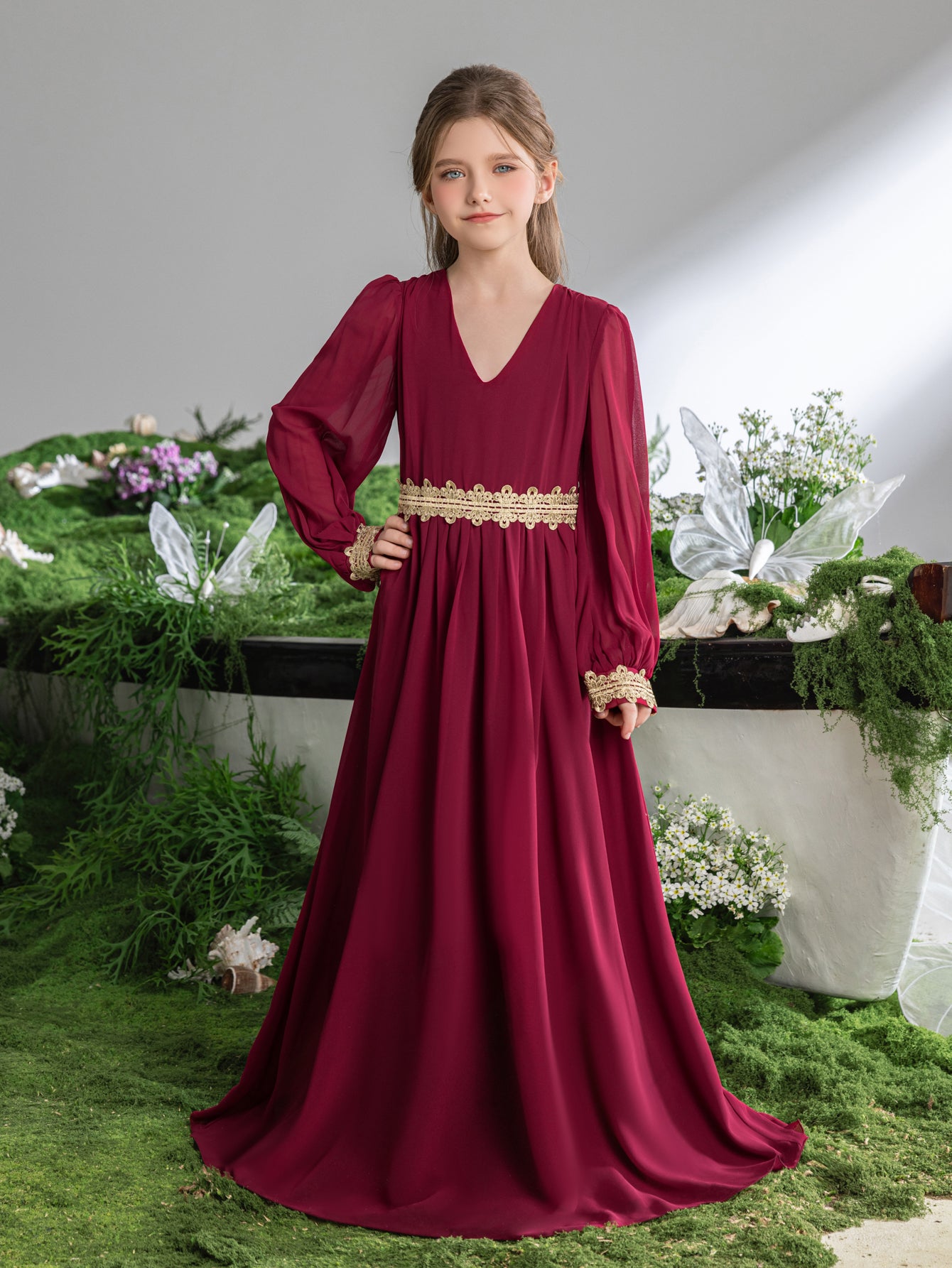 Tween Girls' Lace Trim Decoration V-neck Bishop Sleeves Chiffon Party Dress