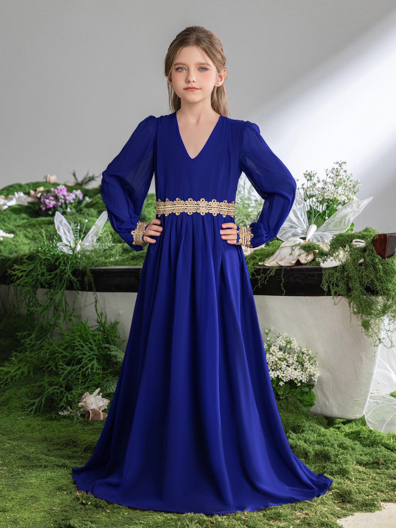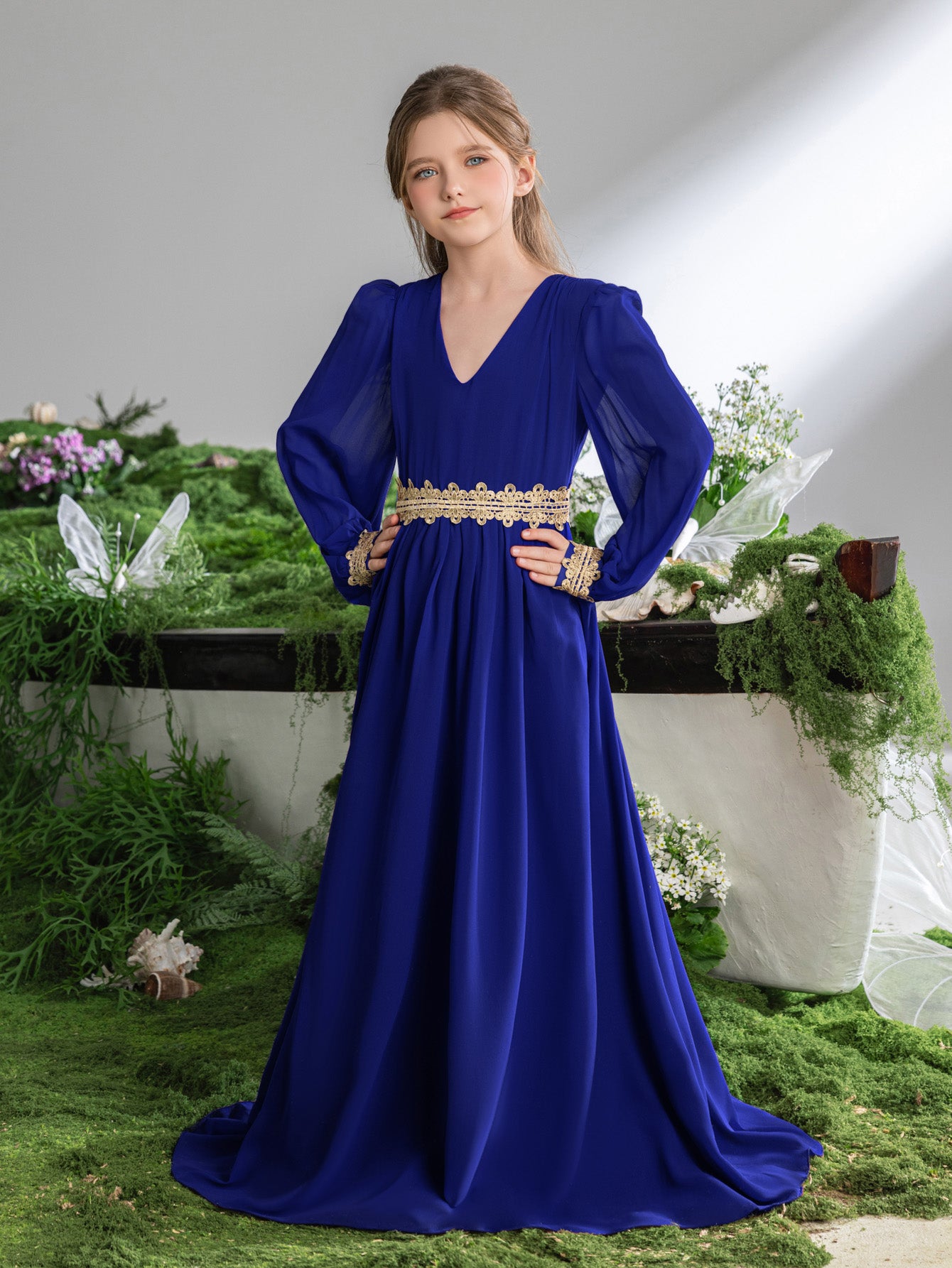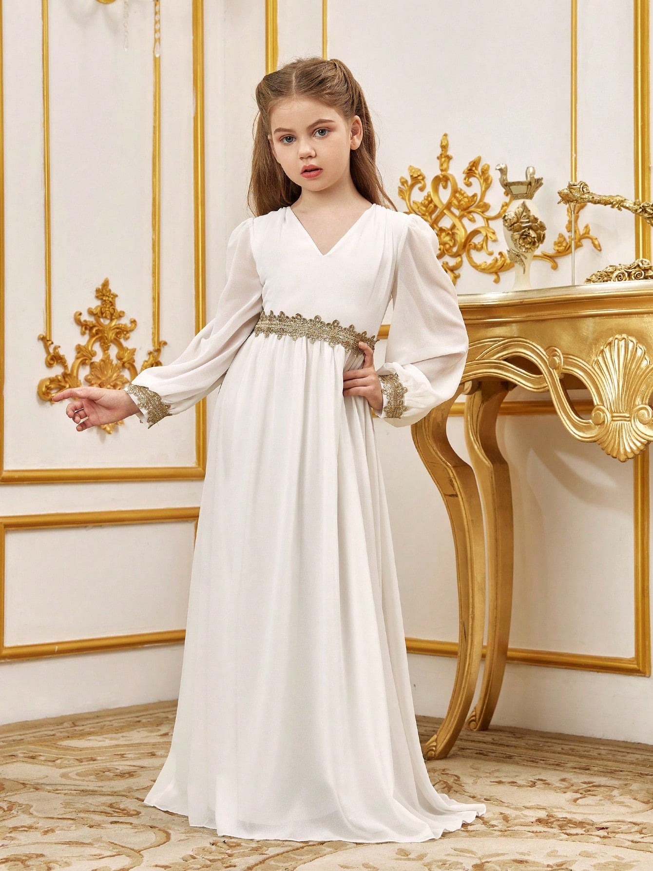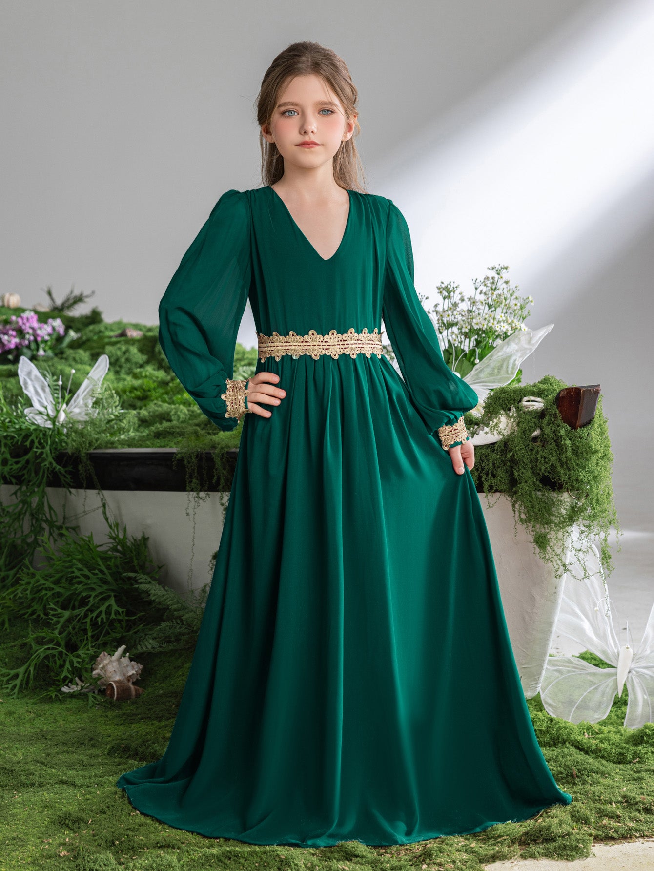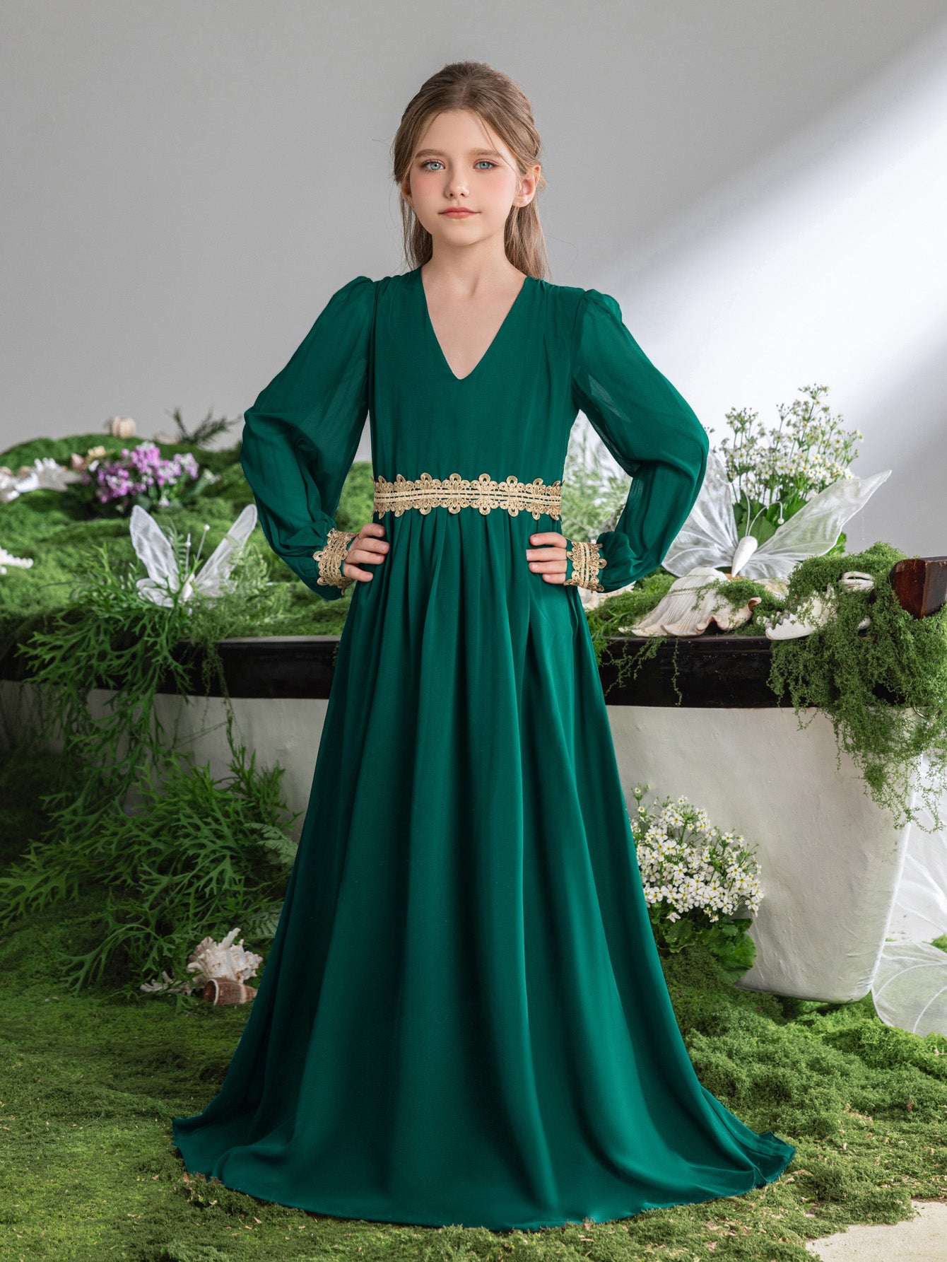 Tween Girls' Lace Trim Decoration V-neck Bishop Sleeves Chiffon Party Dress