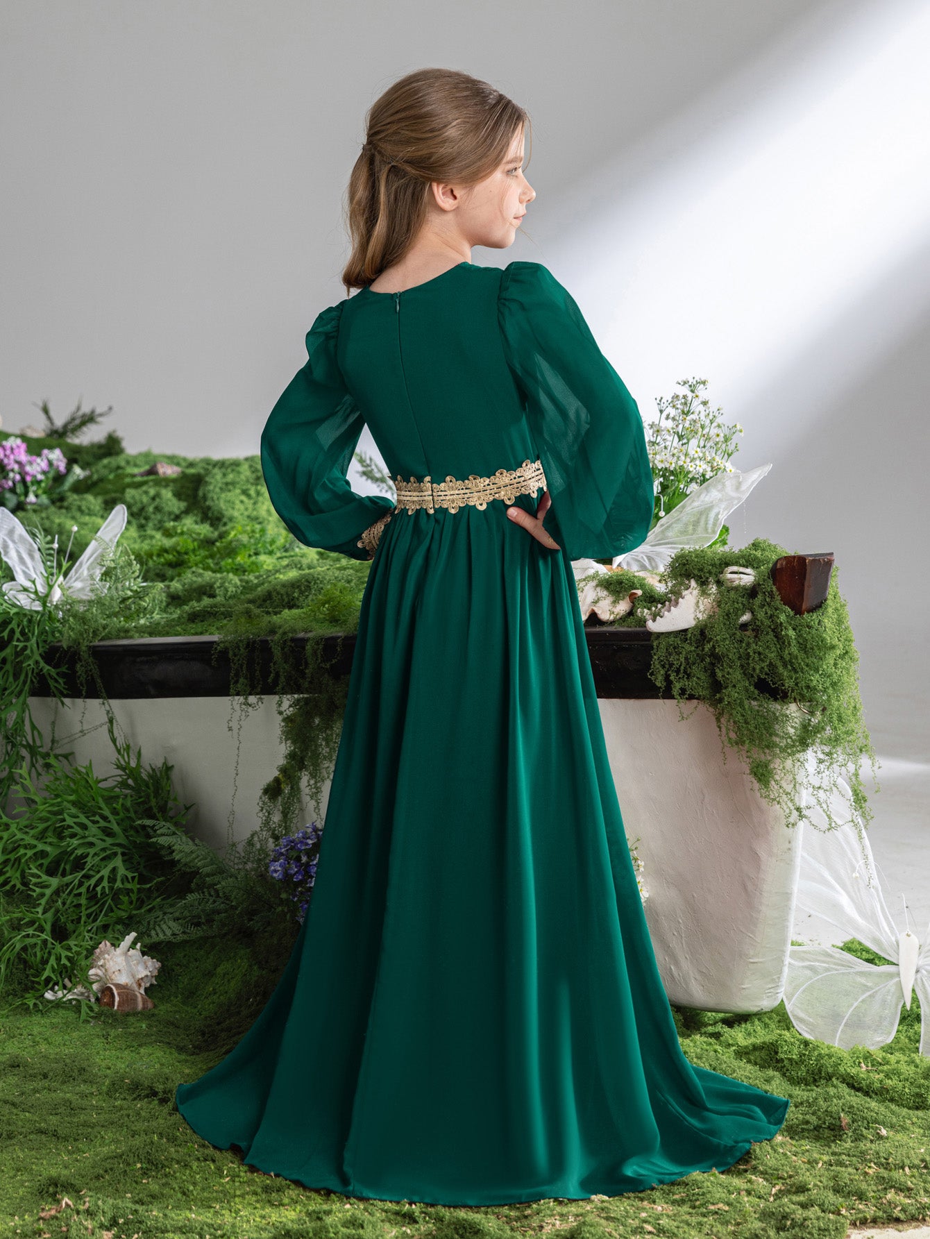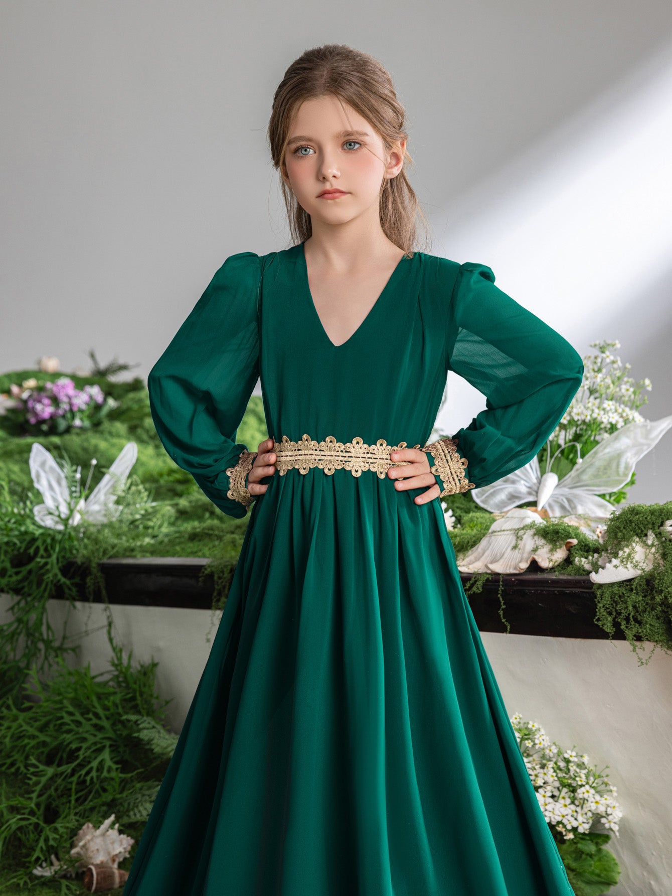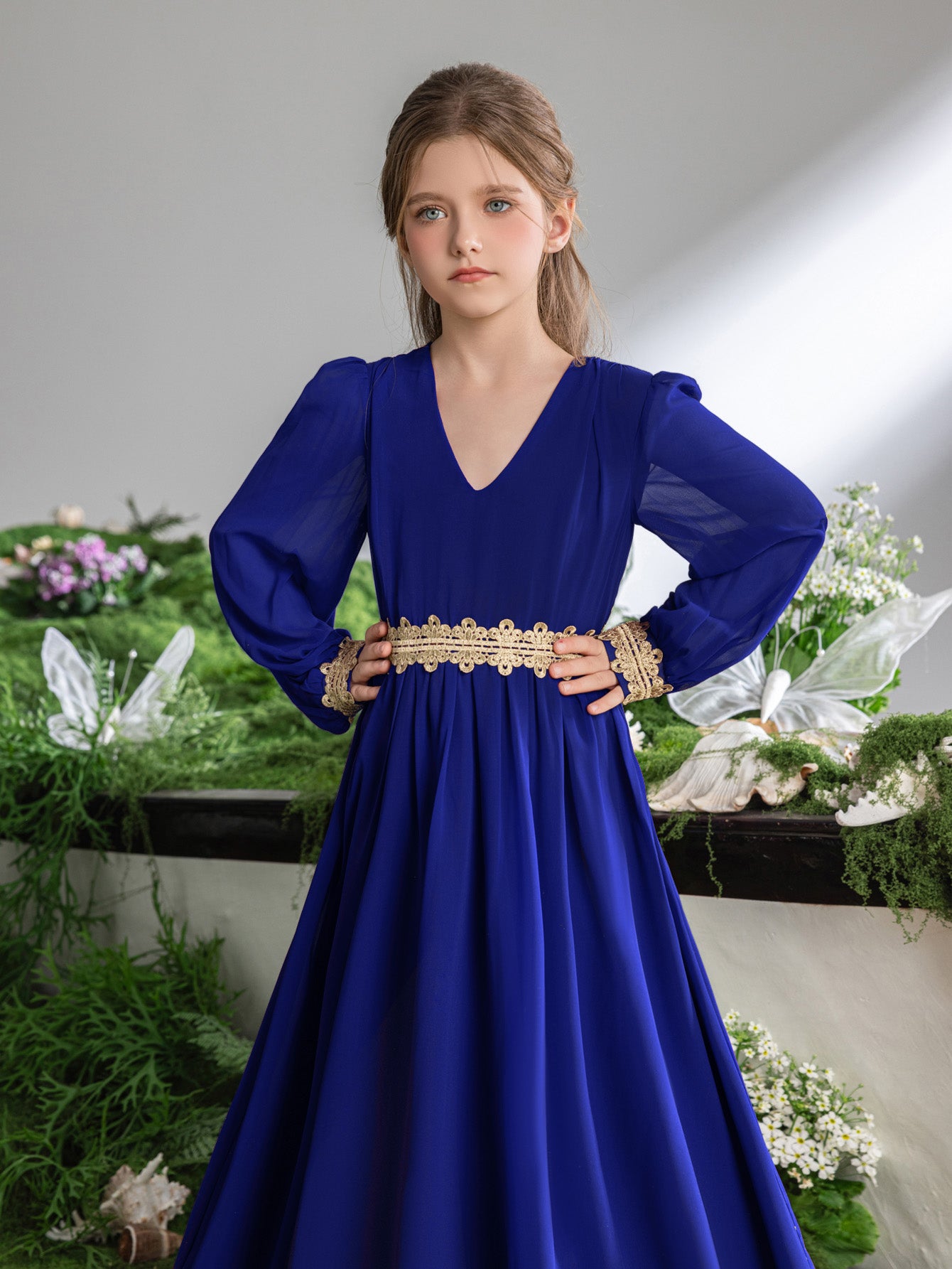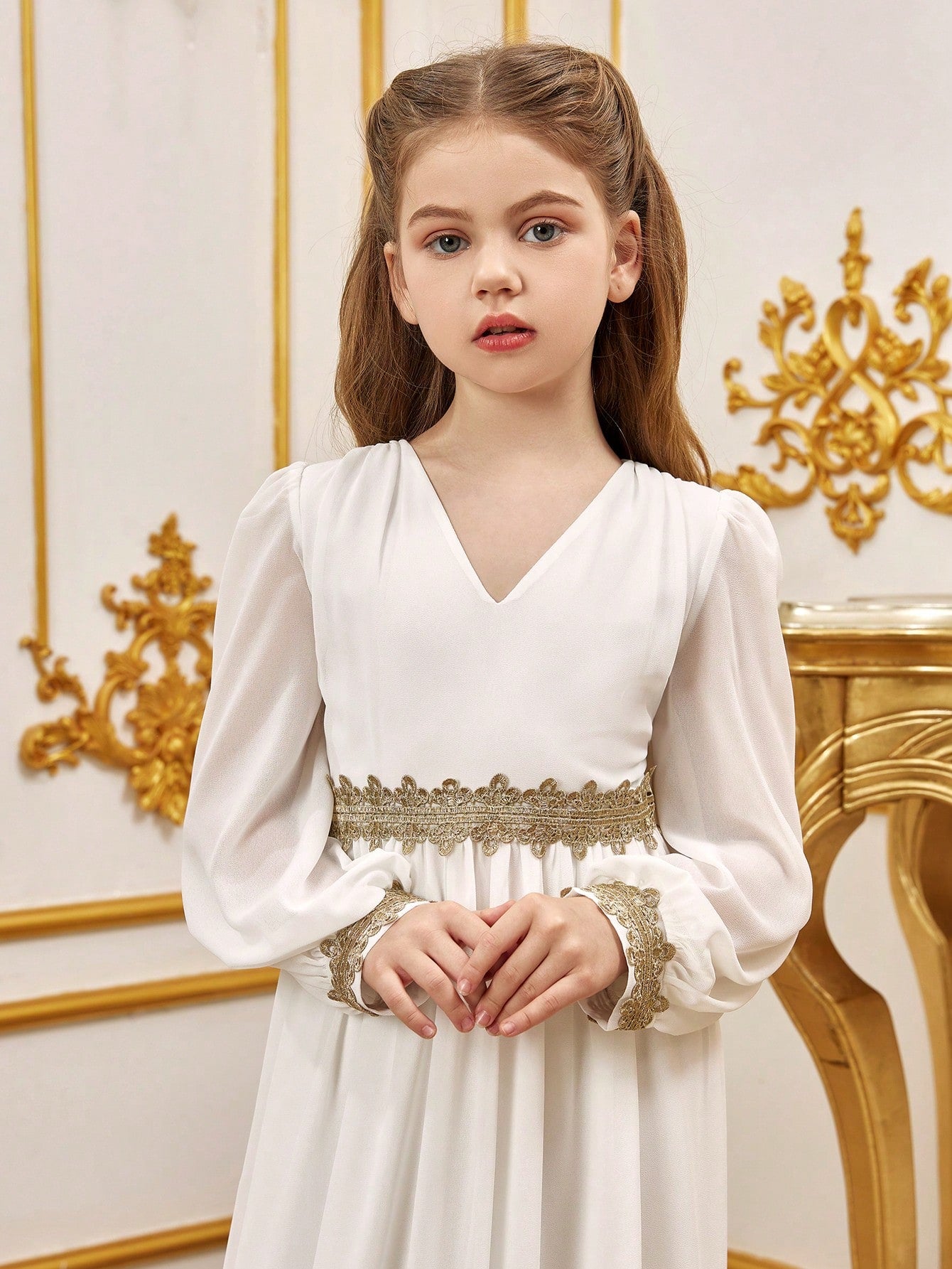 Tween Girls' Lace Trim Decoration V-neck Bishop Sleeves Chiffon Party Dress