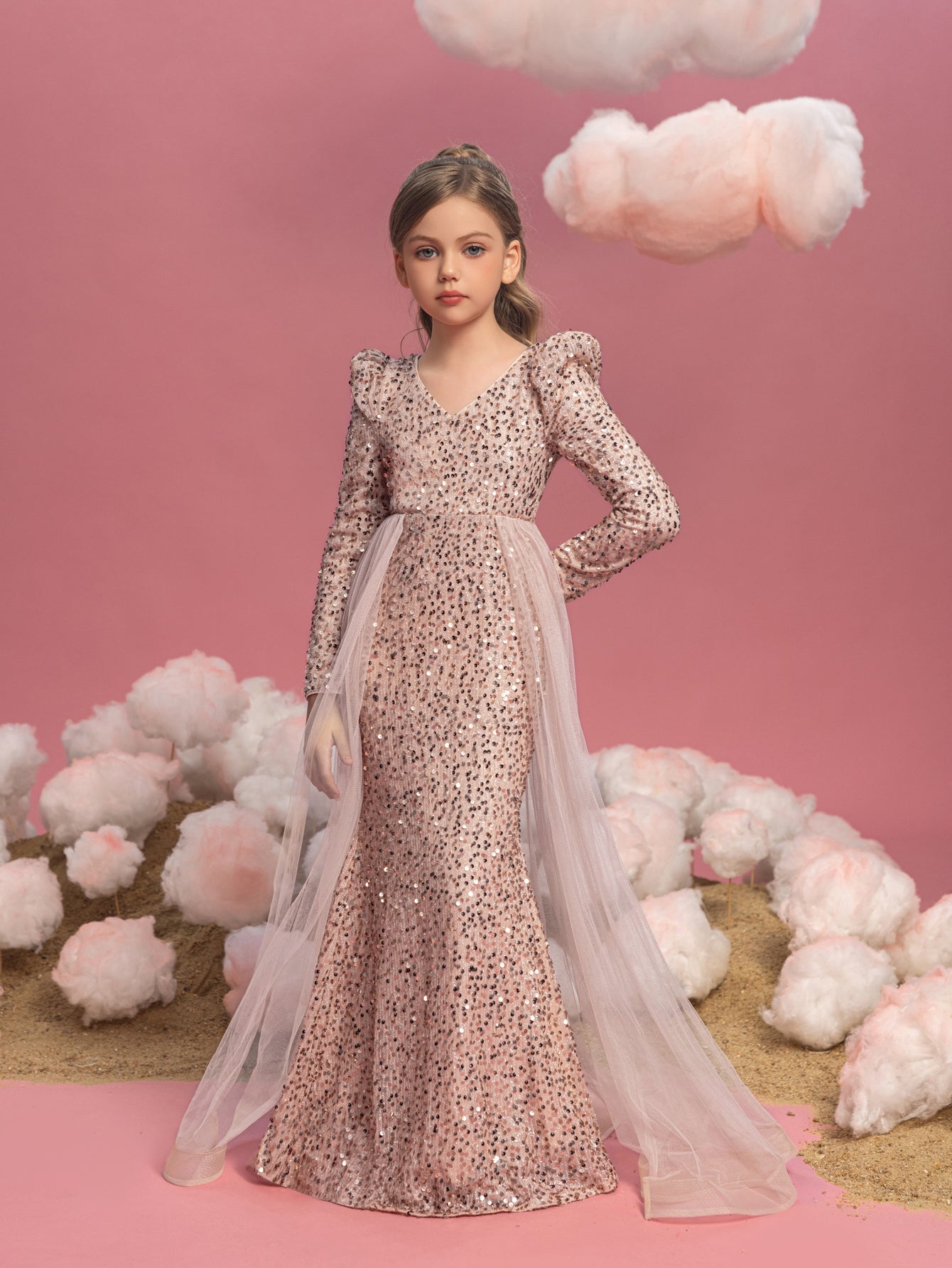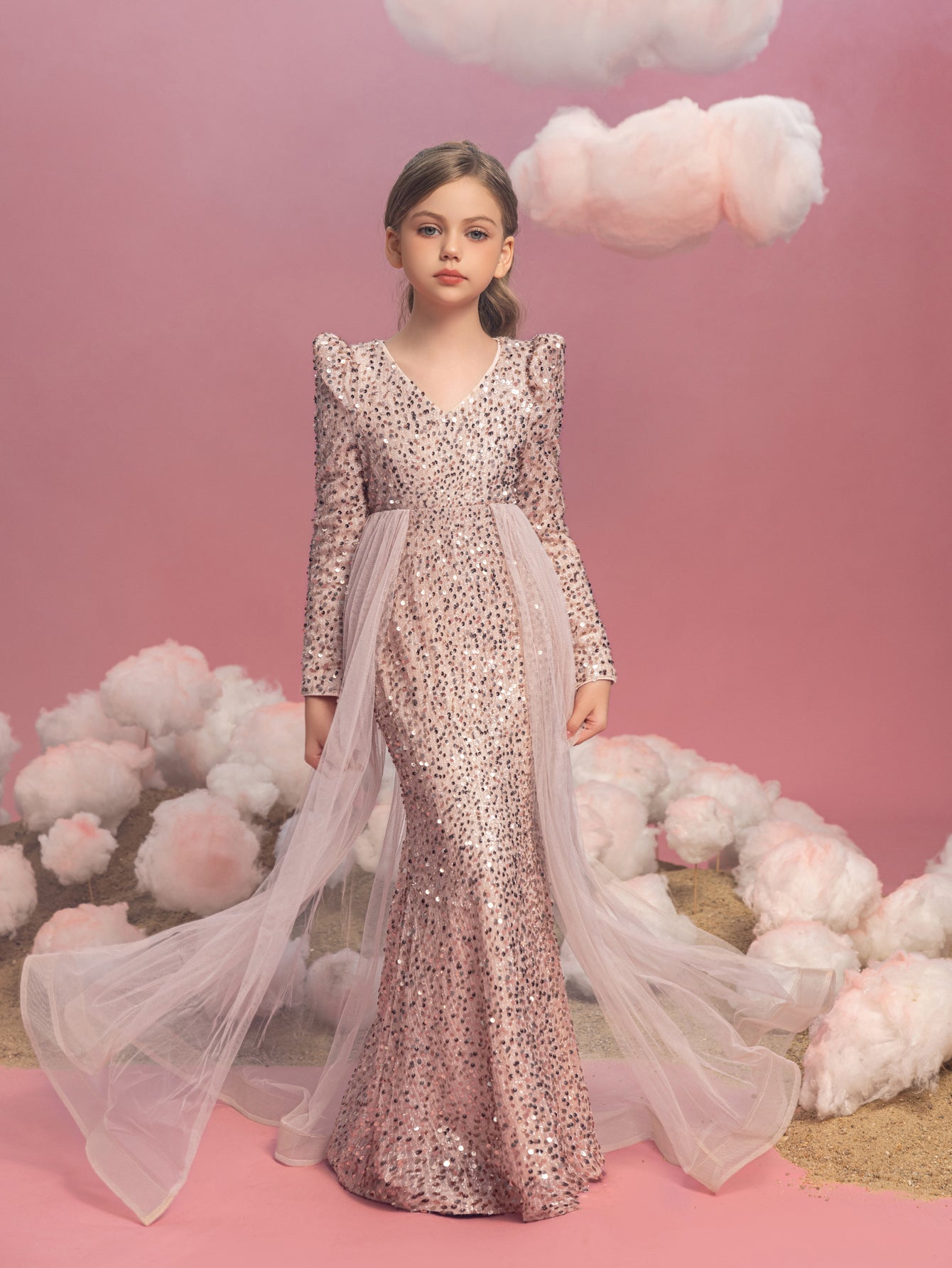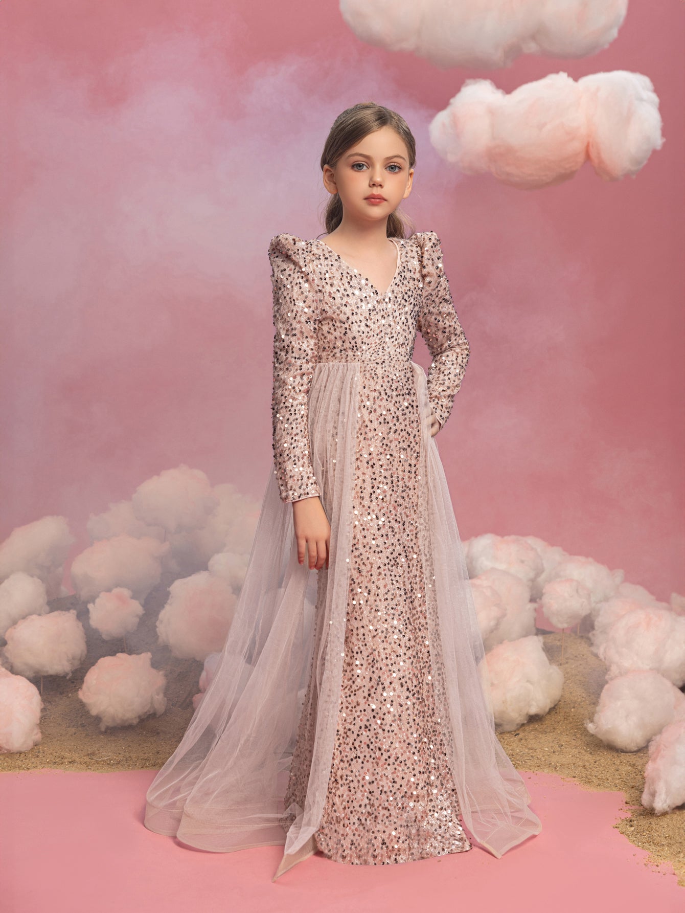 Step into a world of elegance and charm with our exquisite children's gown, designed to make every young girl feel like a princess. The gown features a V-neckline and a figure-flattering silhouette that flows gracefully to the floor, ensuring comfort and grace. The luxurious sequined fabric paired with delicate tulle creates a dreamy and glamorous look, enhanced by the intricate sequin details throughout the dress.