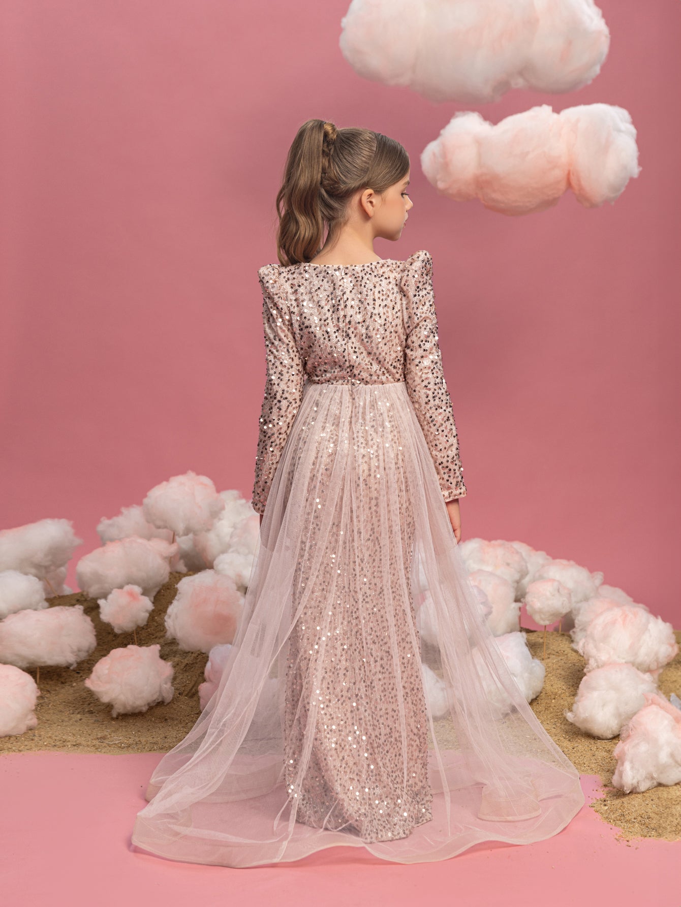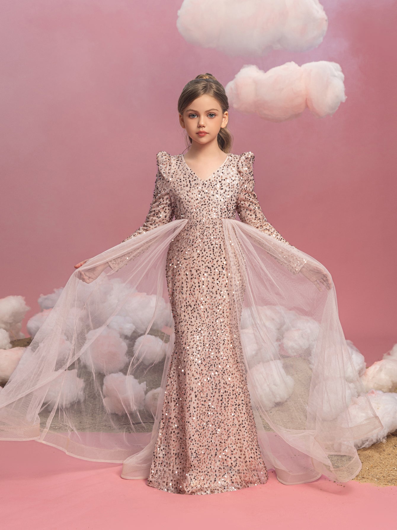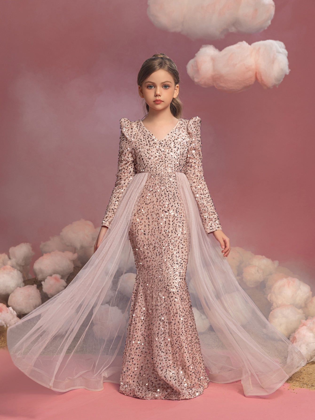 Step into a world of elegance and charm with our exquisite children's gown, designed to make every young girl feel like a princess. The gown features a V-neckline and a figure-flattering silhouette that flows gracefully to the floor, ensuring comfort and grace. The luxurious sequined fabric paired with delicate tulle creates a dreamy and glamorous look, enhanced by the intricate sequin details throughout the dress.