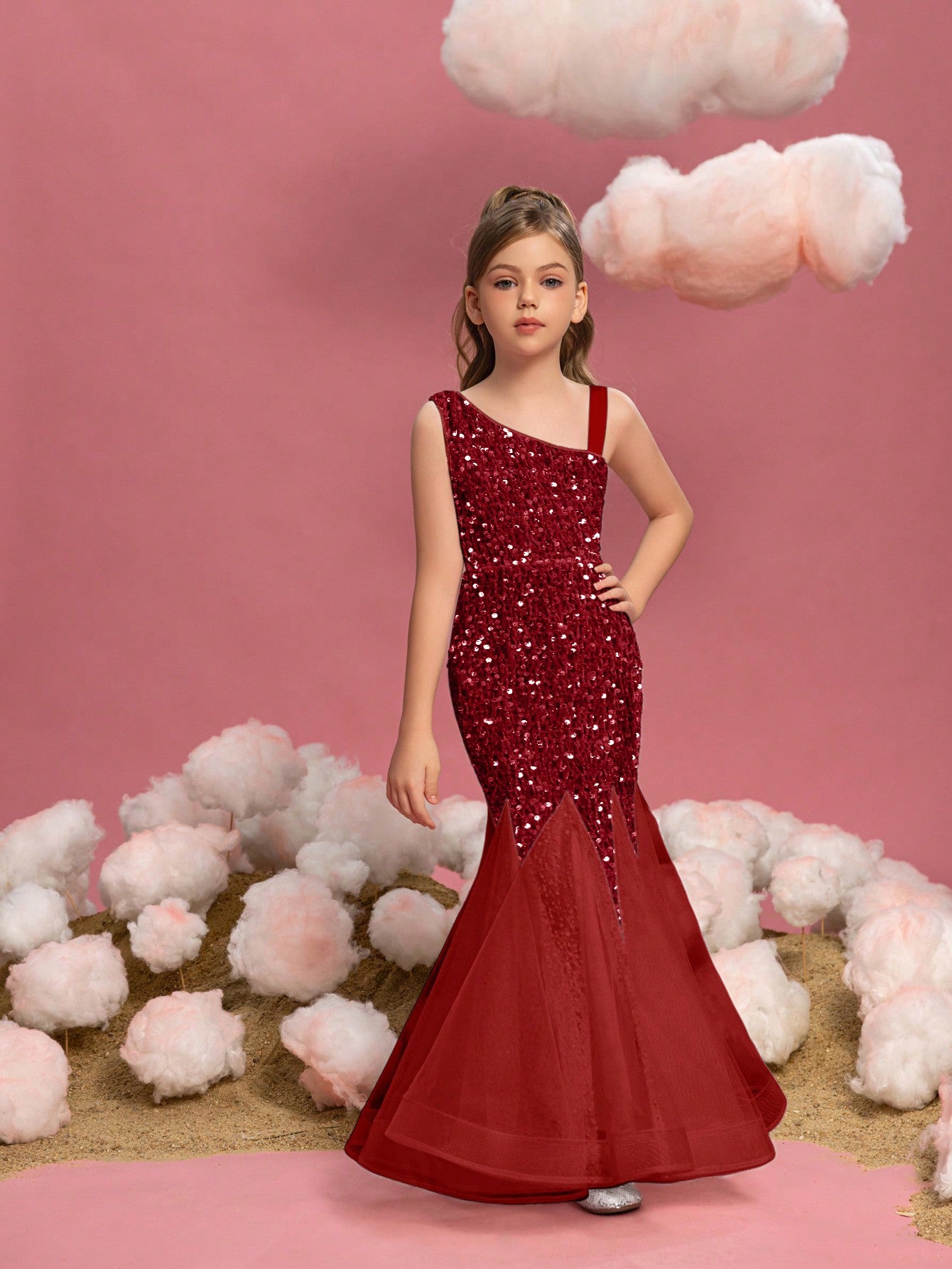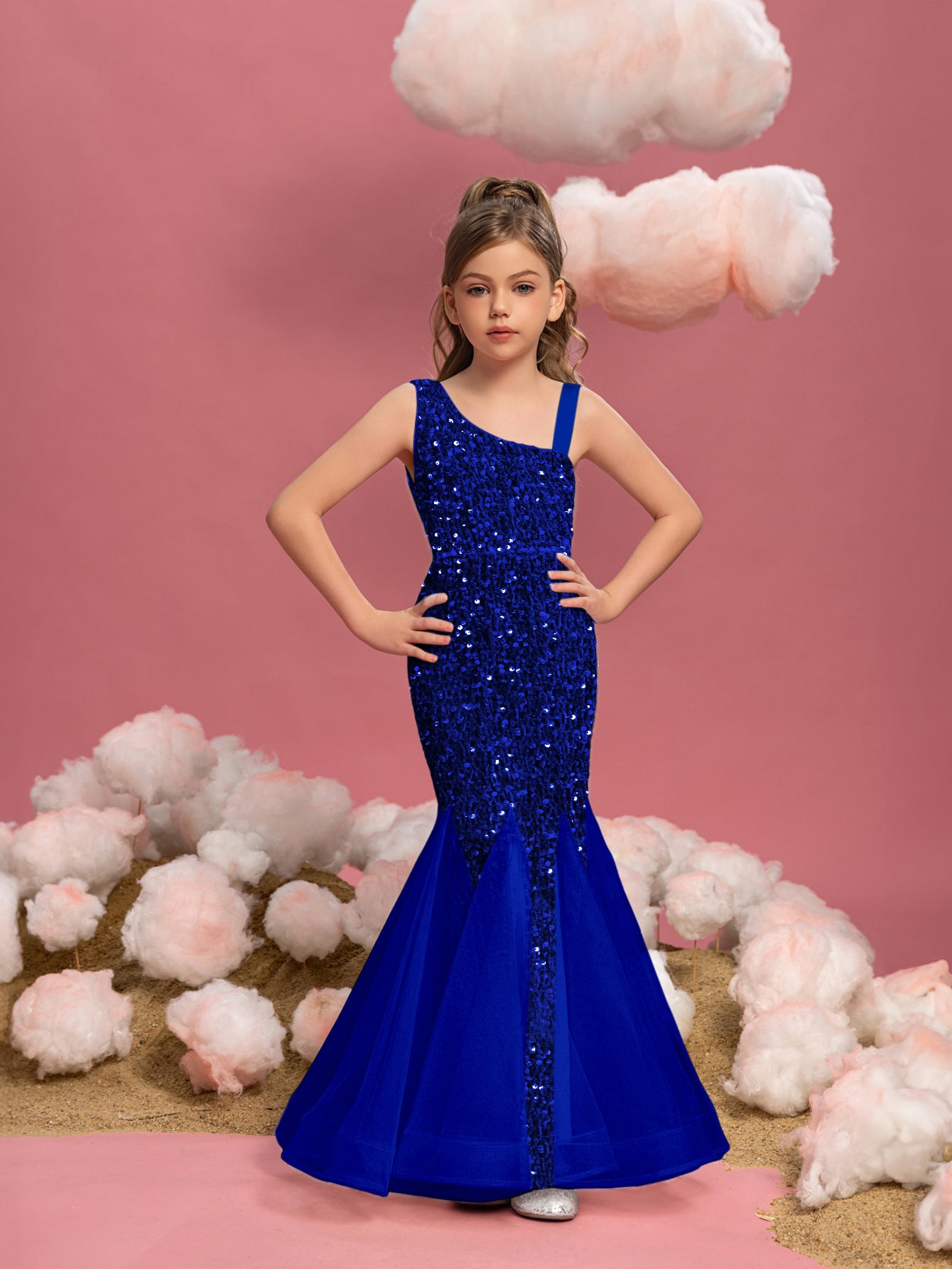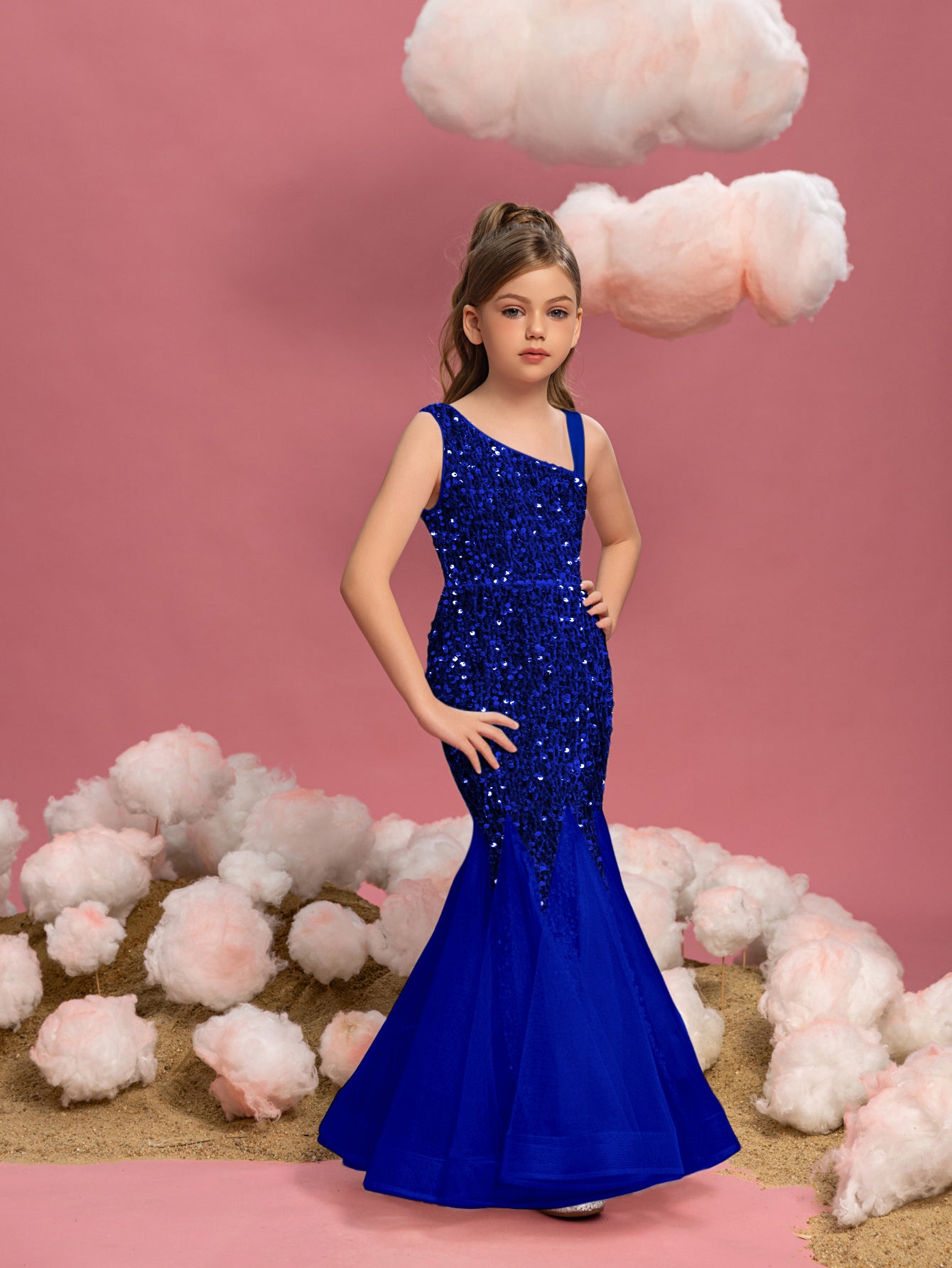 Captured in this dress is the enchantment of a whimsical tale, where every sequin is a note in an ode to the merriment of childhood soirees. The form-fitting bodice flares into a flowing tulle train, giving the illusion of a fairy-tale gown, ready to make an unforgettable entrance. It's a delightful ensemble for those magical moments, be it a performance or a festive celebration, allowing the wearer to revel in the limelight and create unforgettable memories.