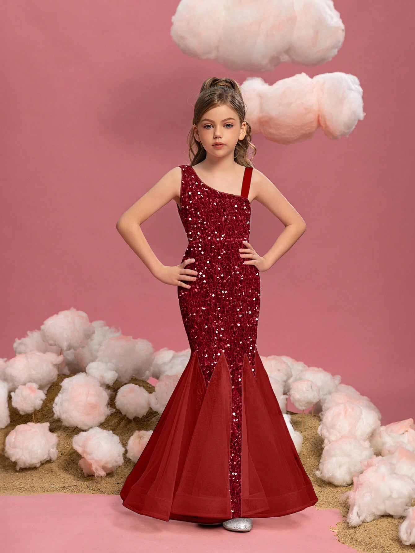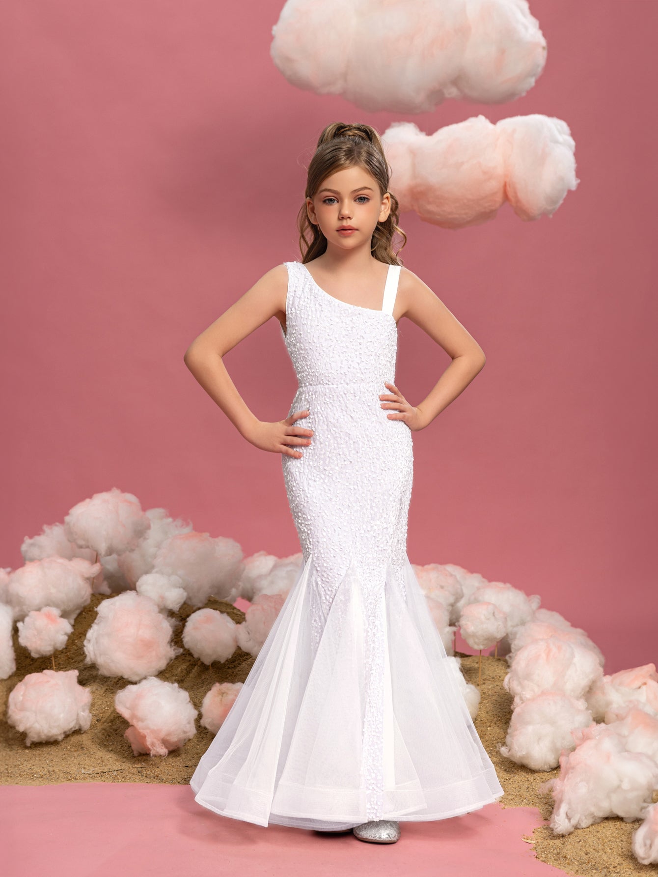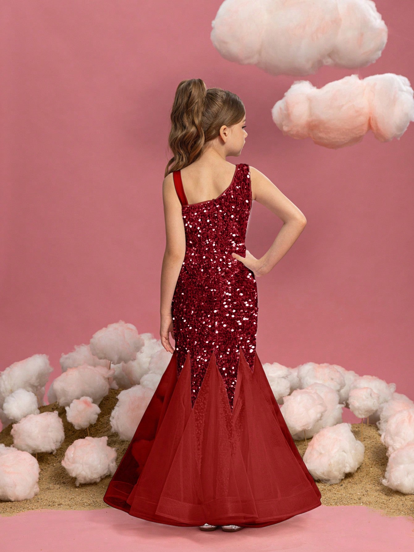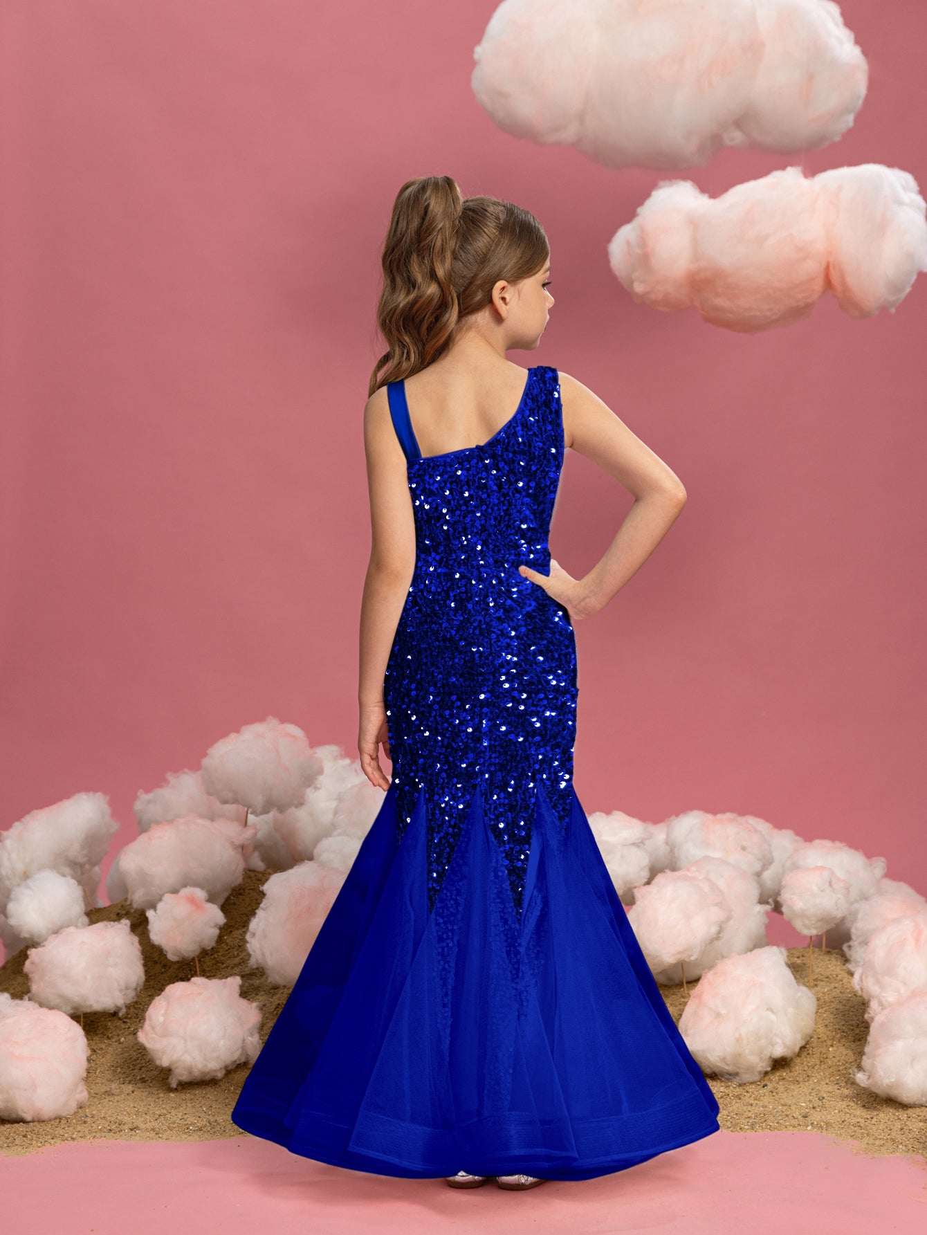 Captured in this dress is the enchantment of a whimsical tale, where every sequin is a note in an ode to the merriment of childhood soirees. The form-fitting bodice flares into a flowing tulle train, giving the illusion of a fairy-tale gown, ready to make an unforgettable entrance. It's a delightful ensemble for those magical moments, be it a performance or a festive celebration, allowing the wearer to revel in the limelight and create unforgettable memories.